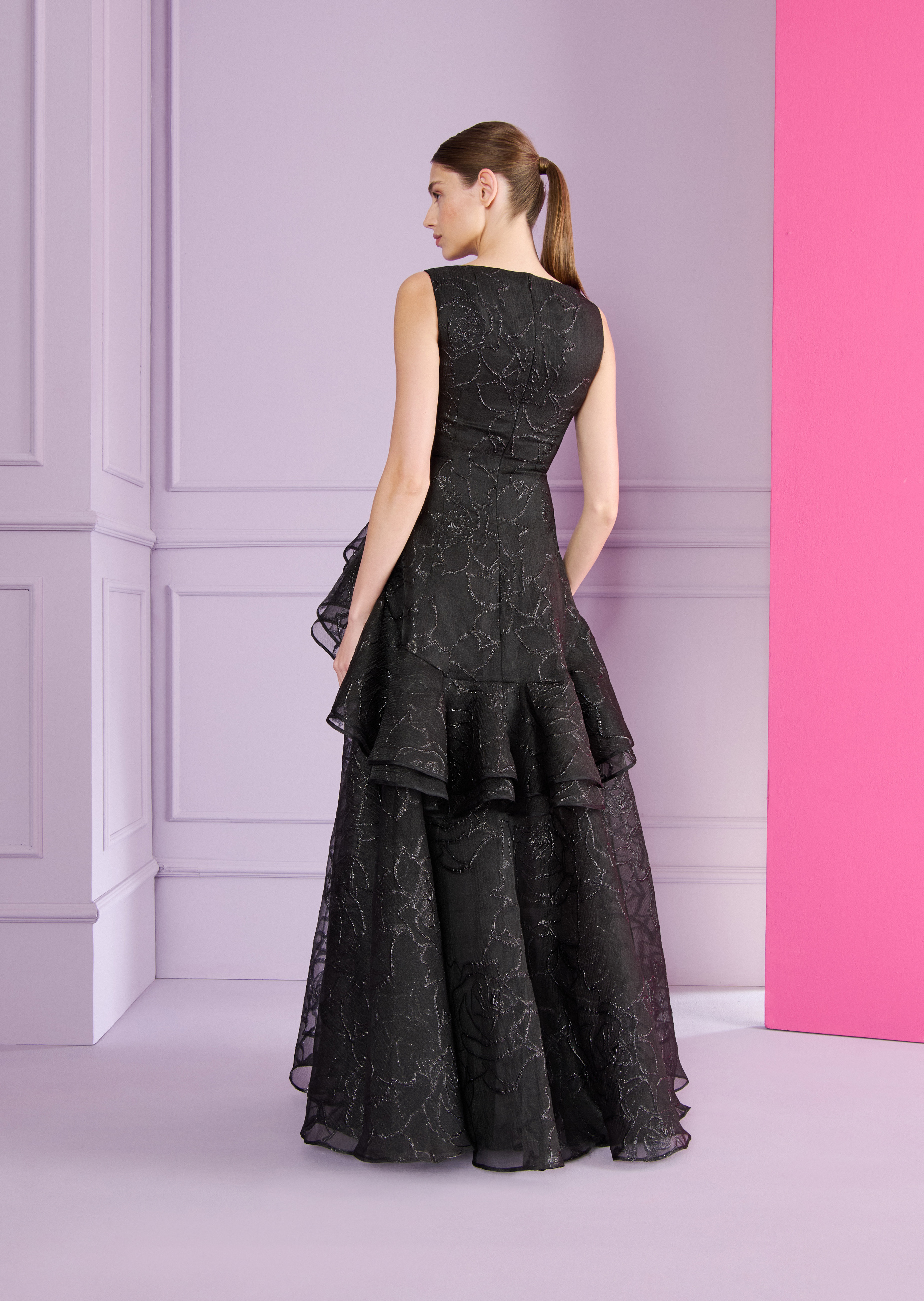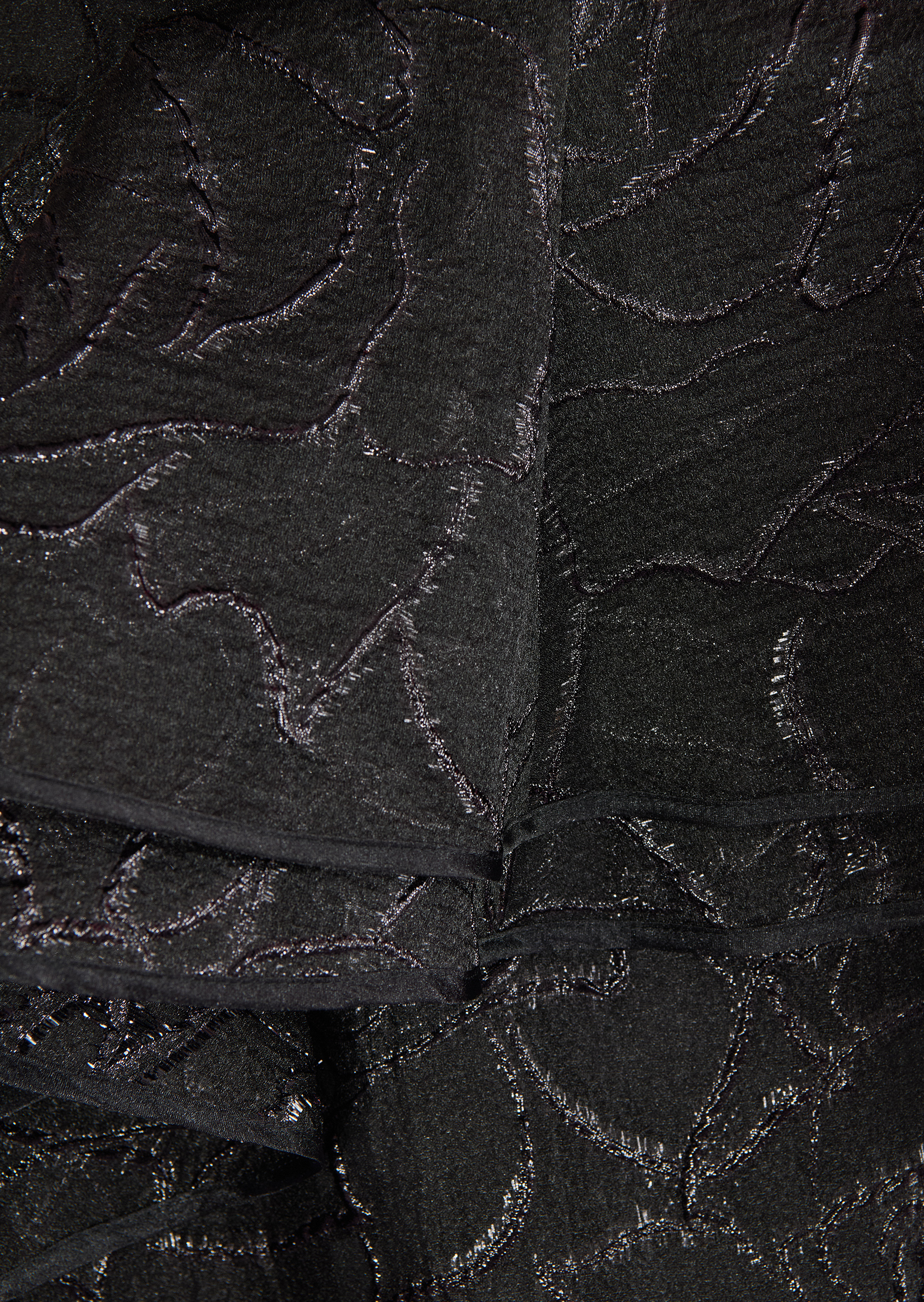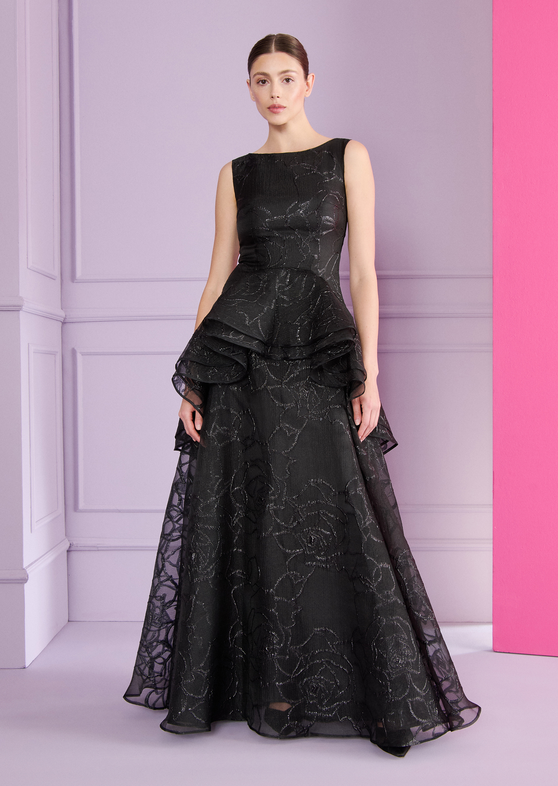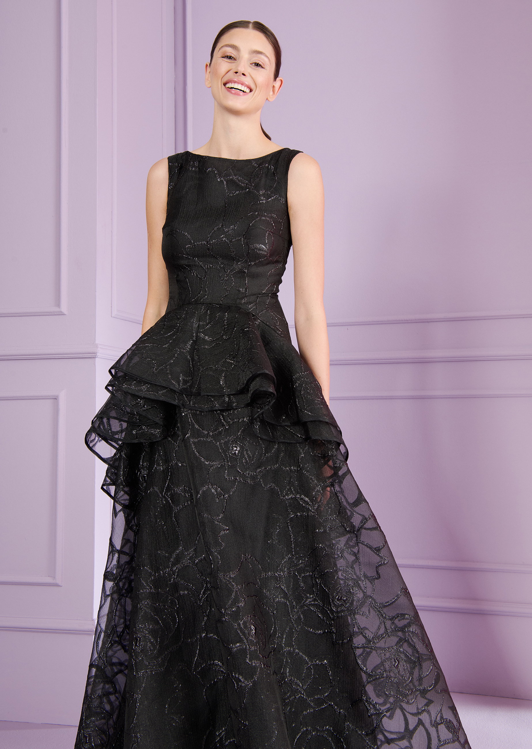 So weit, so gut! Und in diesem Fall meinen wir das wirklich ganz wörtlich: Unser neues Abendkleid, gefertigt aus einem federleichten Floral Fil Coupé, überrascht nämlich mit einer ganz besonderen, weiten Silhouette. Das Oberteil wirkt locker, definiert aber trotzdem die Figur. Unter dem Volant auf Hüfthöhe, das diesem Modell seinen Zweiteiler-Look verleiht, komm der weit schwingende, bodenlange Rock zum Vorschein, der natürlich auch sofort zum Tanzen einlädt. Die elegante U-Boot-Neckline rundet den zurückhaltend glamourösen Look dieses Abendkleids ab. Dieses Kleid tragen Sie mit Heels in moderater Höhe zum nächsten Ball, aber natürlich auch für einen extravaganten Auftritt mit markantem Schmuck auf dem nächsten roten Teppich.