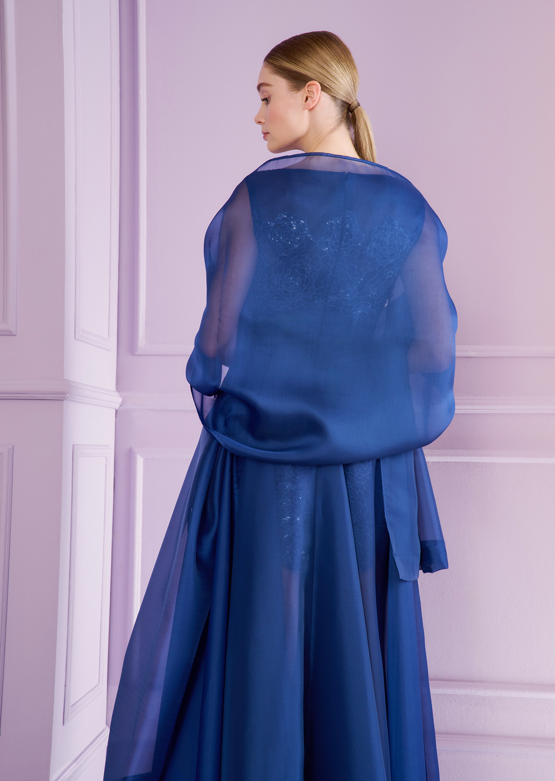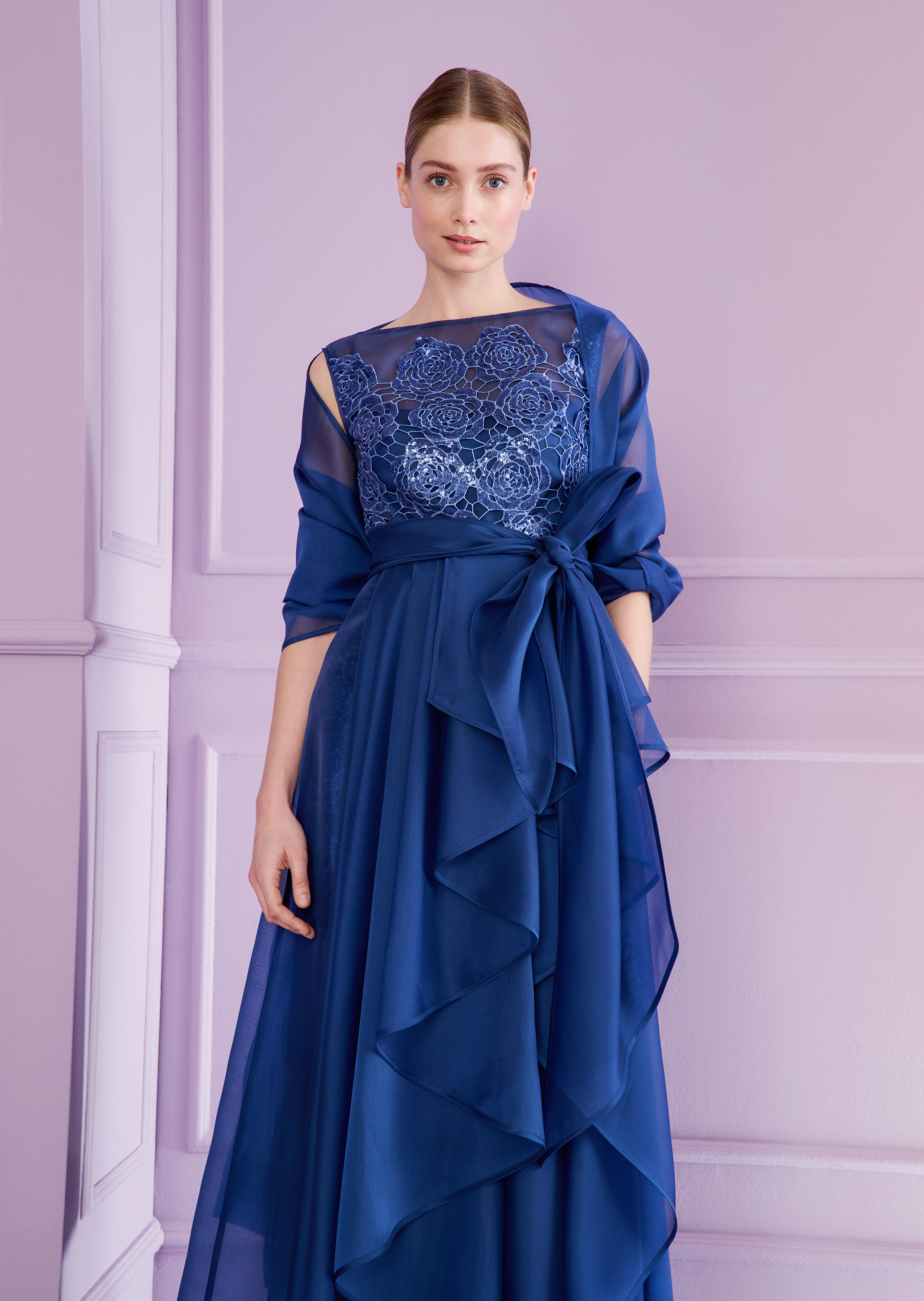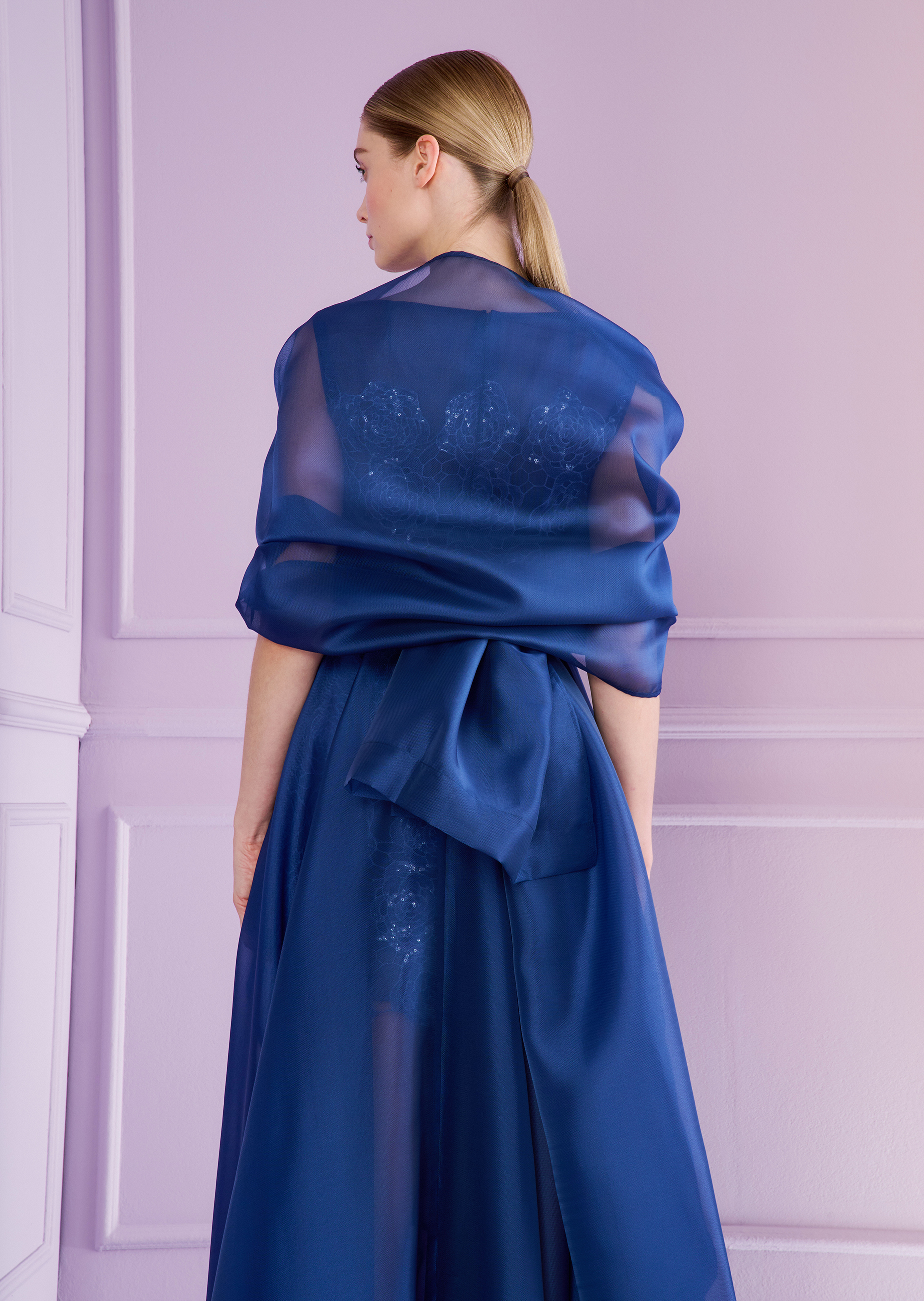 sanfter als unsere stola legt sich nur der arm ihres begleiters um ihre schultern: dieser schal aus leichtem Gazar Organza bietet ihnen schutz an lauen abenden, genauso dient er als accessoire auf der tanzfläche. dieses modell hat einfach flair — und das kommt in kombination mit einem passenden abendkleid besonders gut zur geltung. trotzdem ist unsere stola auch immer für einen soloauftritt zu schlichteren looks zu haben.