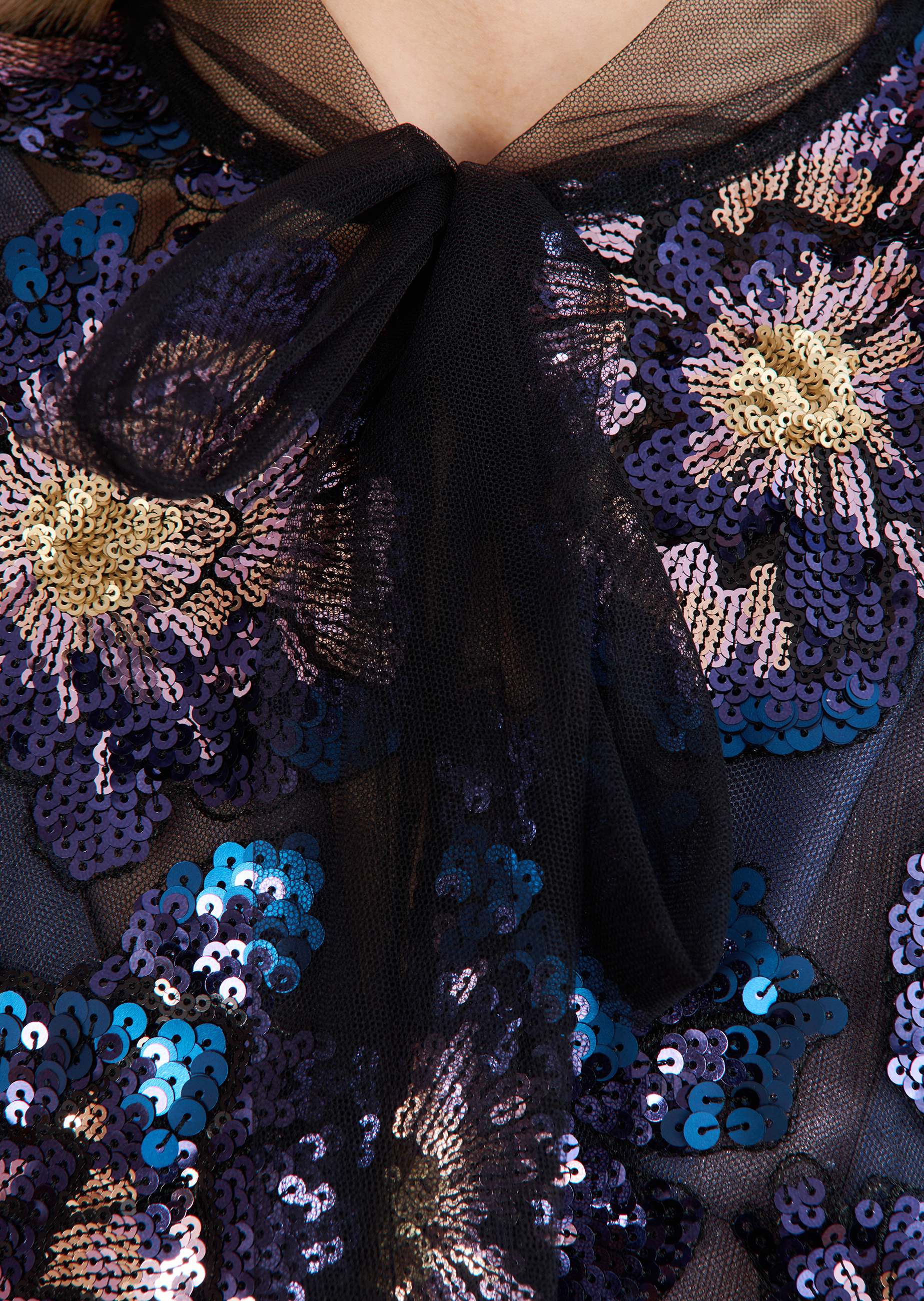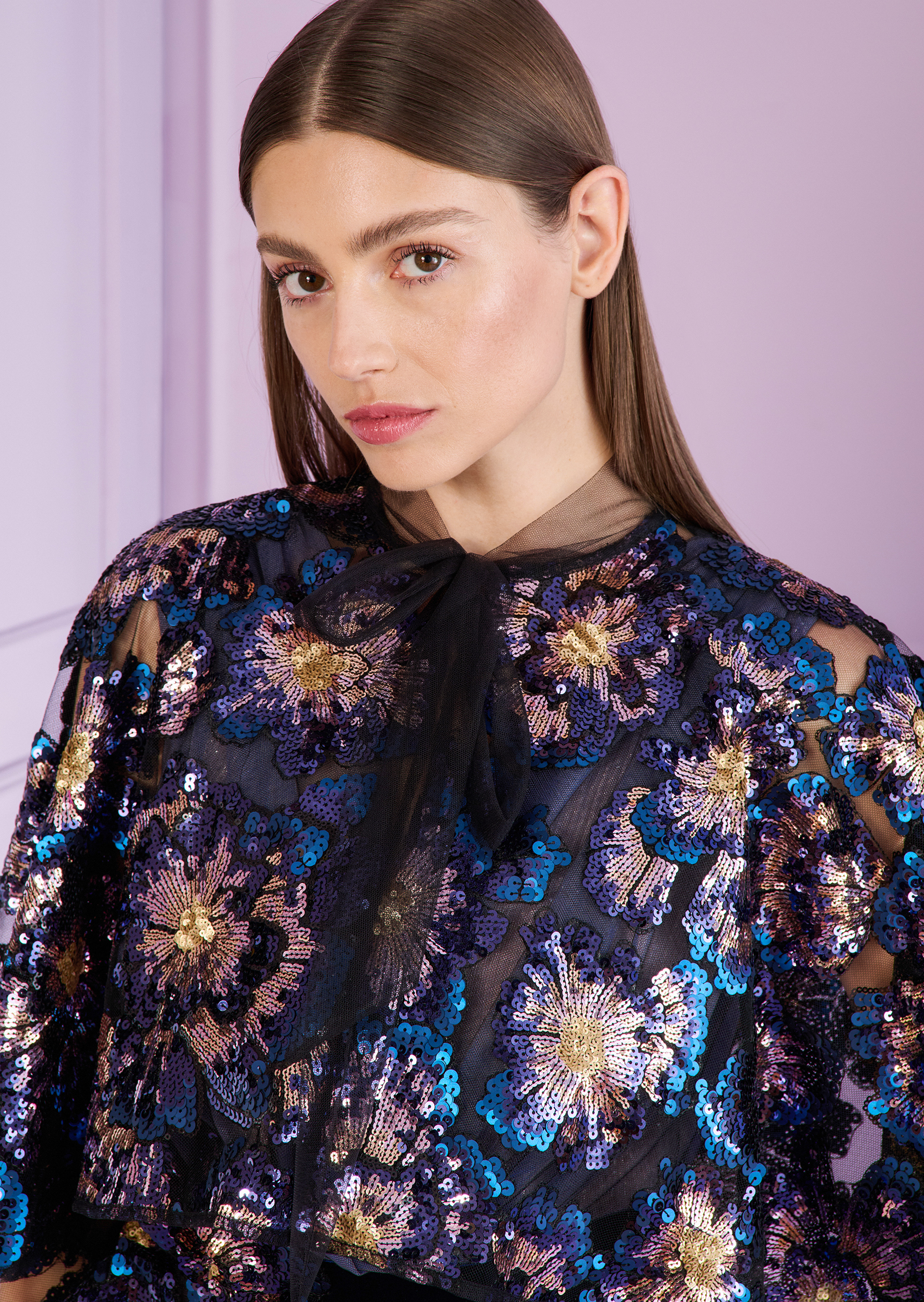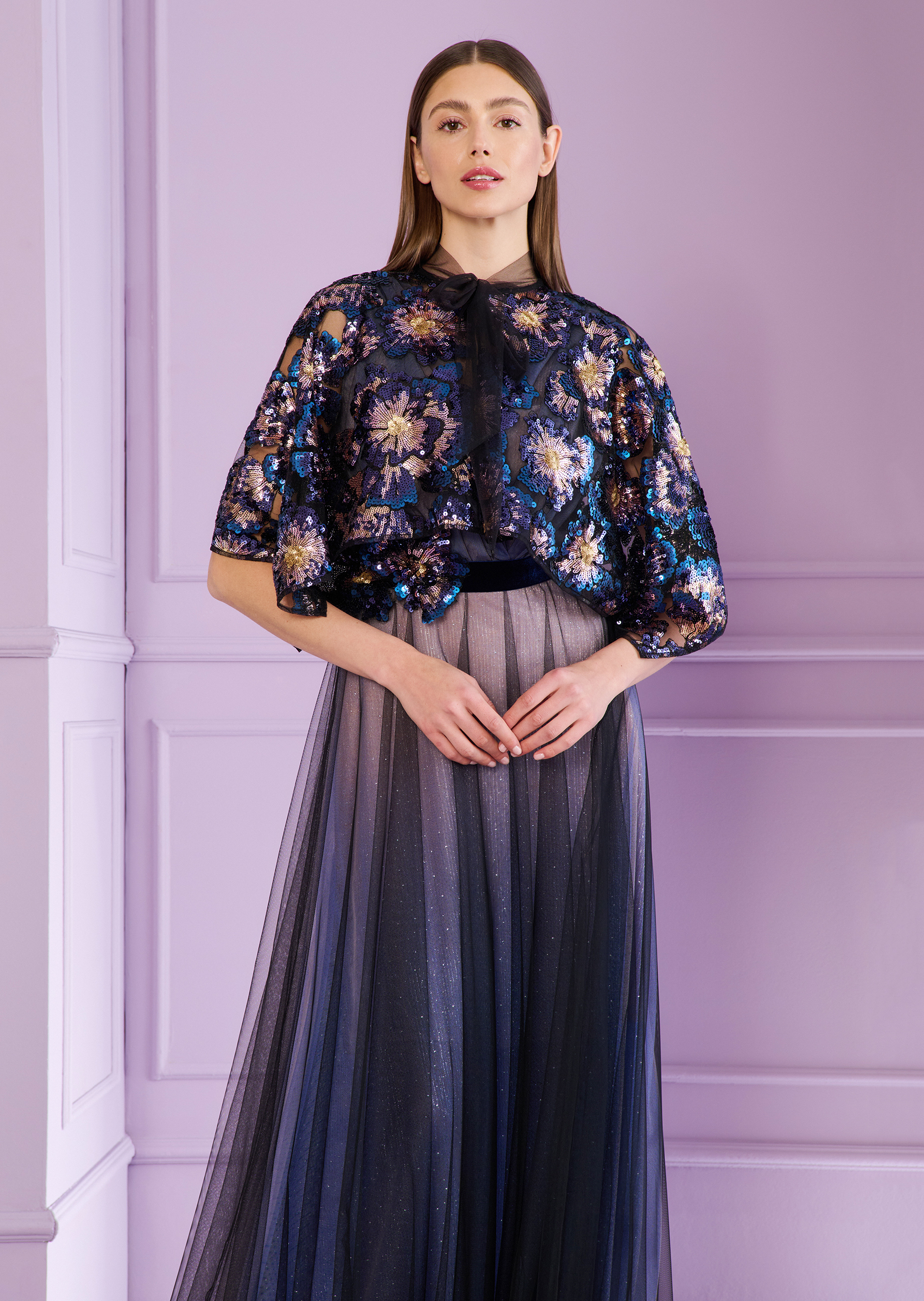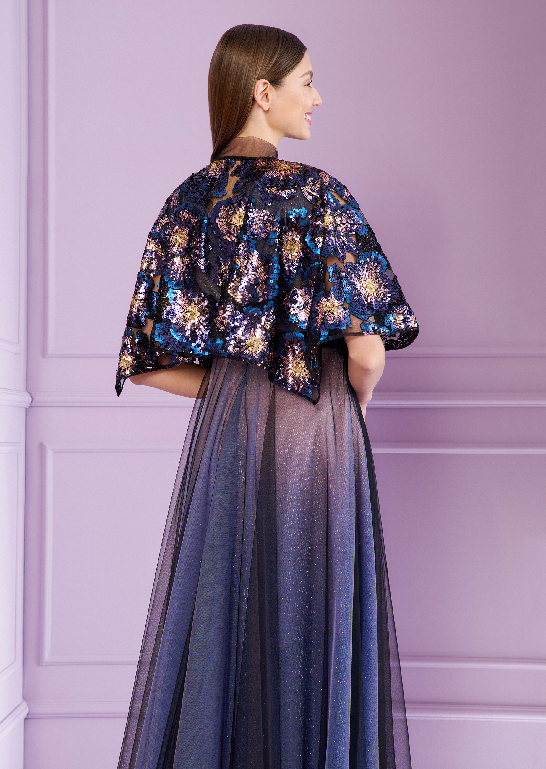 Unser kurzes Bolero-Cape aus funkelnder Paillettenware mit floralem Muster versprüht pure Retro-Glamour. Zart legt es sich über die Schultern und wird vorne mit einer verspielten Tüllschleife gebunden. So bedeckt es nicht nur stilvoll die Arme, wenn Sie ein ärmelloses Abendkleid tragen, sondern setzt gleichzeitig ein aufregendes modisches Statement – ein toller Eyecatcher für die nächste Gala!