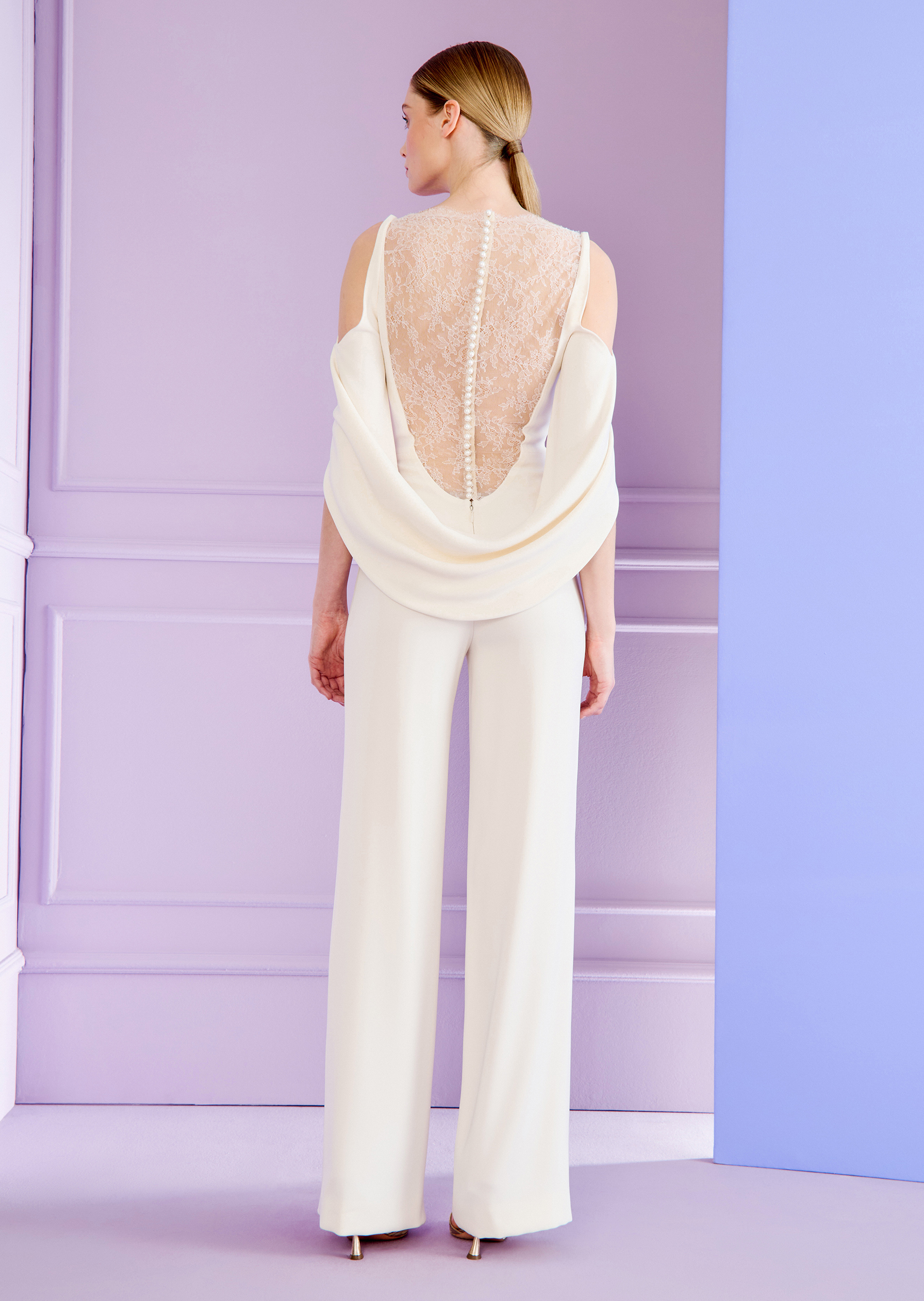 “Yes, I do!” – but in style and comfort, please: Why not do it differently for a change? Say “I do” in a jumpsuit and prove that femininity and romance can also come in the form of a pants look. Our bridal jumpsuit combines the relaxed elegance of a pants outfit with the enchanting details of a classic dream gown. The back is made of delicate lace, revealing a subtle glimpse of the skin underneath. Meanwhile, the flowing infinity sleeves with romantic shoulder cut-outs add a touch of drama. Otherwise, the look remains excitingly straightforward with a high-necked bateau neckline, a slim-fitting waist and a straight-cut leg. An outfit as special as your big day – and one in which you will not only shine at the altar, but in which you can also dance in comfort well into your wedding night.