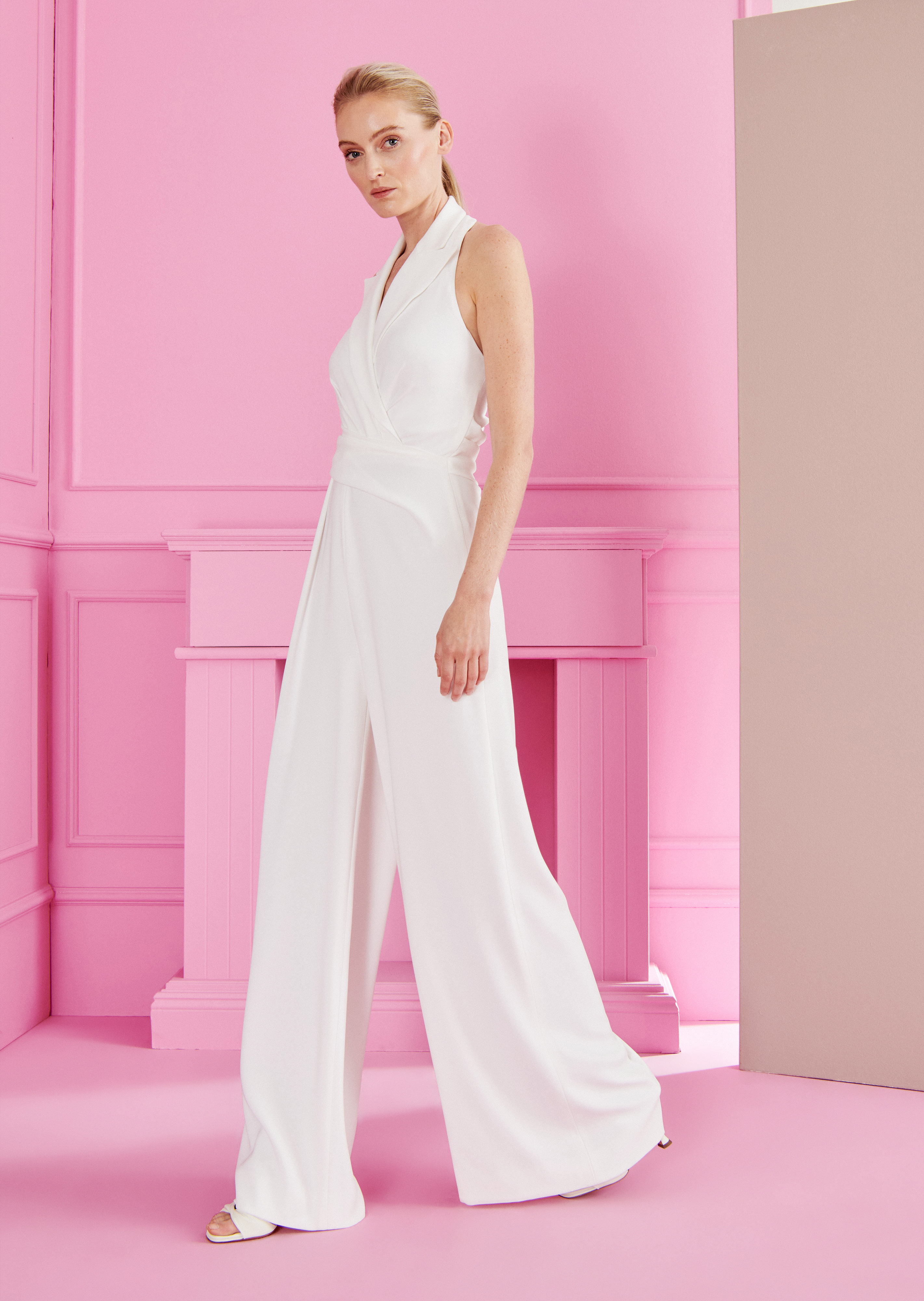 How about a hot date – with our new jumpsuit! It boasts lots of sexy details without overdoing it. It plays with subtly. Attention is drawn to the otherwise subtle décolleté by the lapel collar. The halterneck design draws attention to the shoulders, while the back remains free and is likewise accentuated nicely. Draped folds conjure up a slim waist. This makes the jumpsuit a unique, striking piece for a wedding or a cocktail event during the film festival.