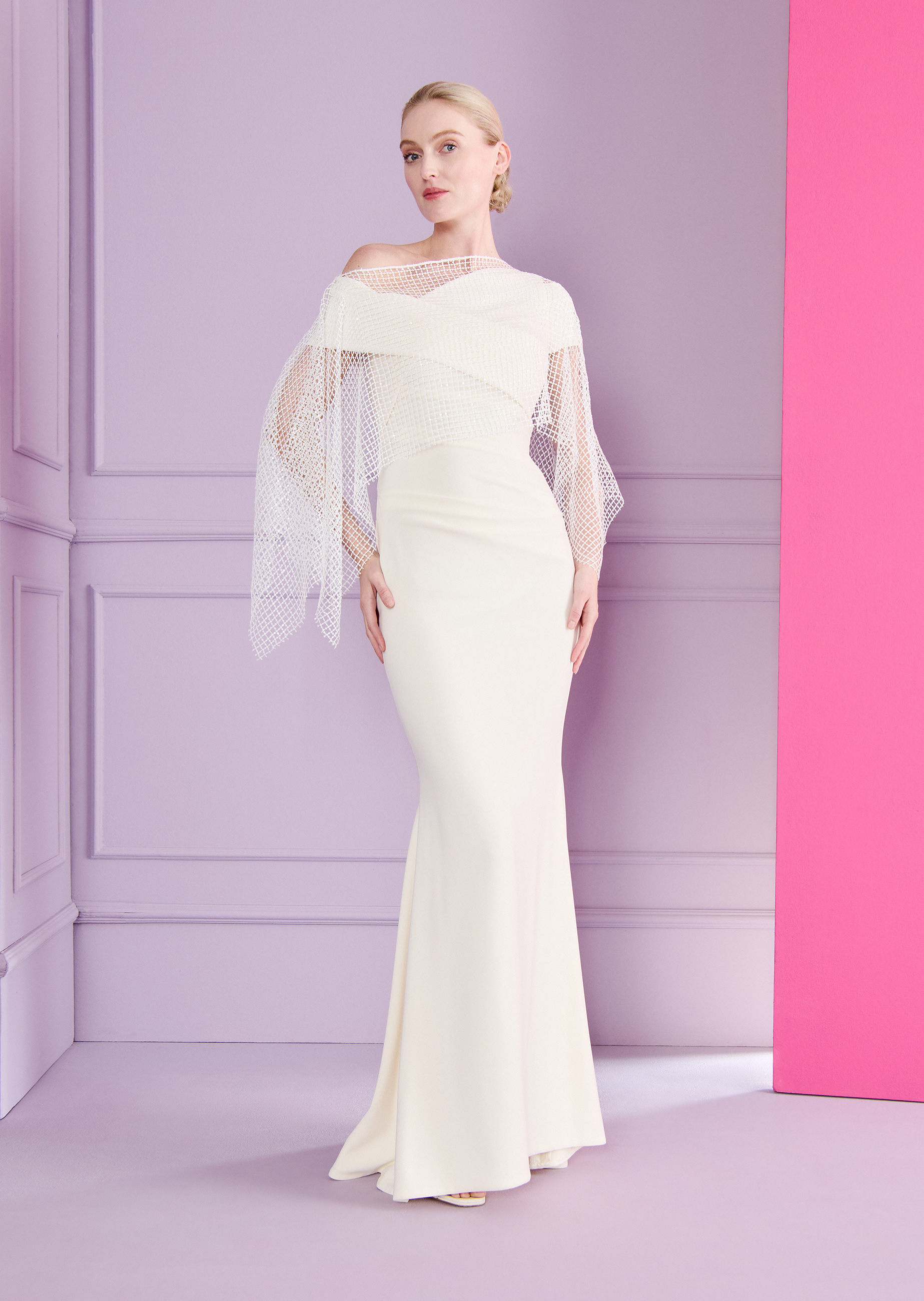 modern and yet still feminine: that’s exactly the kind of statement our dress bozza2 makes; perfect for the effortlessly casual city wedding. you’ll also be perfectly dressed for the church; the drapery takes care of that through the playful and subtle sex appeal of free shoulders while still remaining reserved and adequate. the material, a triacetate crepe, flows especially beautifully and feels amazing on your skin, so that you can simply spend the time enjoying your big day. the typical talbot runhof drapery and the fishtail skirt effortlessly define your silhouette. no matter if you’re celebrating at a hip city loft, or at a michelin star restaurant for the wedding dinner, your guests are sure to congratulate you, not only on your nuptials, but also on your modern look.