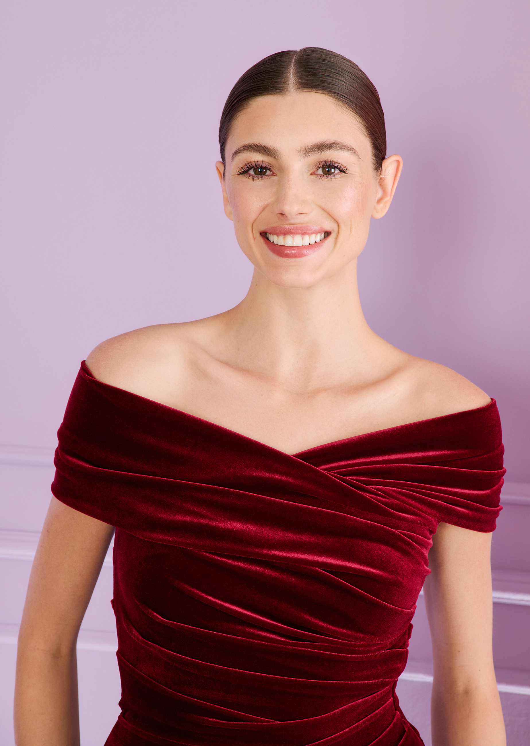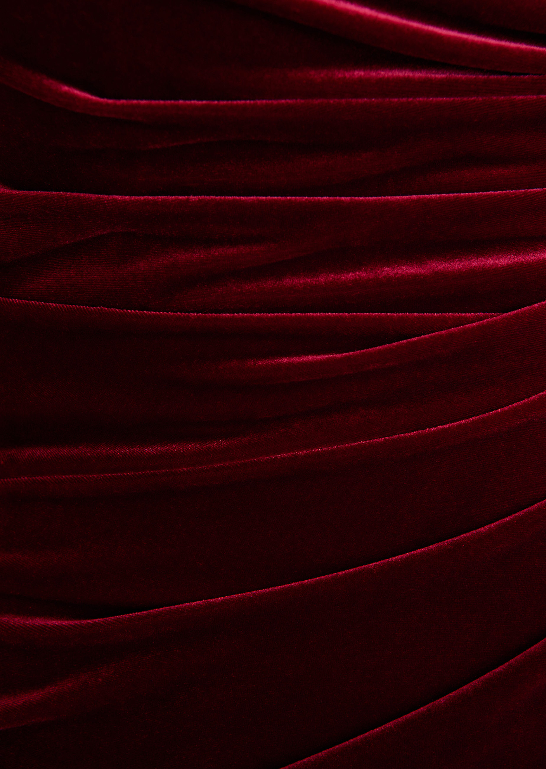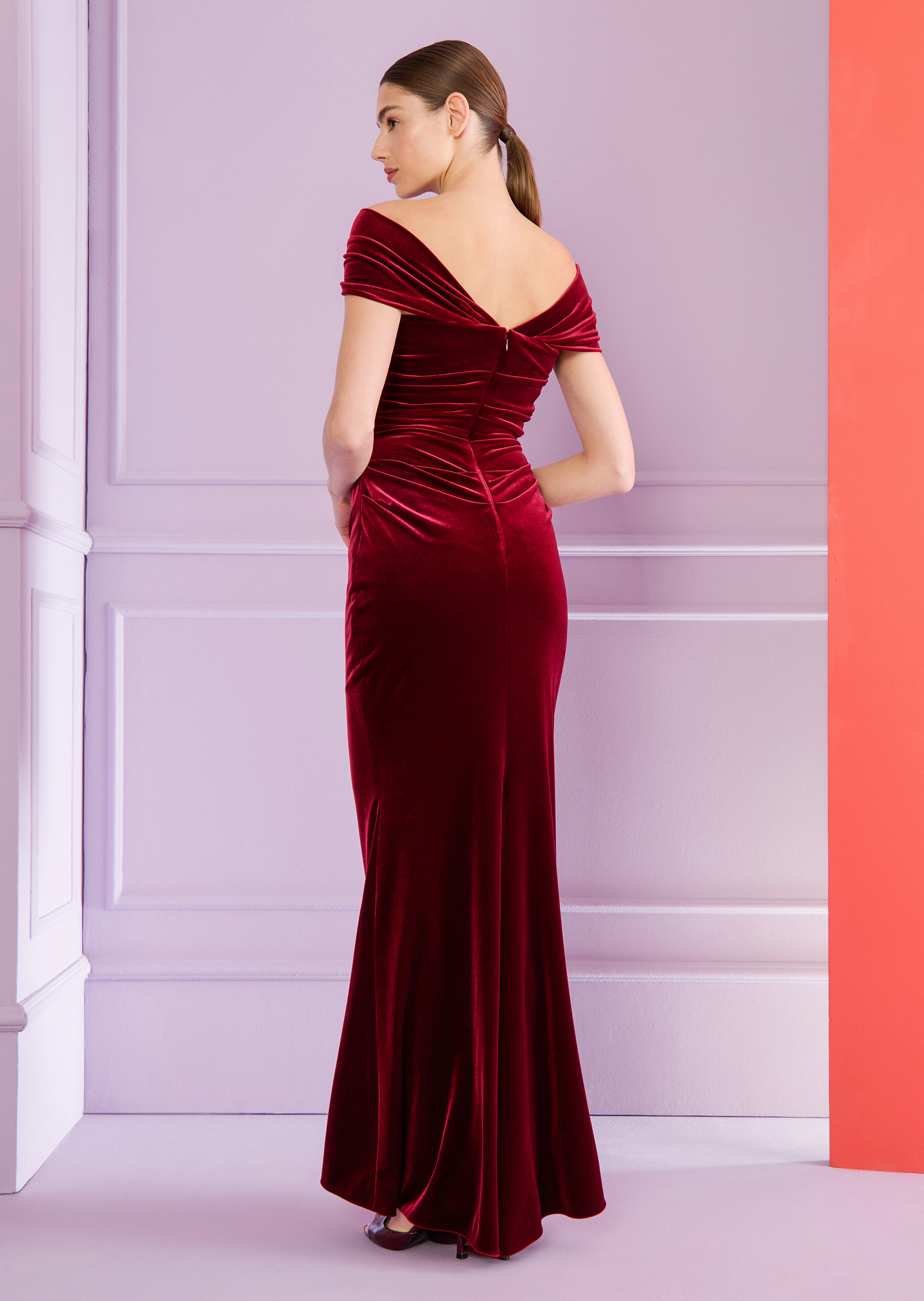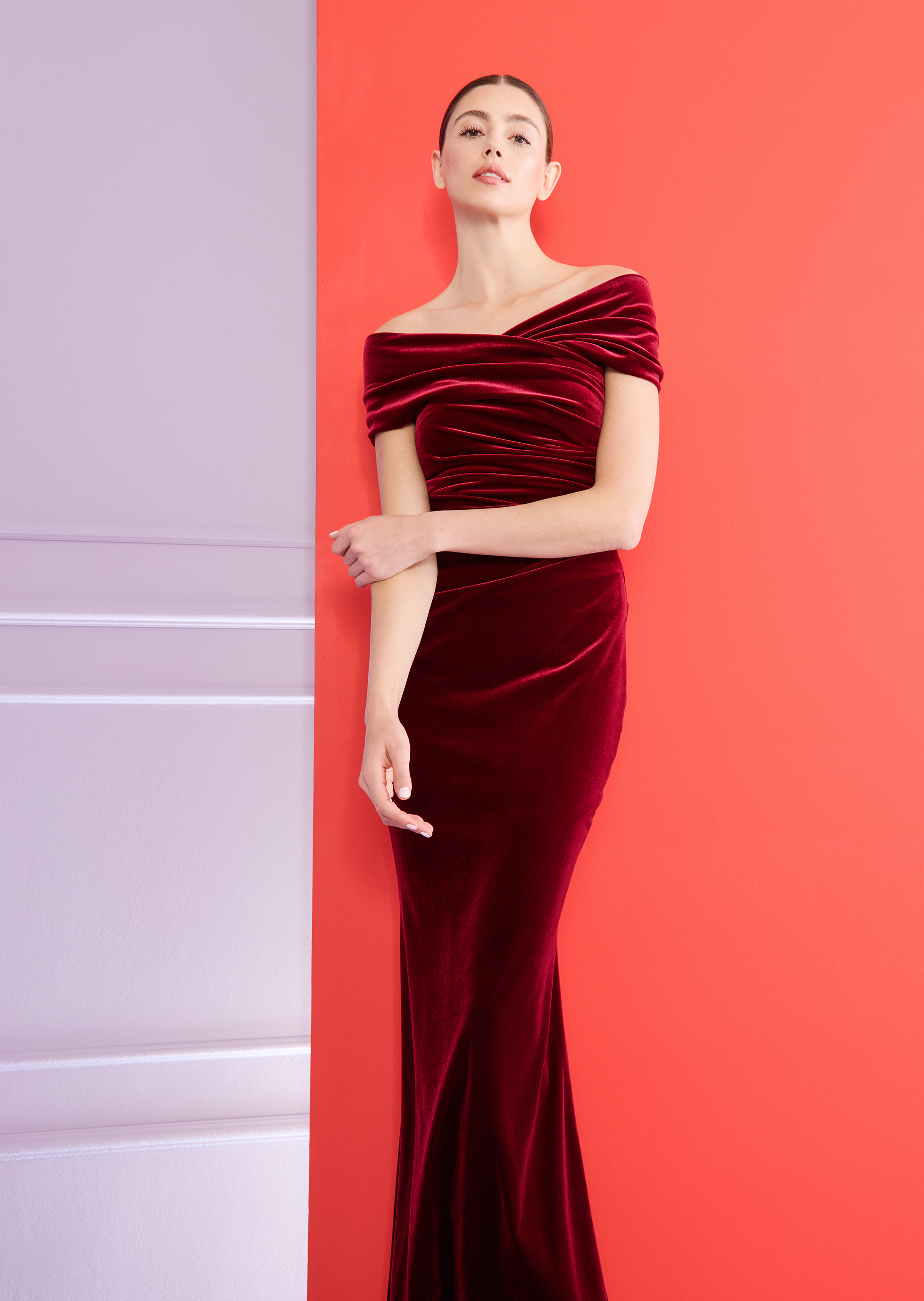 If your calendar is overflowing once again with wonderful events and you’re always out and about, then you need evening gowns that are not only versatile and easy to restyle, but also comfortable to travel in. Like this simple yet glamorous gown, for instance. The cut has plenty going for it, too. Thanks to the criss-cross drape, this evening gown accentuates your collarbones, while also covering the upper arms with a short sleeve. Intentional draping makes the waist appear slimmer. We made this floor-length gown out of comfy stretch velvet. You can go crazy and pair it with brightly colored accessories. Alternatively, wear it with a matching stole and delicate gold jewelry for an elegant look or with an exciting choker for a glamorous outfit.