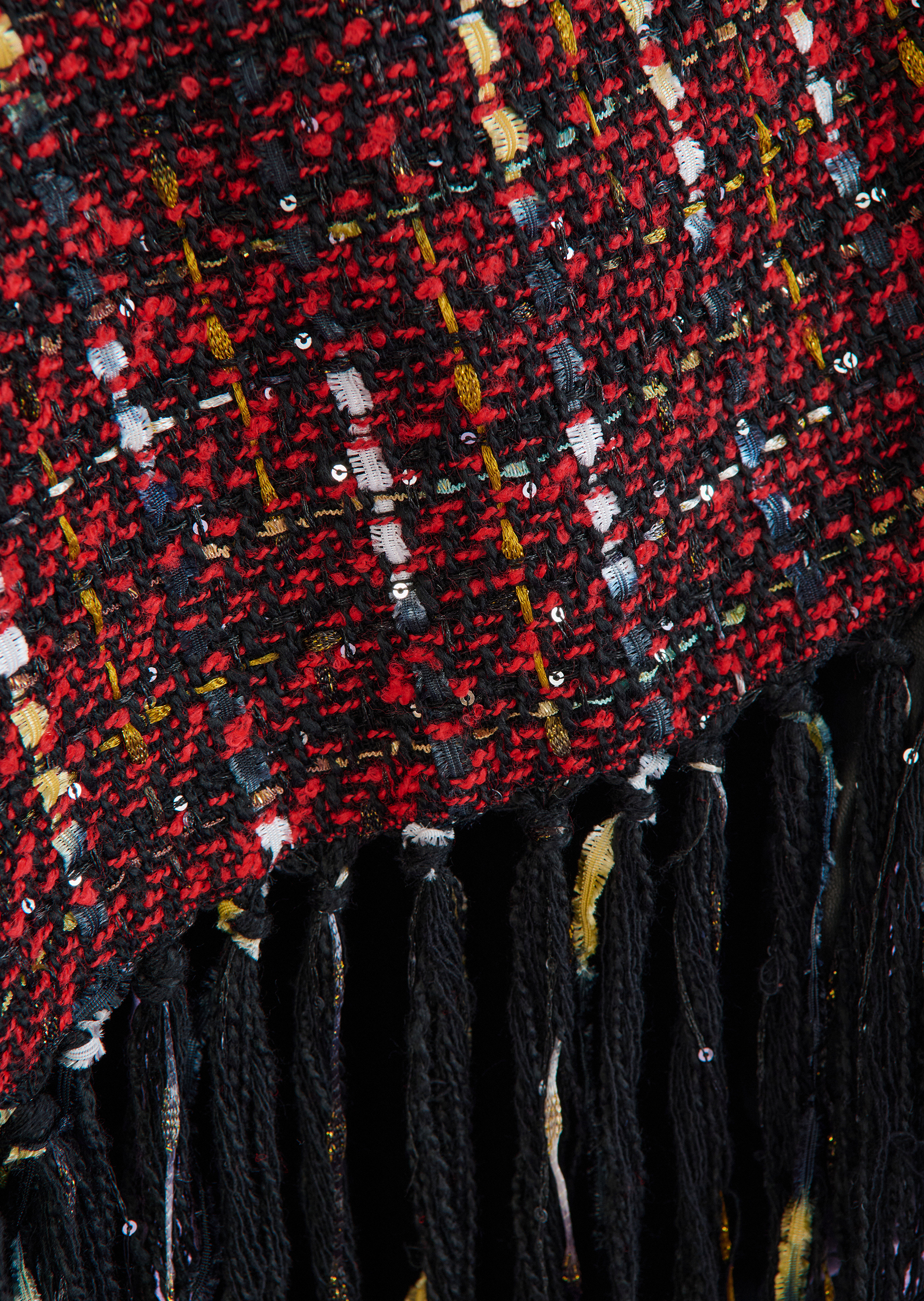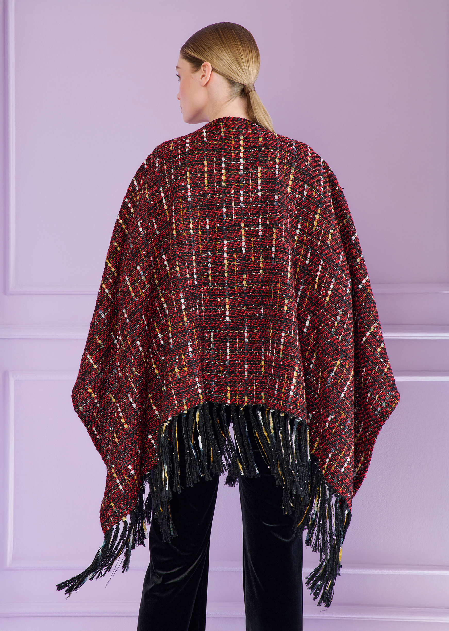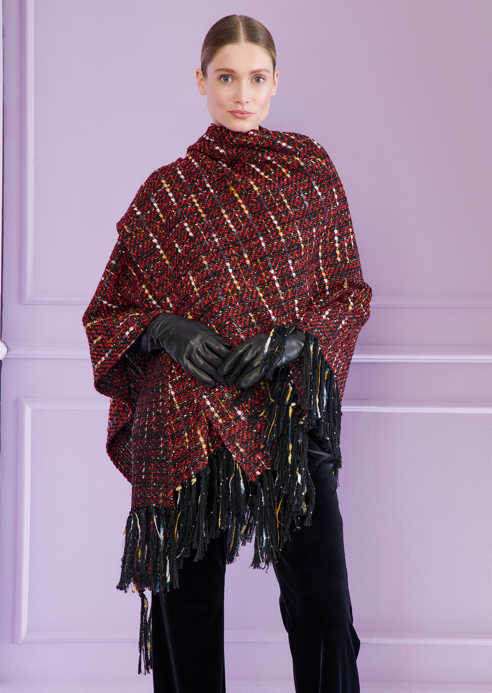 Hygge couture! Whether you’re on a ski holiday, in front of the fire in a chalet spa or touring London on a cold day, our new tweed stole will protect you from minus temperatures and dreary thoughts alike. All thanks to the colorful check pattern with feel-good fringing – and of course, the soft tweed fabric. This stole will go with any of your fall or winter outfits. However, it looks particularly stylish and fabulous paired with our Talbot Runhof dress.