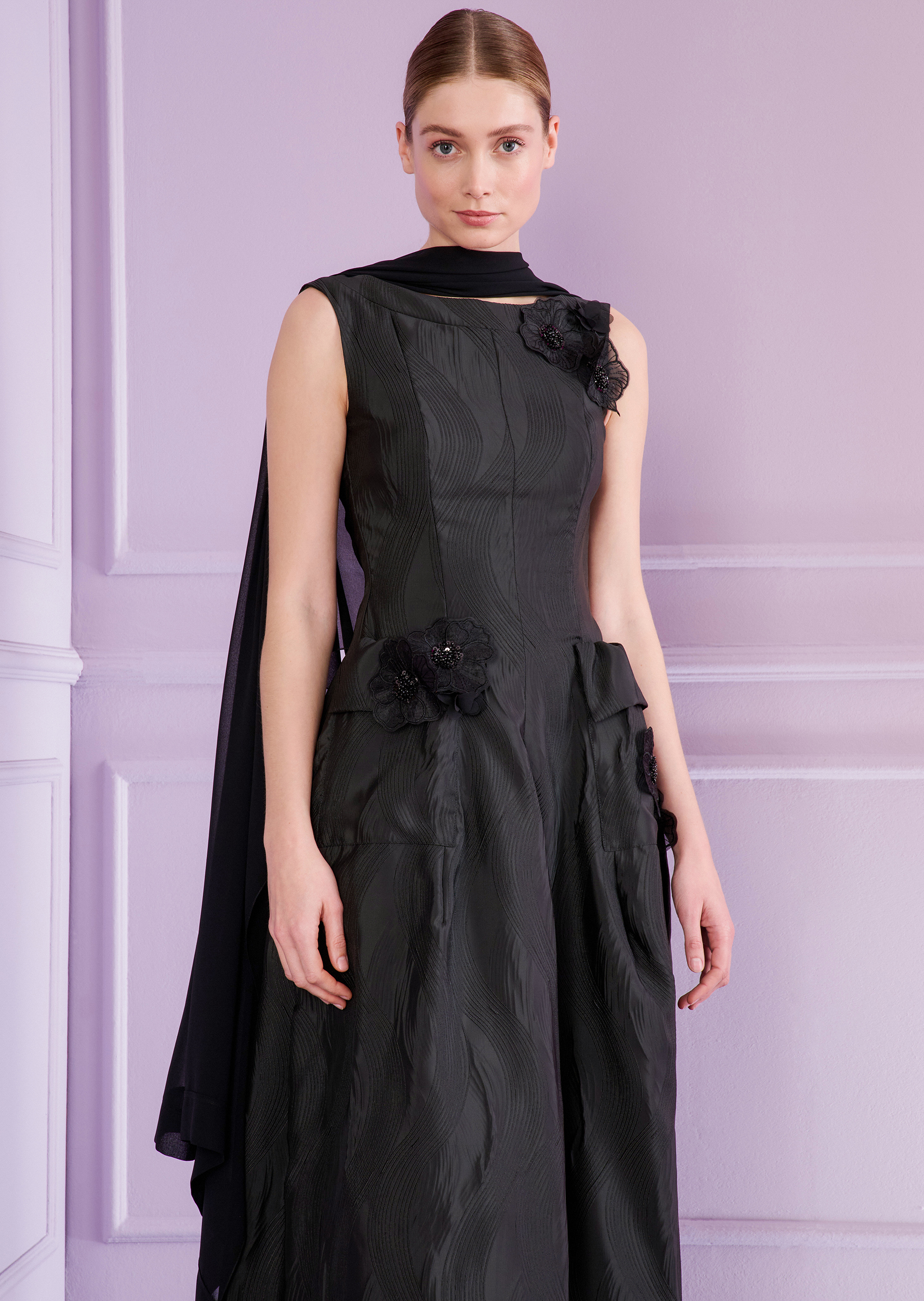 One stole – lots of styling options. This poncho is the perfect companion on cooler evenings or as a subtle way to cover up on more formal occasions. Thanks to the cut, our new stole can be worn in different ways. Simply pull it over your head and drape the flowing crêpe satin loosely over your shoulders. Or be a little more creative! Simply fold it over and knot it at the side, either on the front or back. This lets you create an exciting wrap top. There is no limit to the exciting looks you can create, especially in combination with simple evening gowns.