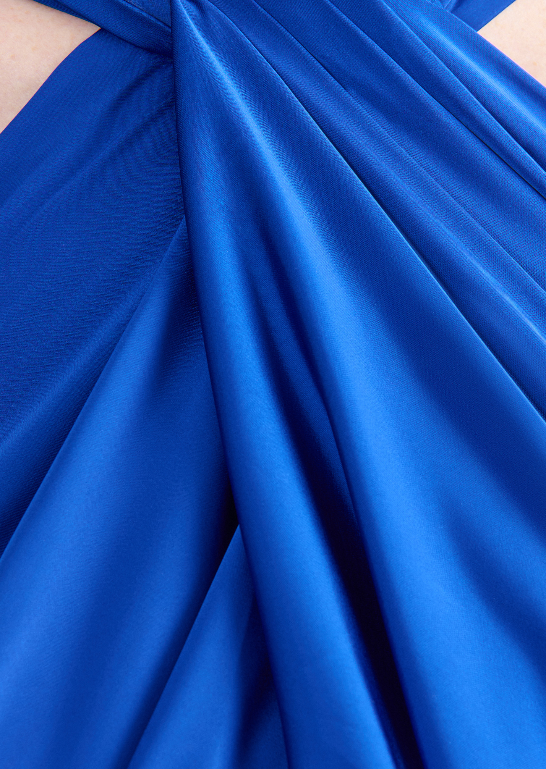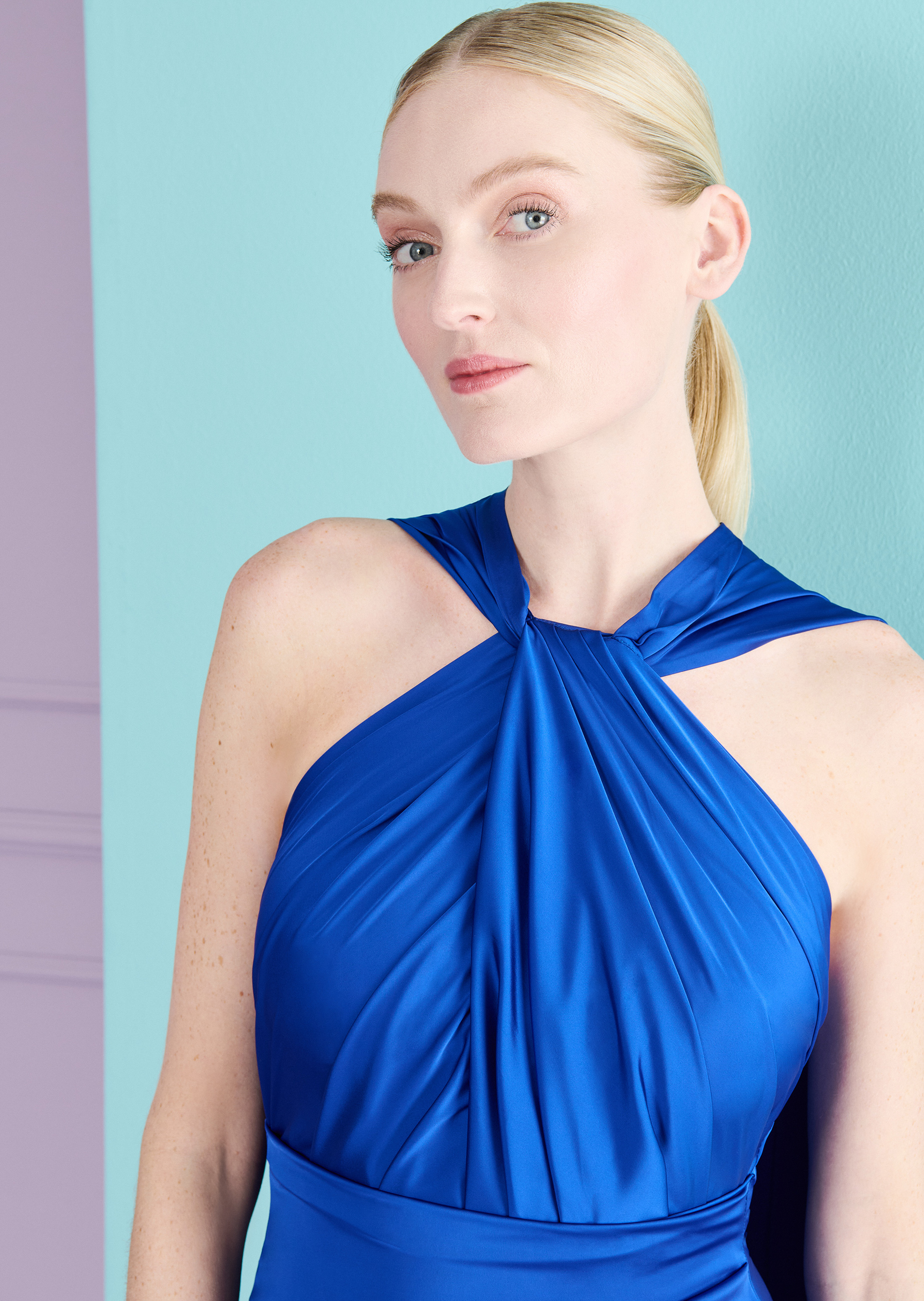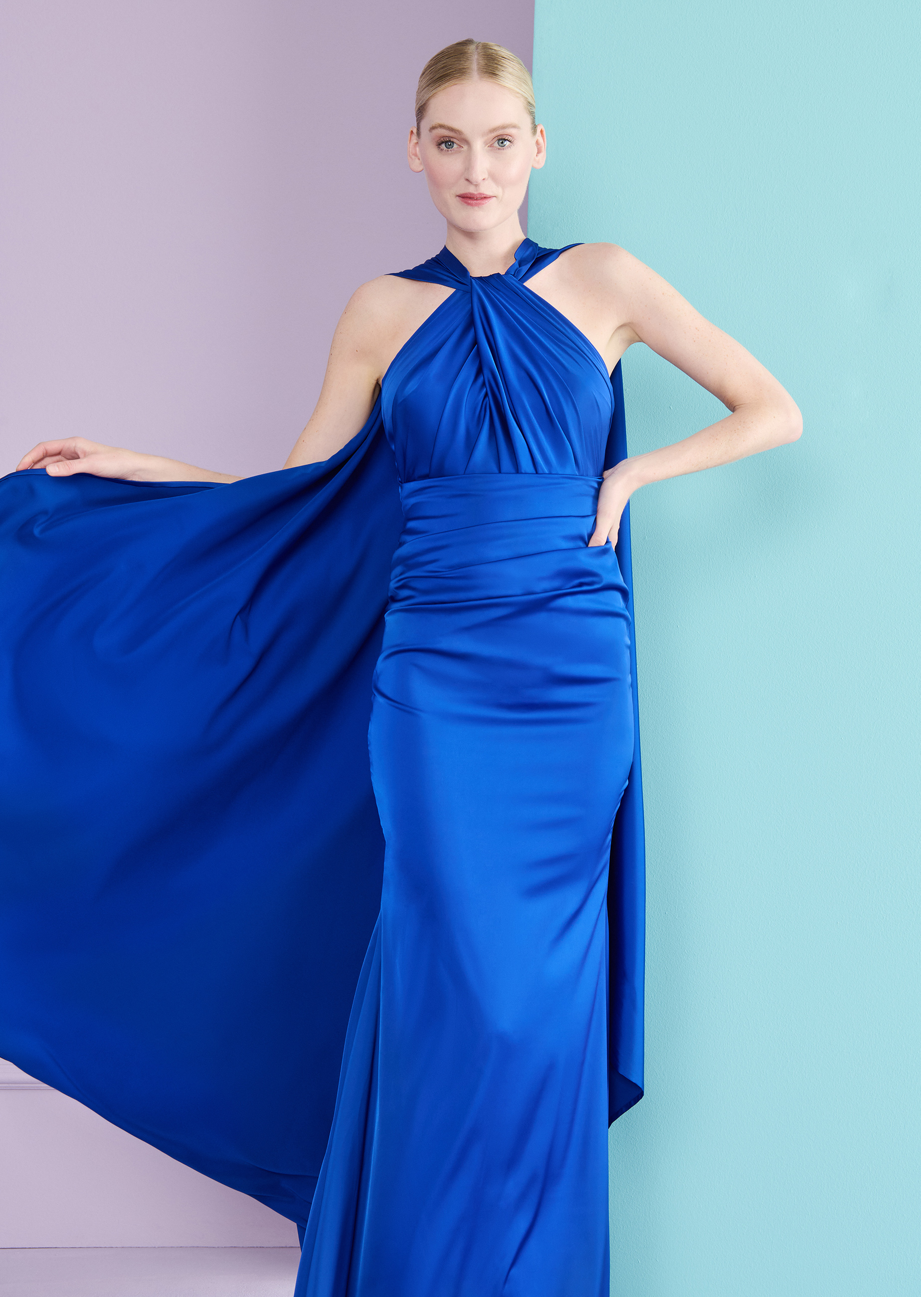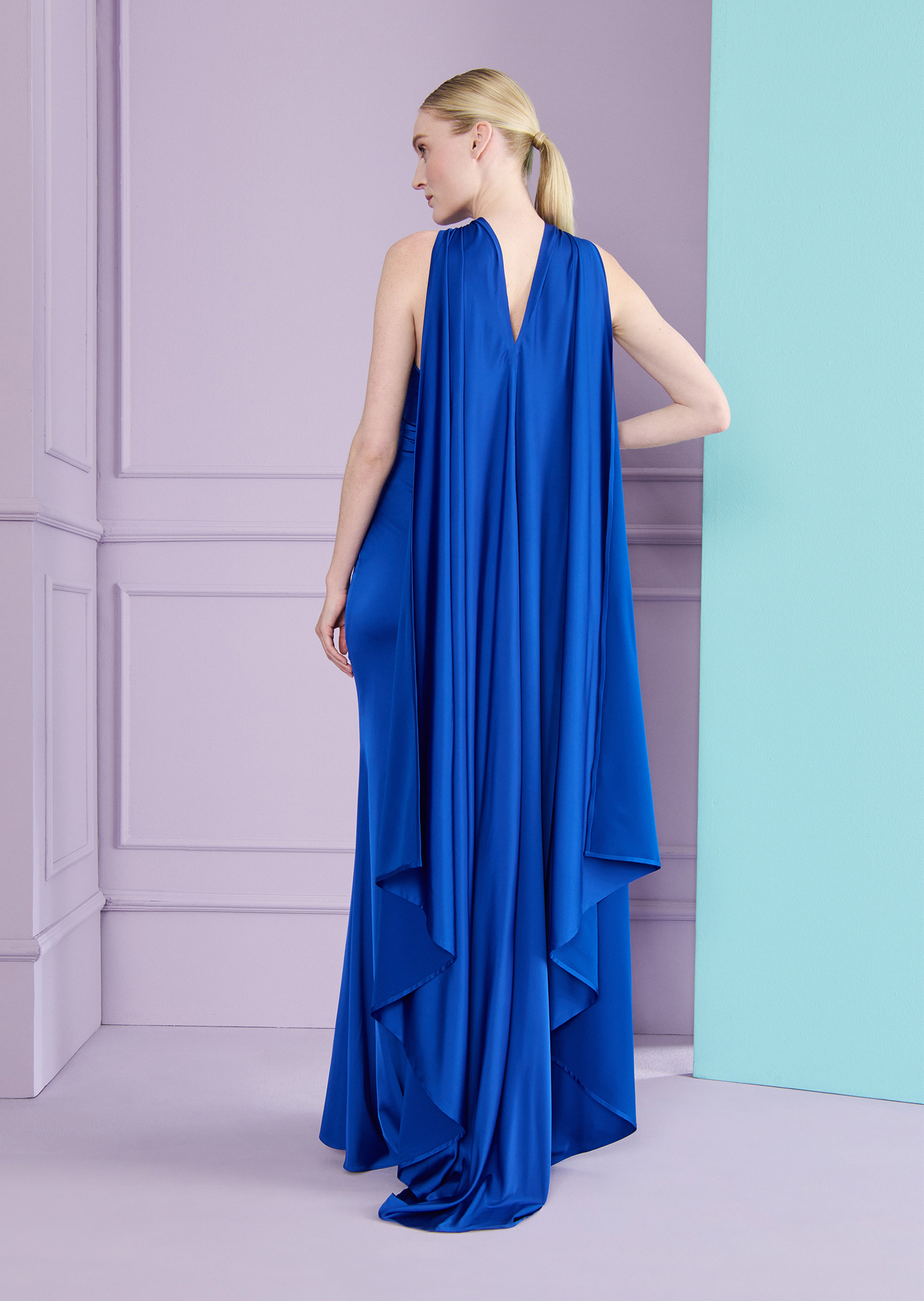 up up and away! you'll feel like a superhero in this evening dress. the cut is long and lean with a slightly flared fishtail. clever drapes conjure up a narrow waist. the high-neckline and intertwined feather-light cape (that functions almost like a stole) creates a soft and delicate bodice and provides optimal coverage perfect for your next event. you'll need very few accessories - just some smashing shoes and a simple clutch and you'll be ready to save the day.