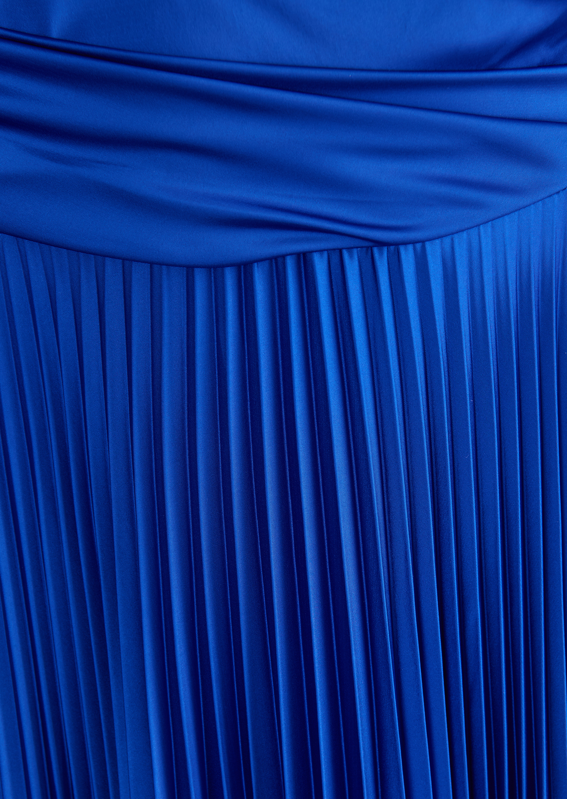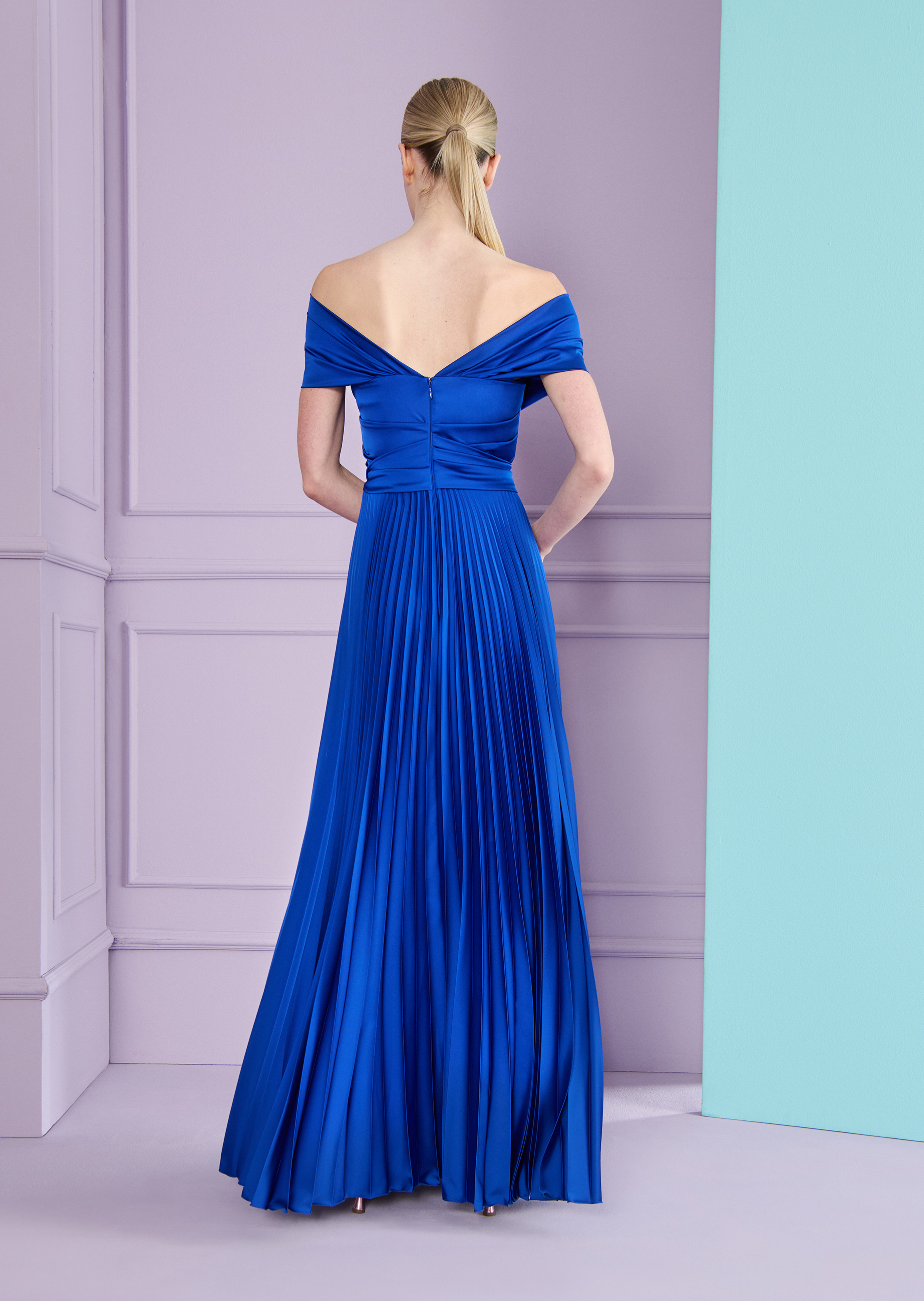 Is your calendar overflowing again with wonderful events, and you’re always on the go? Then you need evening gowns that are versatile and easy to restyle in several different ways. Like this simple yet glamorous gown, for instance. Along with all these attributes, the cut of the dress has plenty to offer too. The criss-cross design accentuates the collarbones while also covering the upper arms as short sleeves. Careful draping makes the waist appear slimmer. The wide, pleated skirt flows beautifully. This floor-length design boasts a feather-light voile satin print. You can go all out and pair it with contrasting color accessories, wear it with a matching stole and delicate gold jewelry for an elegant look or with an exciting choker for a glamorous outfit.