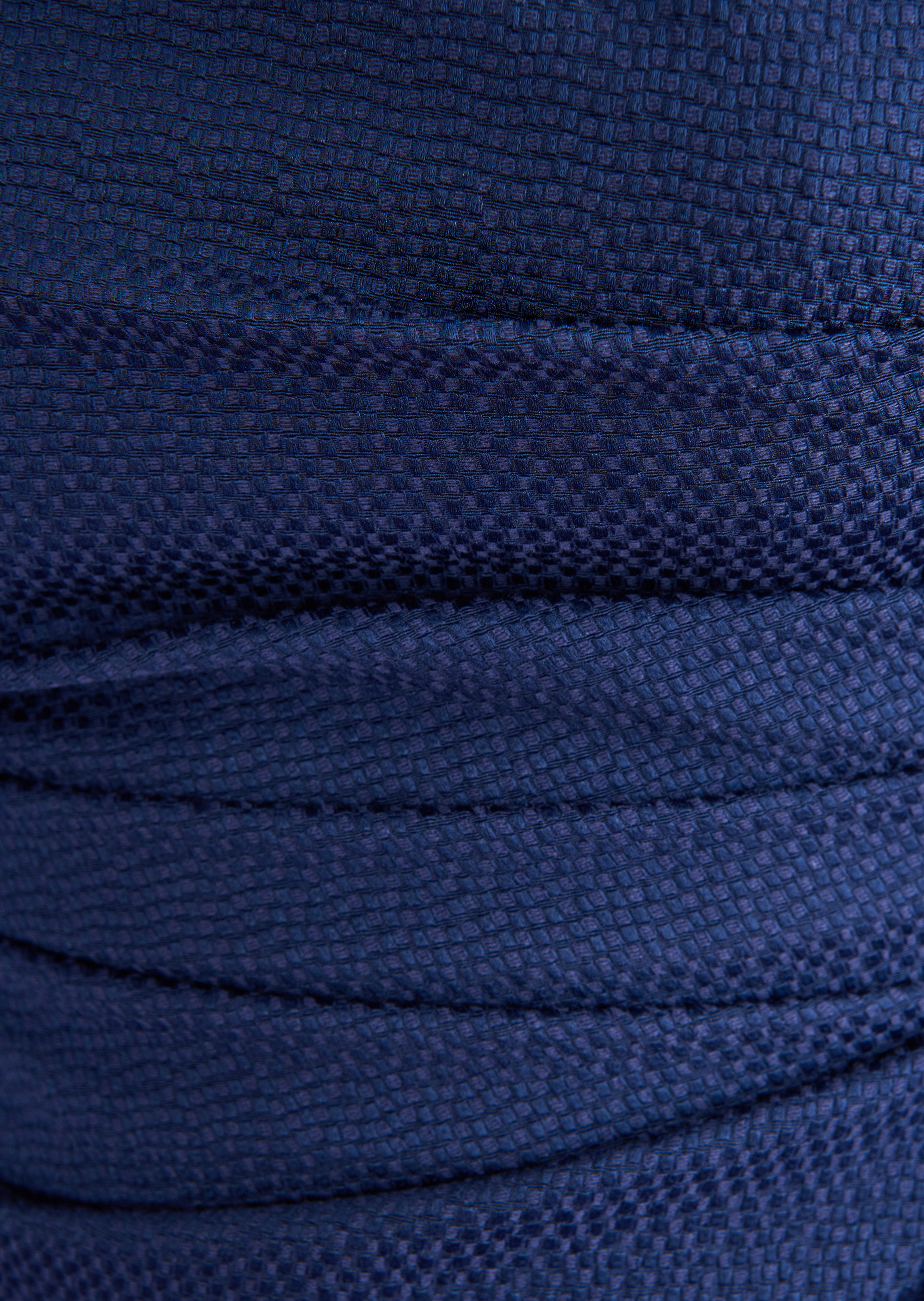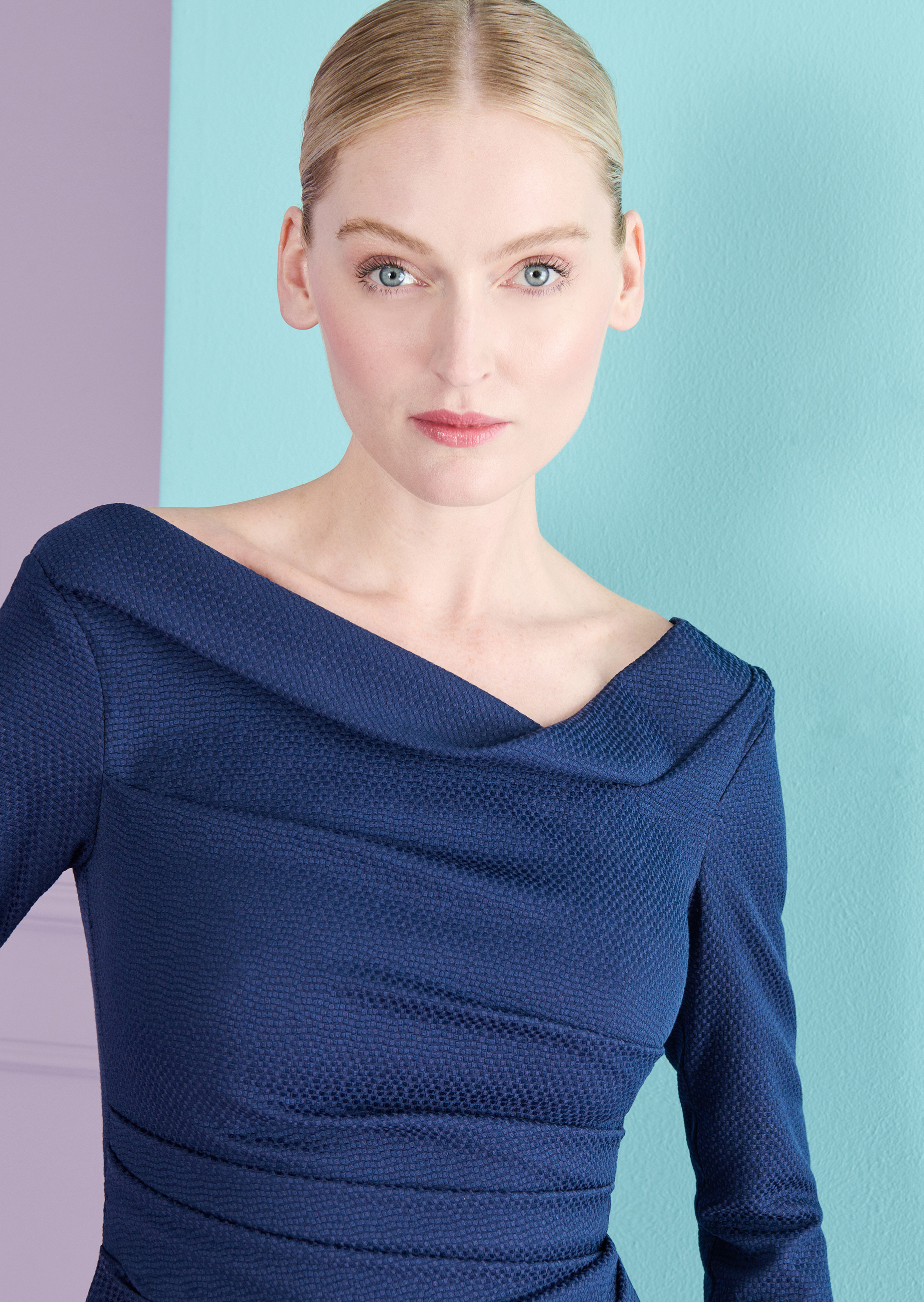 Our day dress made of lightweight mosaic cotton piqué is truly picturesque. Like a delicate brushstroke, the narrow, twisted collar traces a sweeping line along the elegant bateau neckline. The drape of the fabric accentuates the waist. The silhouette is hugged beautifully by a slender skirt, while the kick pleat offers complete freedom of movement. This elegant look will not only make an impact at your next business presentation, it will also take you from the office to the theater premiere party.