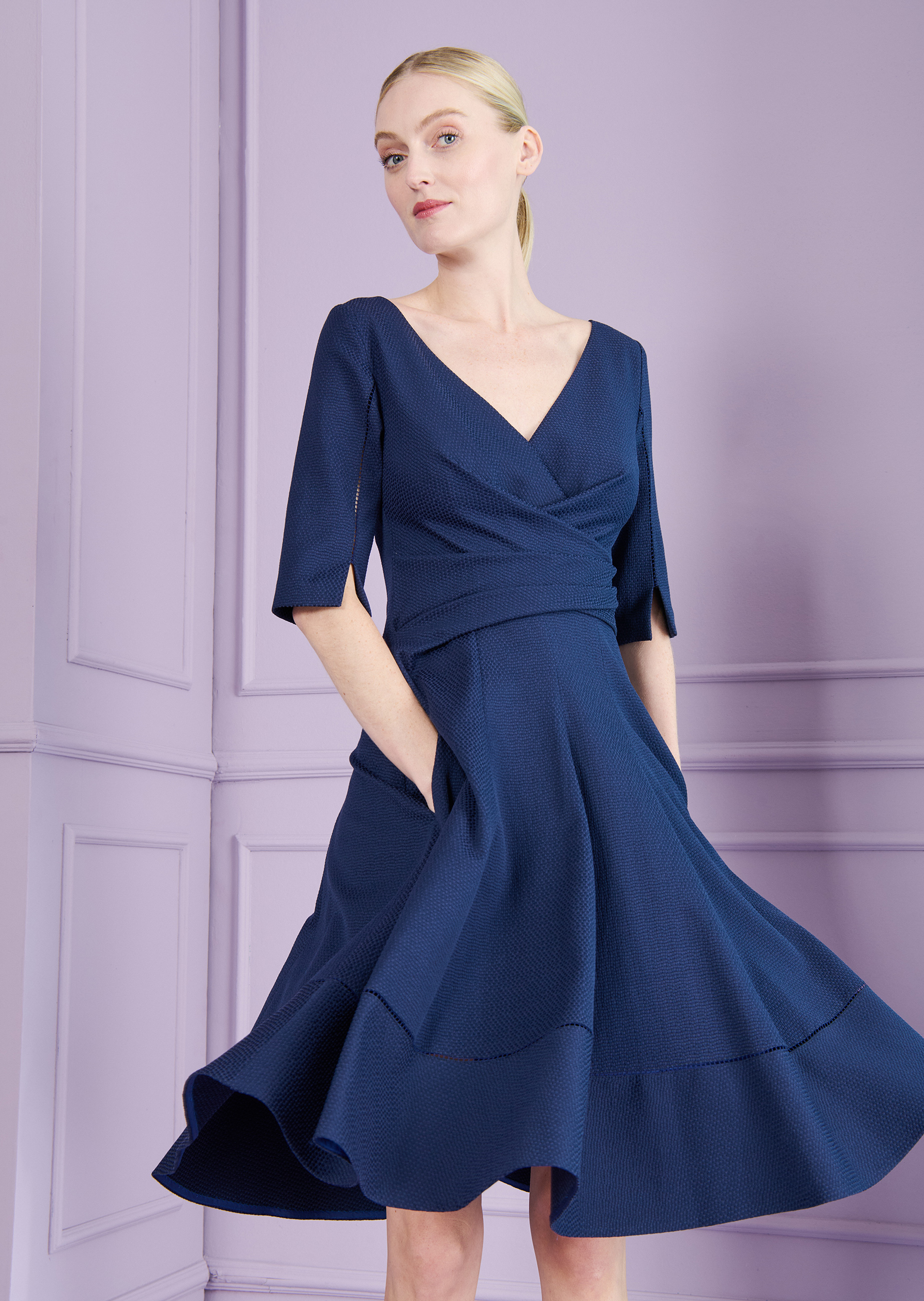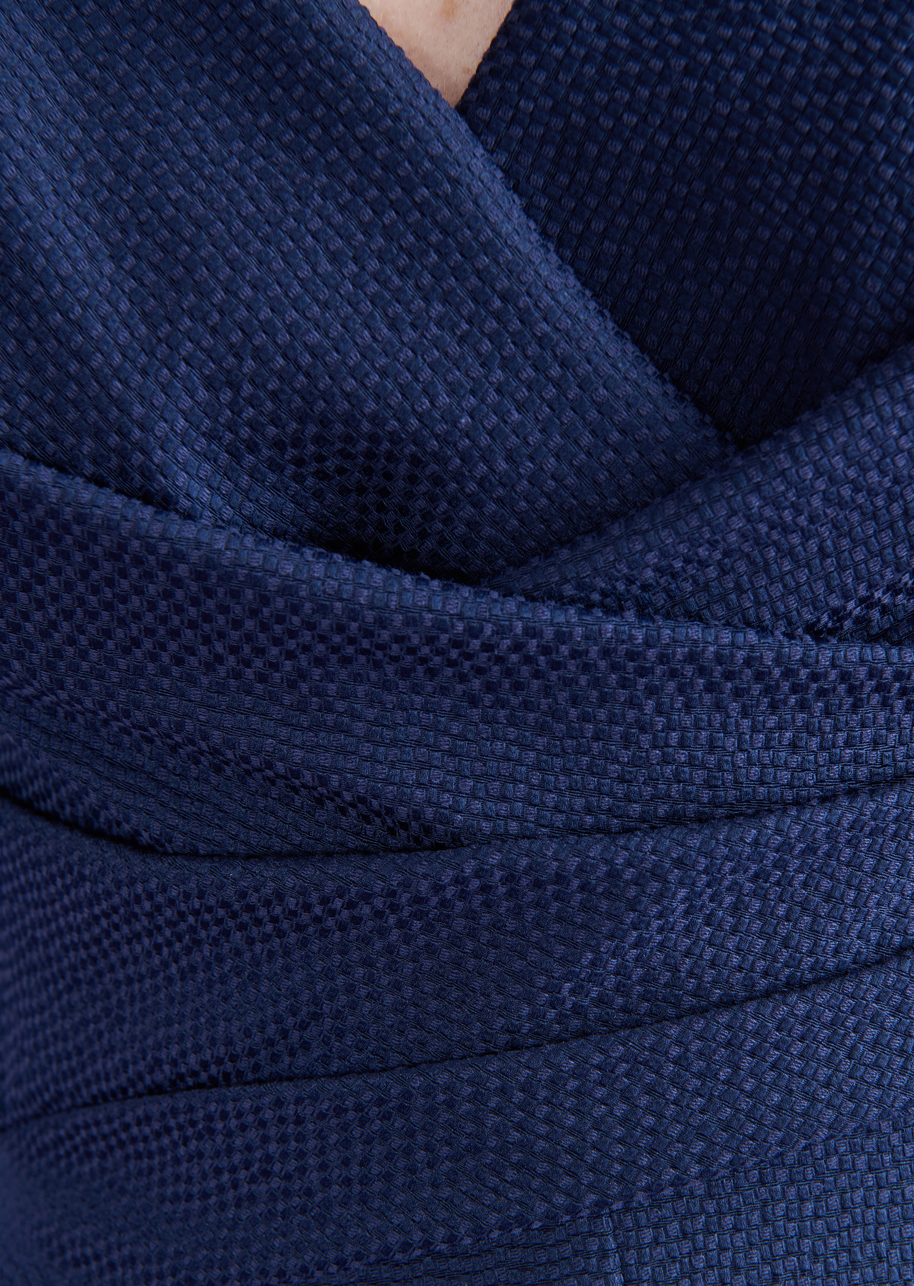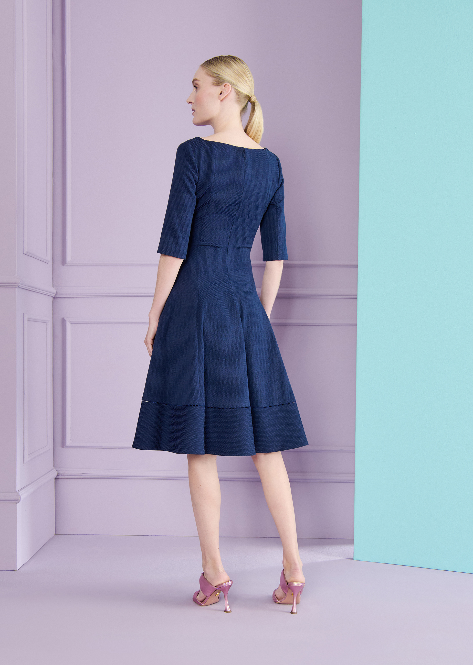 We’ve pleated the neckline here to create a wonderfully feminine, sexy look. The elaborate draping is really something to behold. This day dress in a simple mosaic cotton piqué is guaranteed to be a success. Elegant and super chic, it knows how to impress with a narrow waist and a sweeping, wide, knee-length skirt. Style it with contrasting sandals or elegant flats. This dress will make an instant impact wherever you go, whether it’s for everyday life, at the office or for an evening meal.