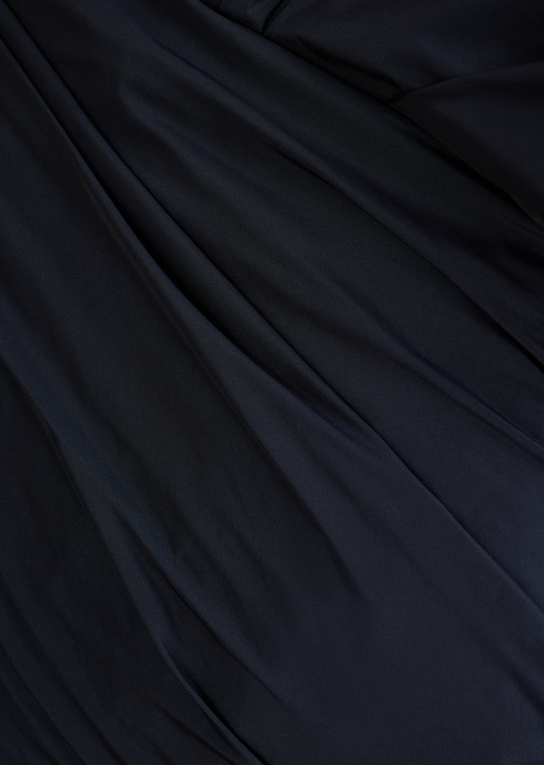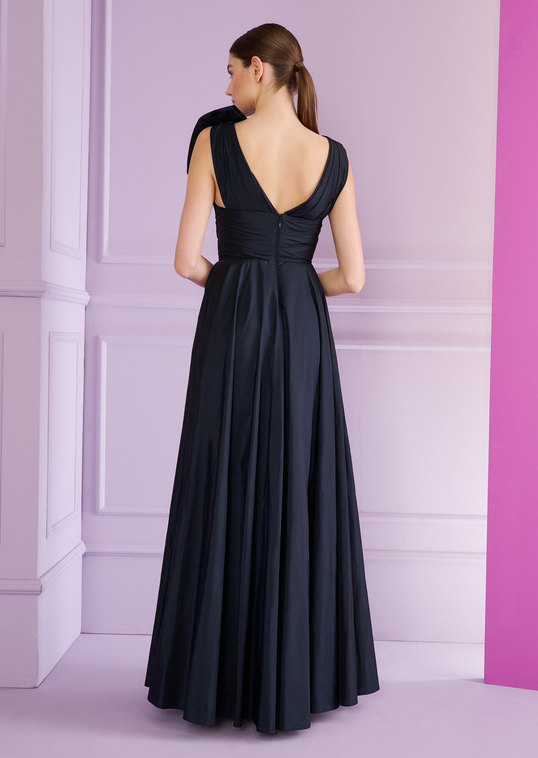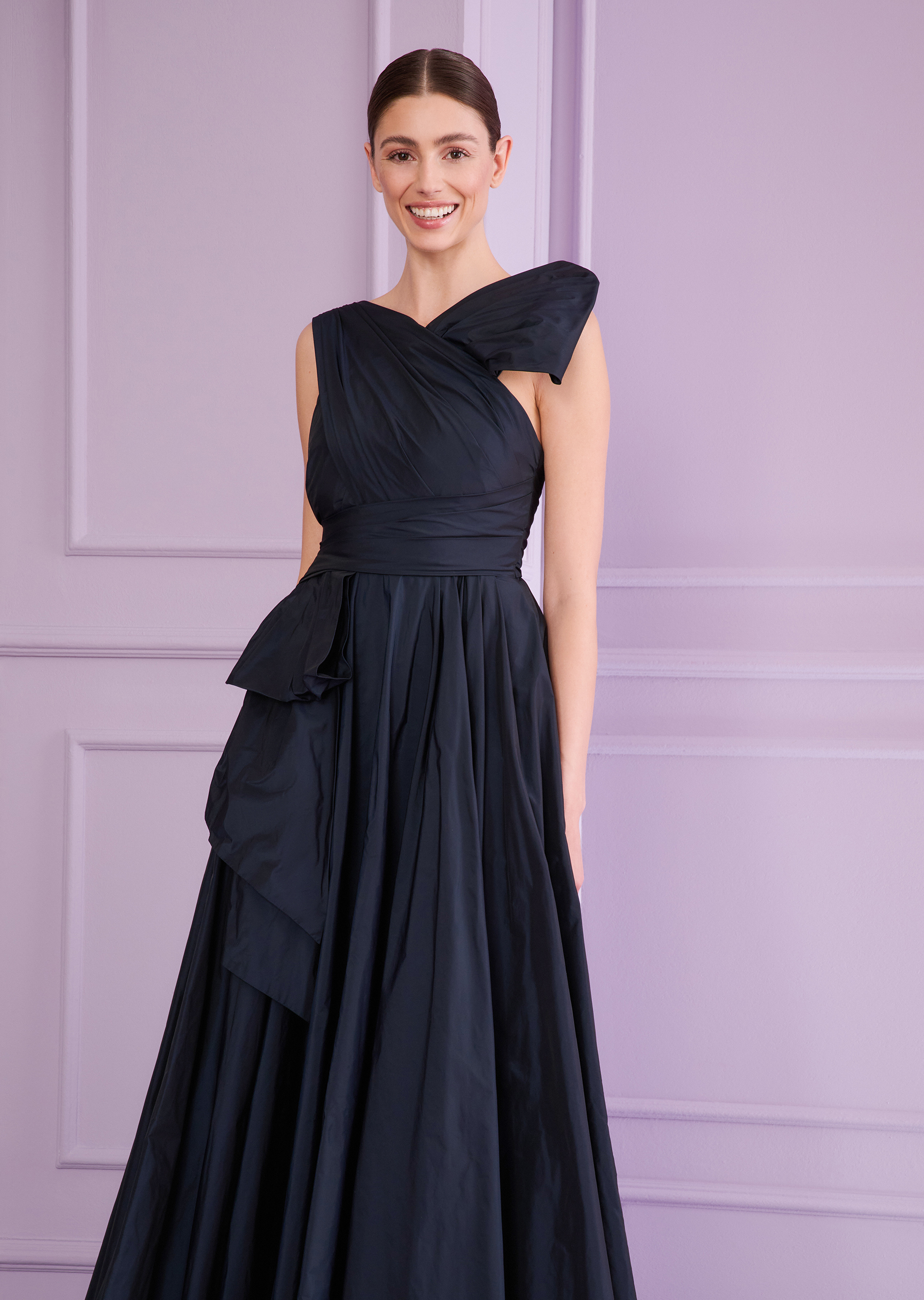 "Bowtiful" statement! Our new ball gown has plenty to shout about, however it’s the cleverly designed upper section with its extravagant bow detail that immediately catches the eye. The back is also accentuated by an elegant neckline that is low enough to appear seductive, but not too low that it means you can’t wear a bra. The wide skirt section gives the dress a wonderful lightness and will reveal its full potential on the dance floor. This dress is made of luxuriously crisp, dark blue taffeta – perfect for exciting nights that never end.