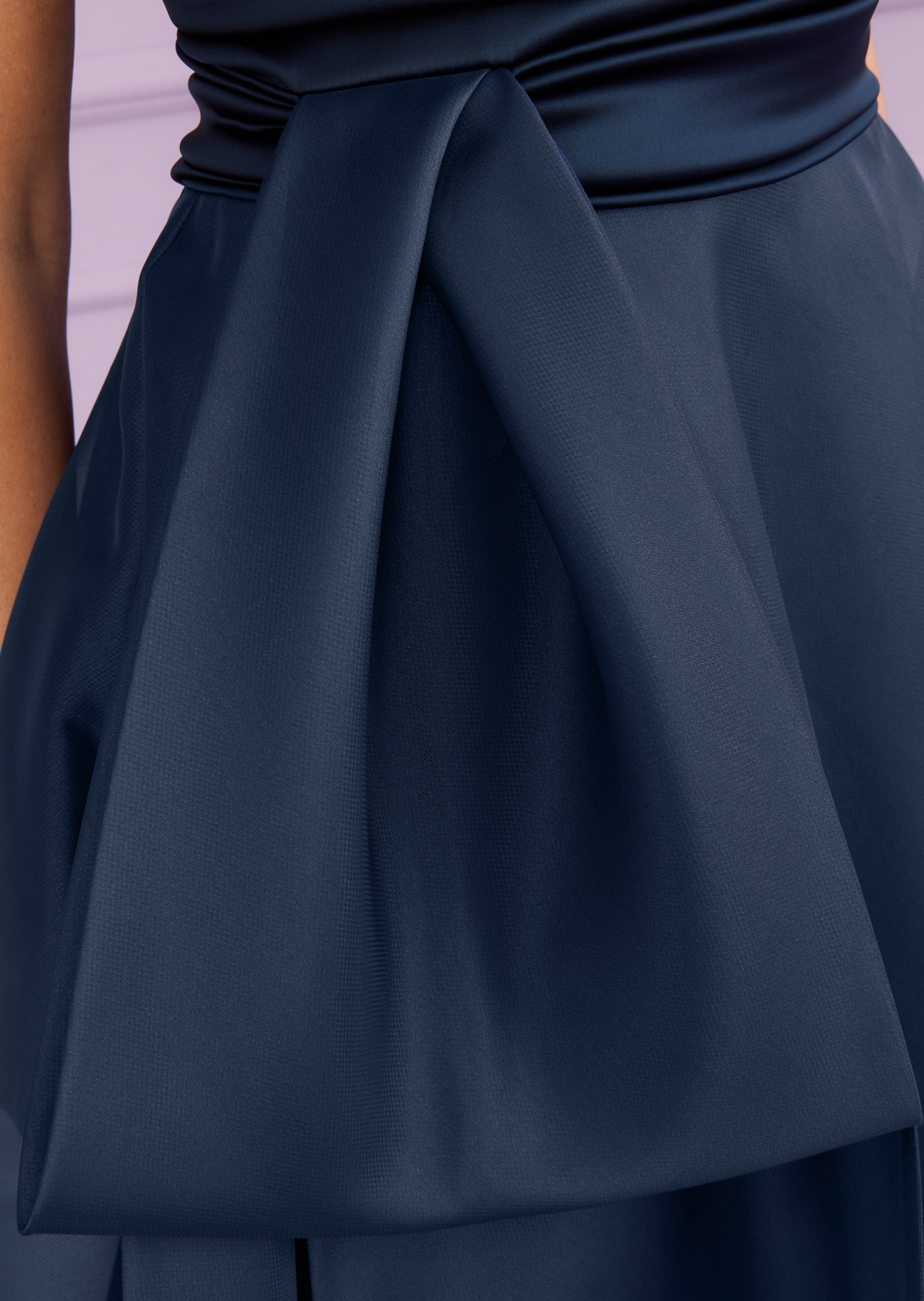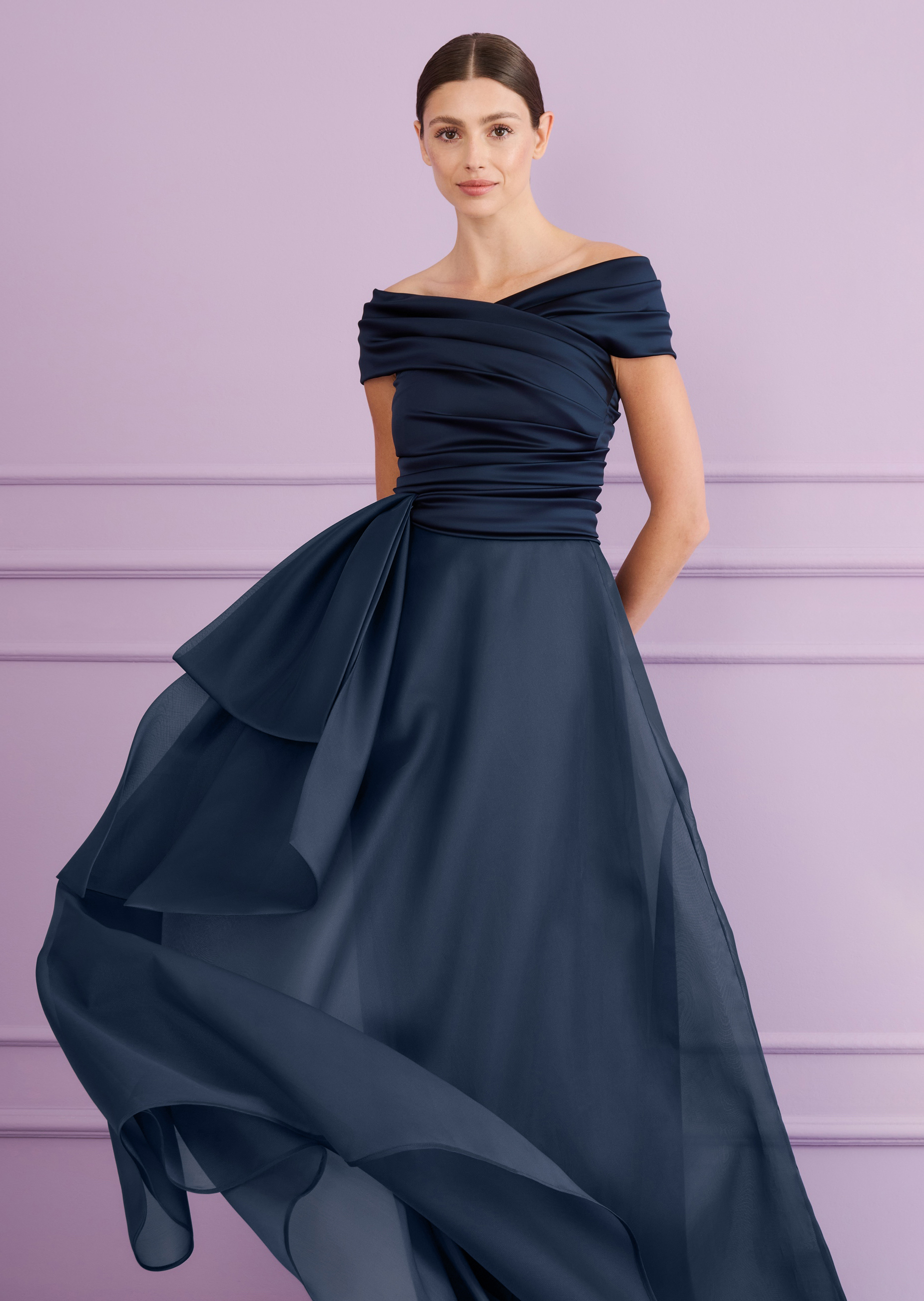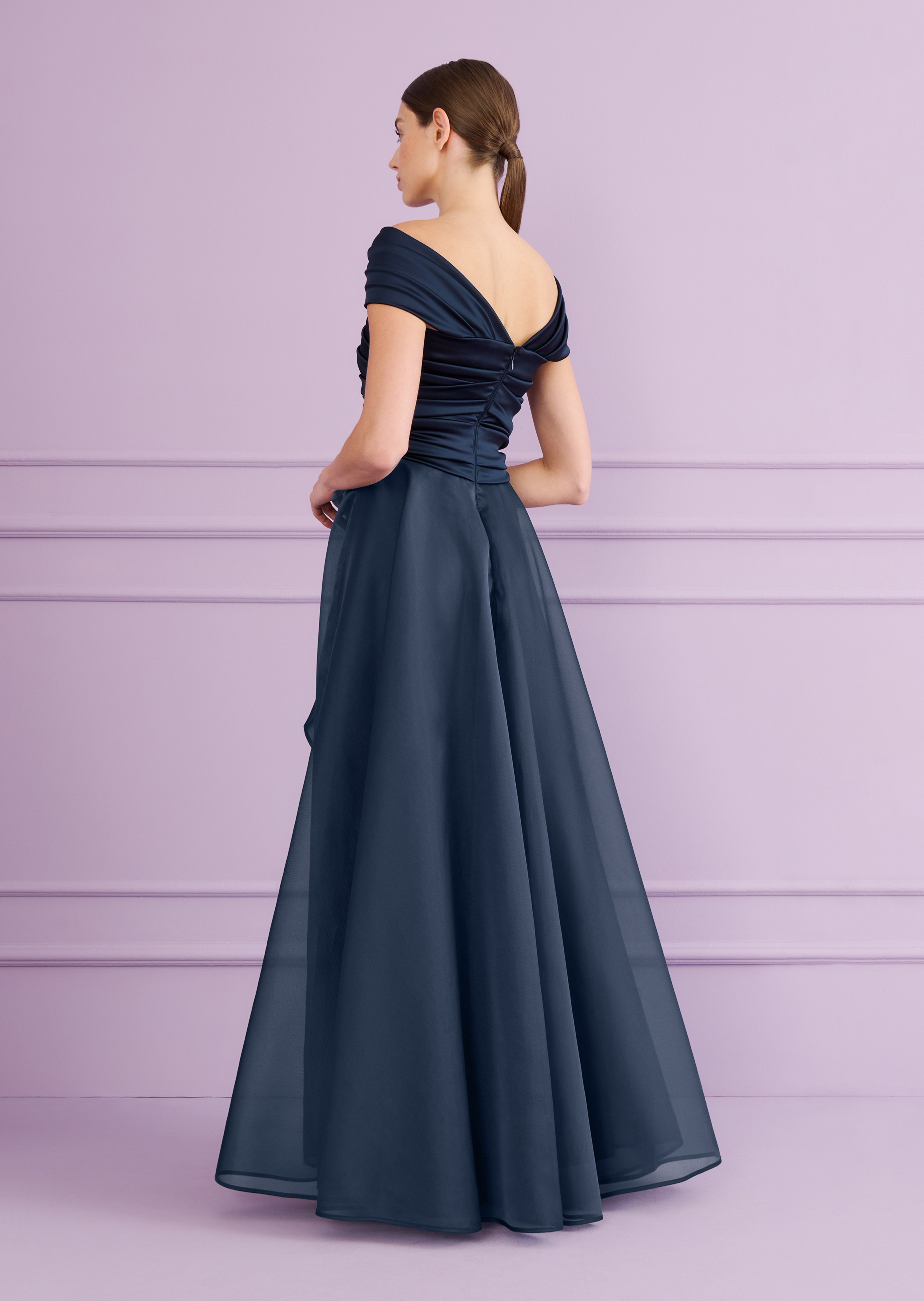 long dress made of stretch satin duchesse • gazar organza, color armada blue