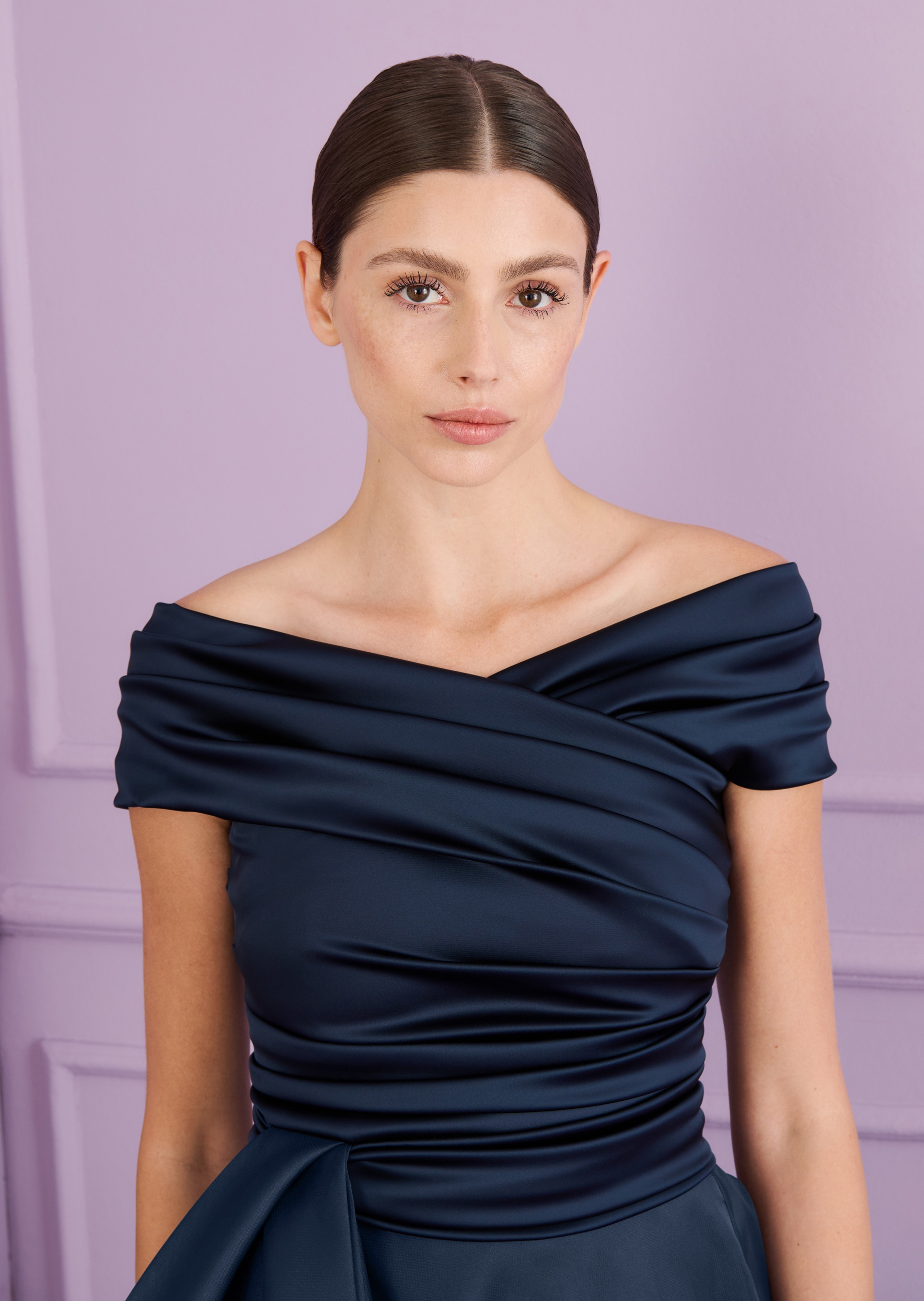Midnight’s just the beginning in this gown. Forget the fairy tale ending at the stroke of twelve—this look is made for dancing 'til dawn. The criss-cross neckline frames your shoulders with effortless elegance, adding a touch of modern femininity. Crafted from a lustrous stretch satin duchesse, the fitted bodice sculpts beautifully and brings instant glamour. The voluminous organza skirt balances it all with lightness and flow—so you can glide across the dance floor in dreamy, weightless motion. Romantic, radiant, unforgettable. Because the night is yours.
