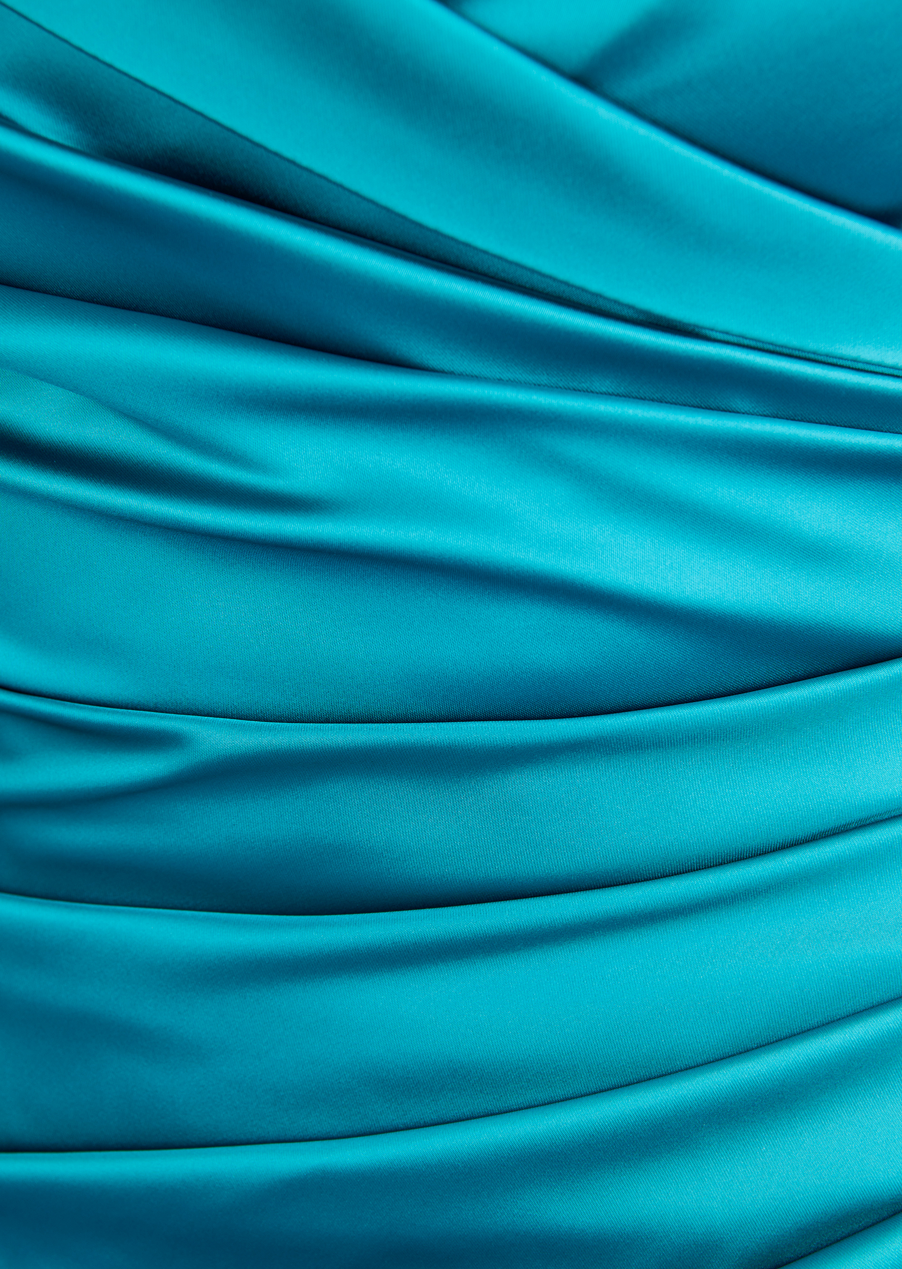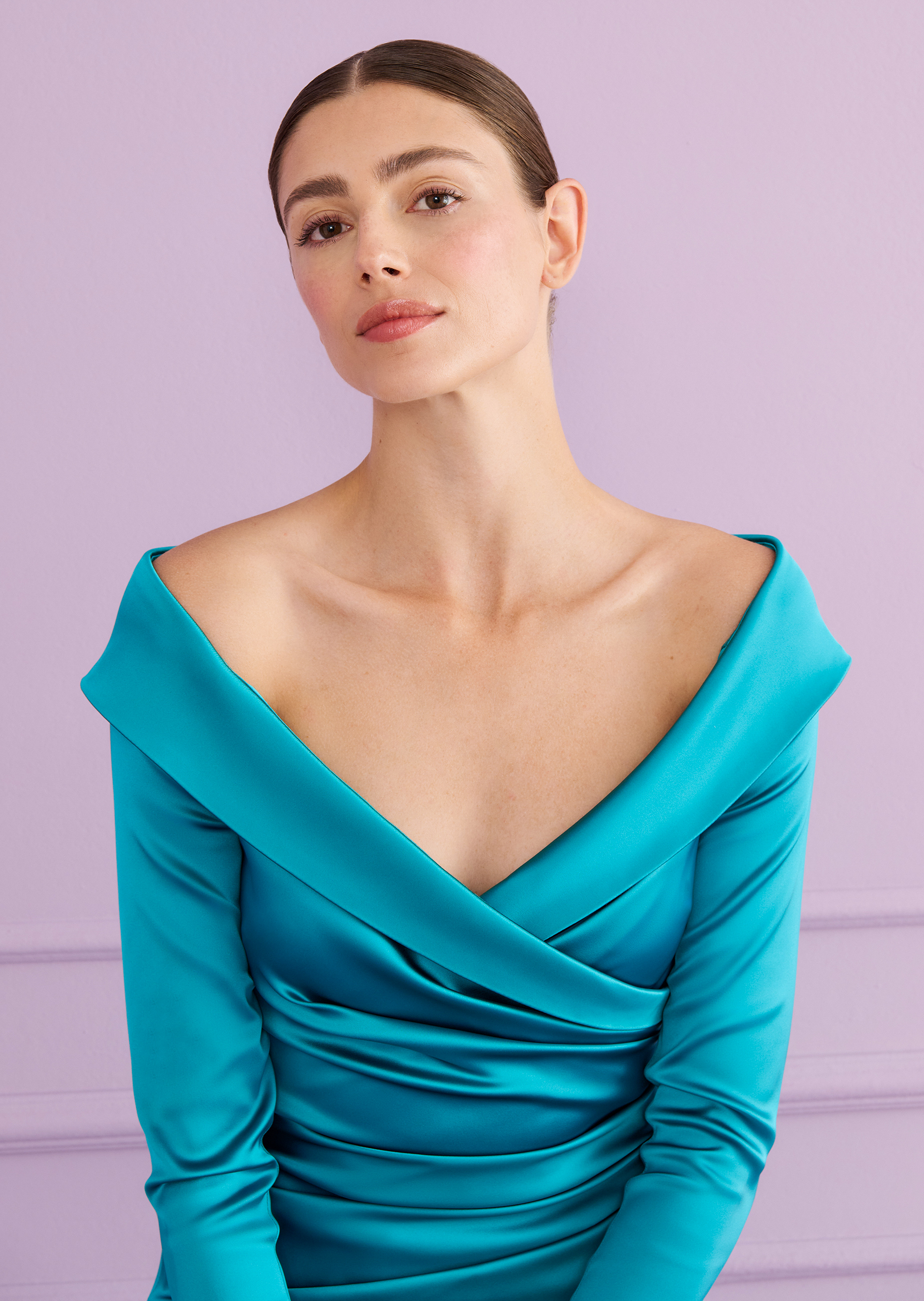 In this gown, you'll become a true diva – with attitude, but without airs and graces! The generous neckline looks sexy and feminine. The criss-cross draping subtly highlights the décolleté while providing gentle support. Slim, elbow-length sleeves add an extra touch of elegance. The waist is delicately accentuated, while the fitted cut creates a beautiful silhouette. But what would a diva be without a little shine? In this sumptuous satin duchesse, you’ll dazzle beautifully – and thanks to the stretch content, you’ll enjoy complete freedom of movement. Perfect for any wedding celebration, festive event, or even a ball.