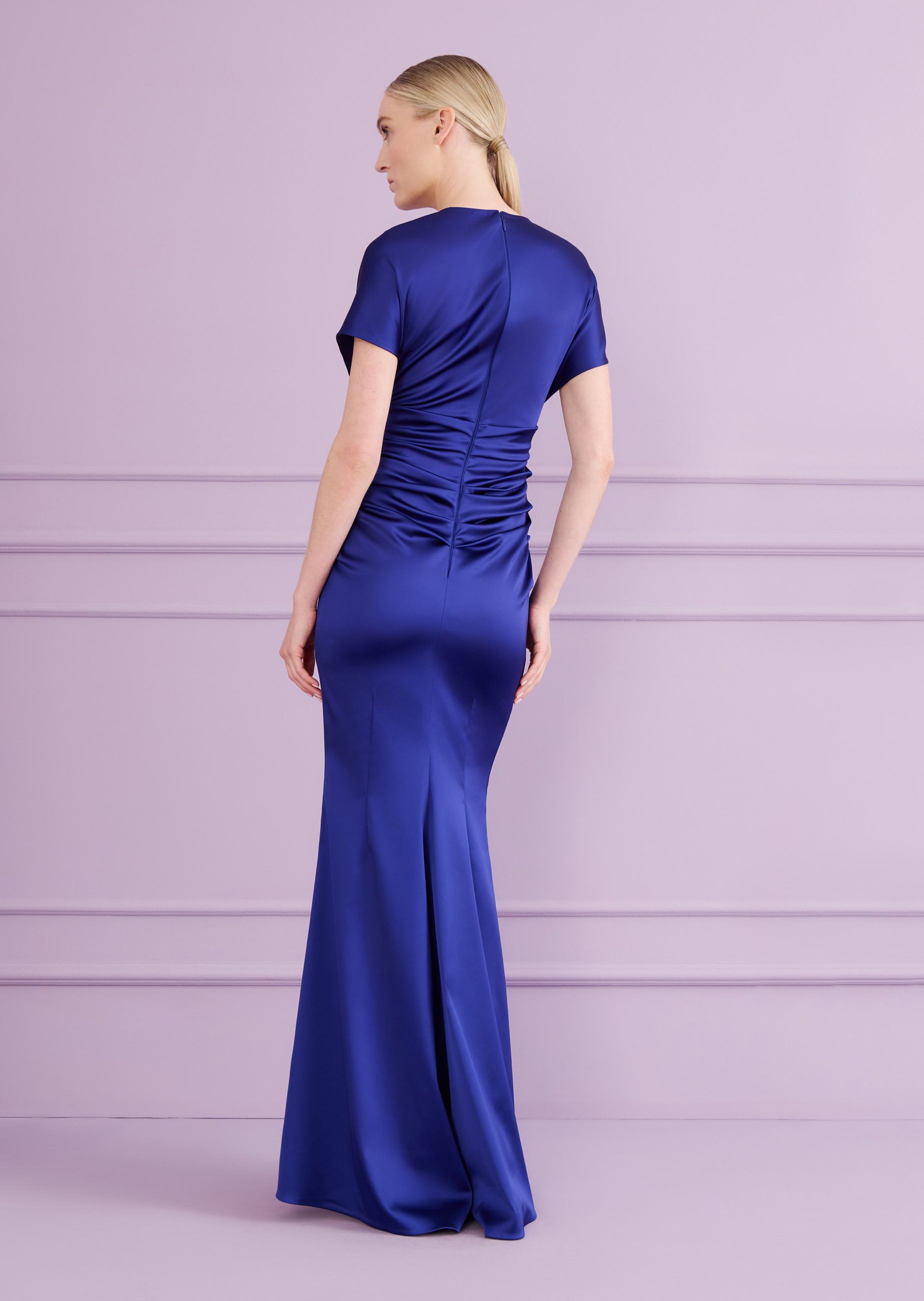 This evening gown is like a flattering compliment – instantly making you shine. The V-neckline highlights the décolleté without revealing too much. The extended shoulder line creates a soft sleeve that gently covers the upper arms – perfect for those areas you might prefer to keep under wraps. Elegant draping at the waist creates a slimming effect, while the subtly flared mermaid skirt sculpts a beautifully curvy, feminine silhouette. We’ve crafted this gown from our beloved, festive satin duchesse – glamorous with just the right amount of stretch for all-night comfort. In this versatile piece, you’ll shine as your most radiant self.