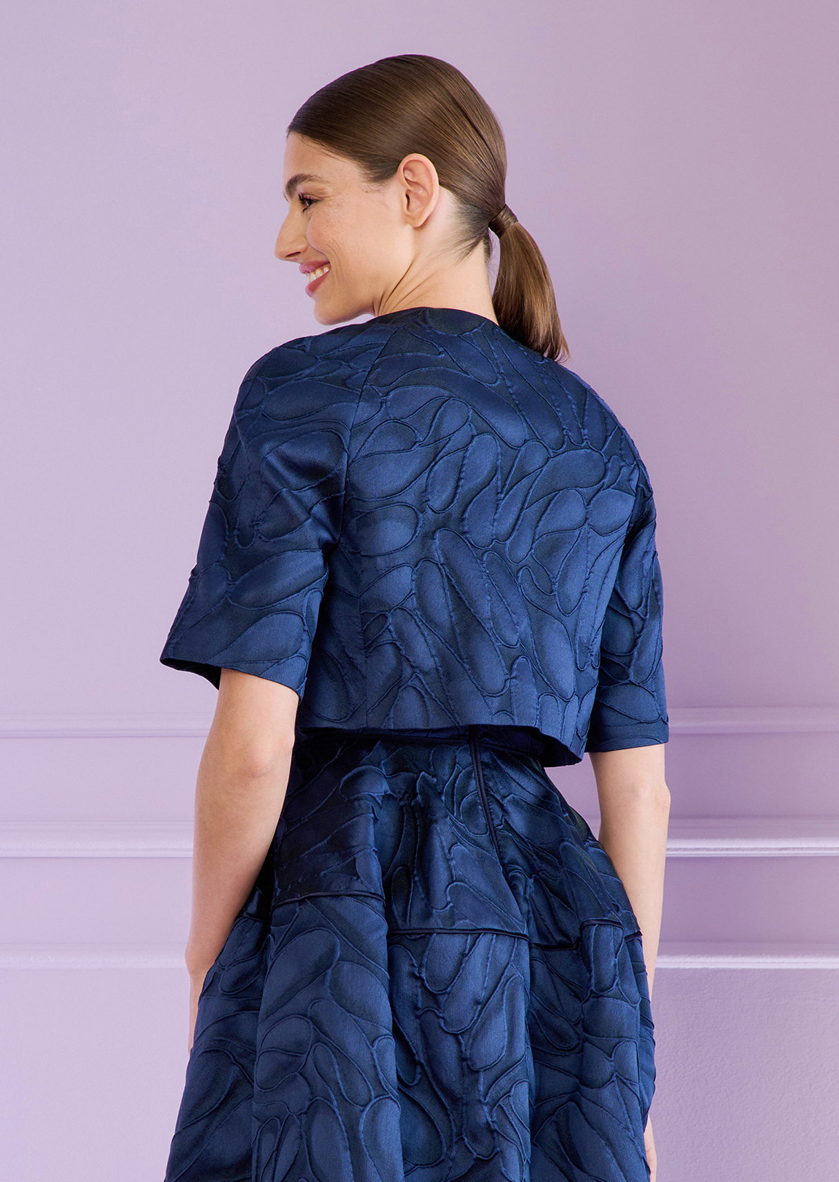 Straight and simple yet so smart: this is not just any little half-sleeve jacket. The breathtakingly beautiful fabric is so striking at first glance, while great details reveal themselves on closer inspection. Raglan sleeves give this classic jacket a sporty note. The boxy fit looks modern but not too casual when teamed with the matching cocktail dress. At the registry office, the jacket is the perfect enhancement to the matching cocktail dress by Talbot Runhof but also looks stunning teamed with more casual looks.
