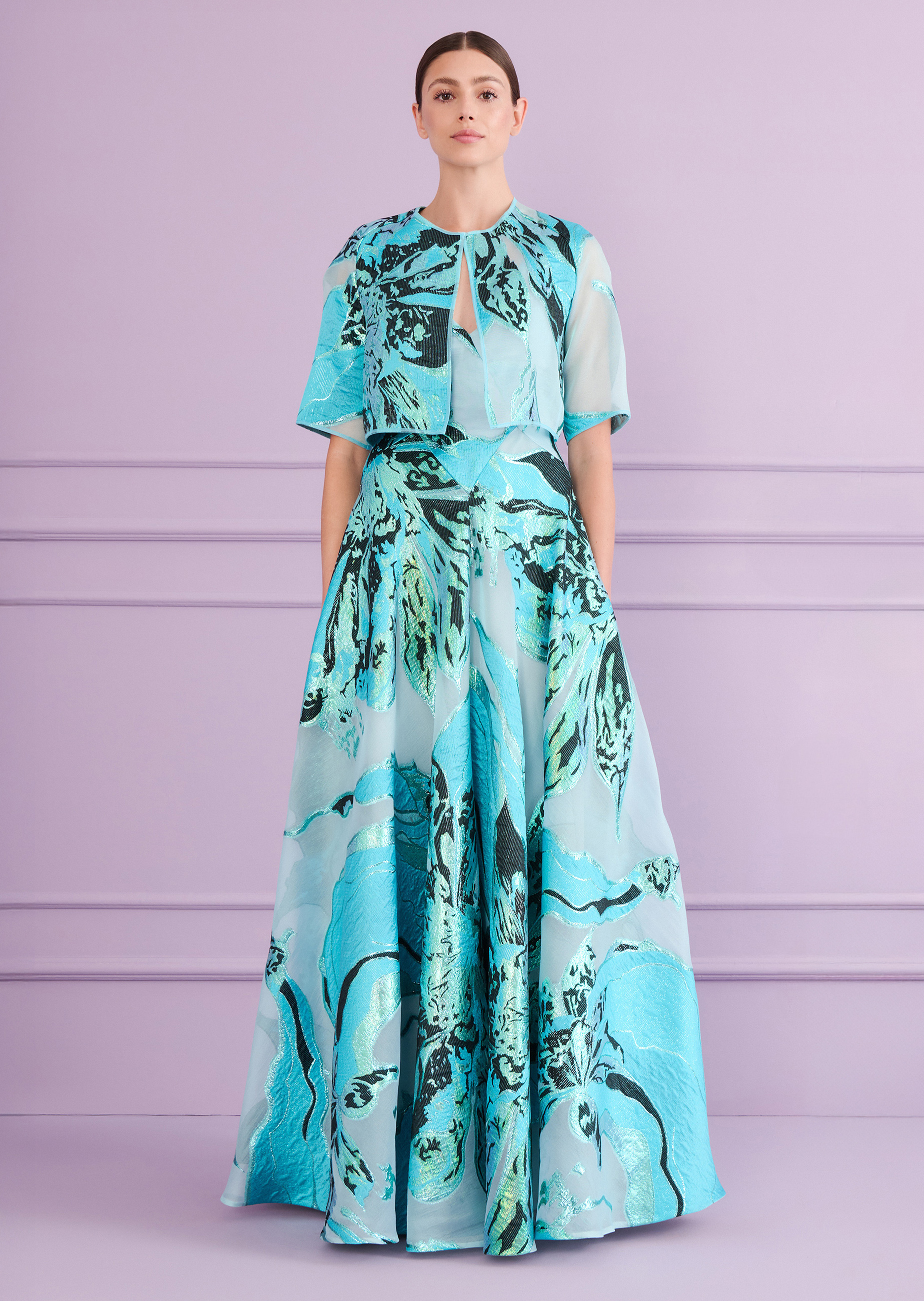 Straight and simple yet so smart: this is not just any little half-sleeve jacket. The breathtakingly beautiful fabric is so striking at first glance, while great details reveal themselves on closer inspection. Raglan sleeves give this classic jacket a sporty note. The boxy fit looks modern but not too casual when teamed with the matching cocktail dress. At the registry office, the jacket is the perfect enhancement to the matching cocktail dress by Talbot Runhof but also looks stunning teamed with more casual looks.