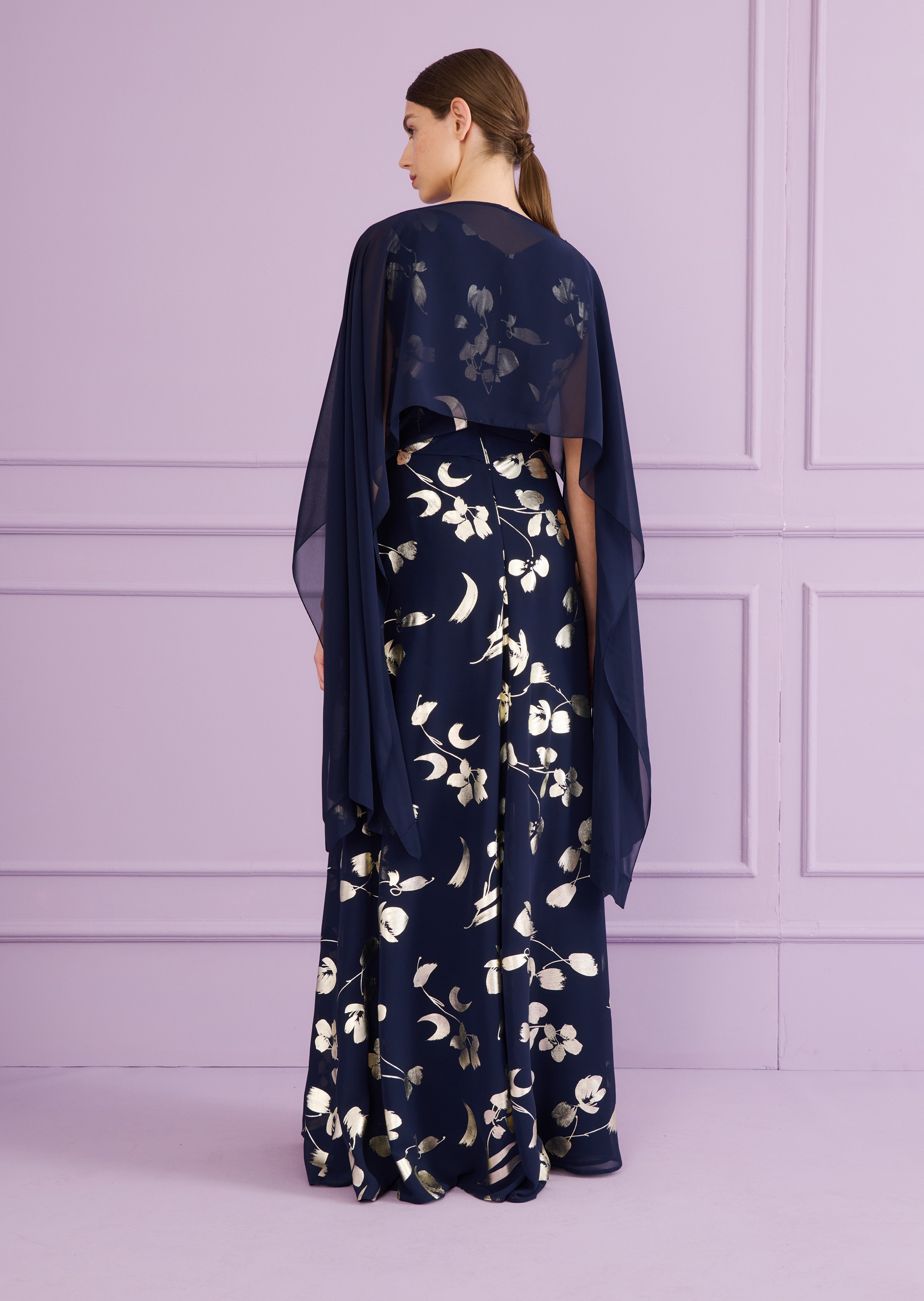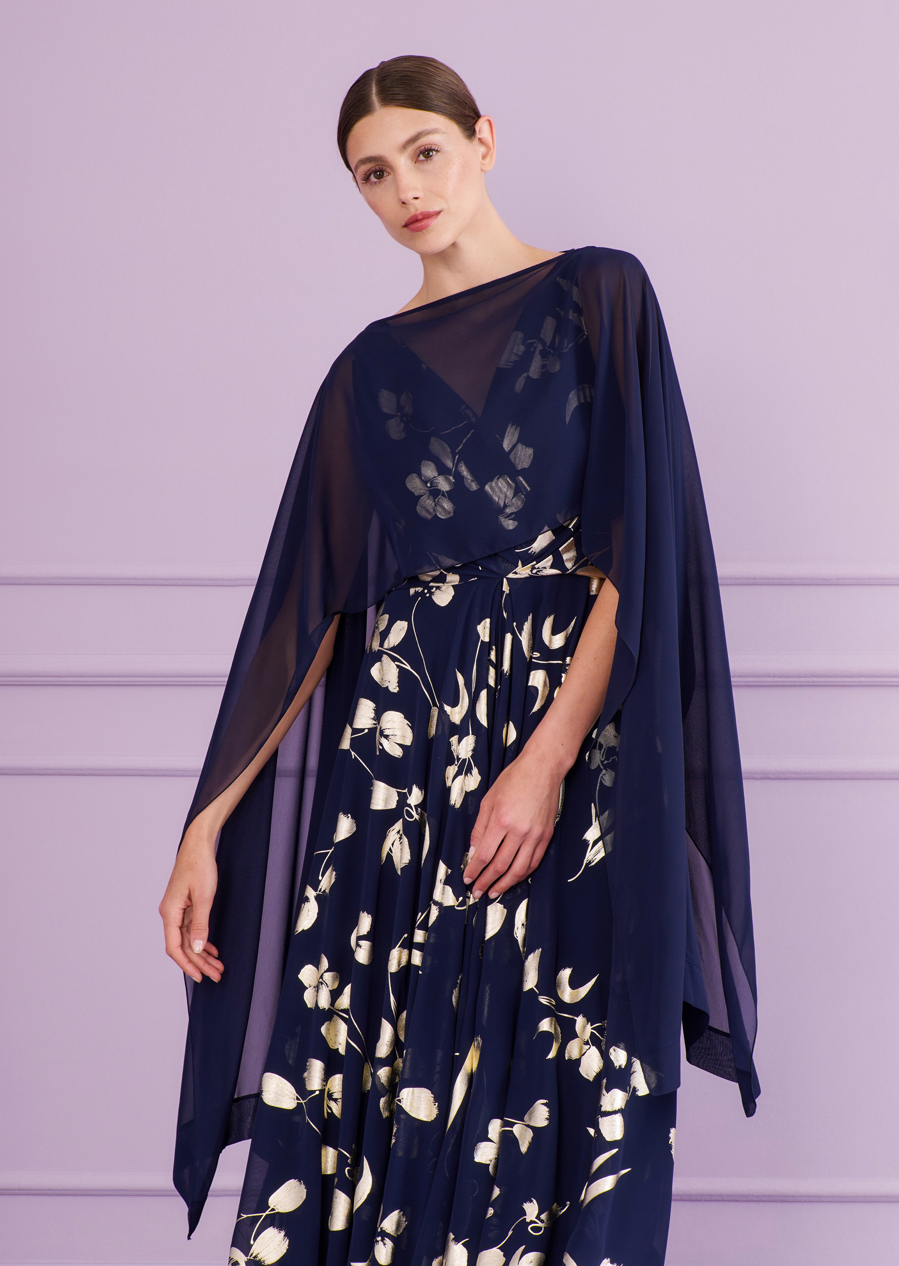 One stole – lots of styling options. This poncho is the perfect companion on cooler evenings or as a subtle way to cover up on more formal occasions. Thanks to the cut, our new stole can be worn in different ways. Simply pull it over your head and drape the flowing voile loosely over your shoulders. Or be a little more creative! Simply fold it over and knot it at the side, either on the front or back. This lets you create an exciting wrap top. There is no limit to the exciting looks you can create, especially in combination with simple evening gowns.