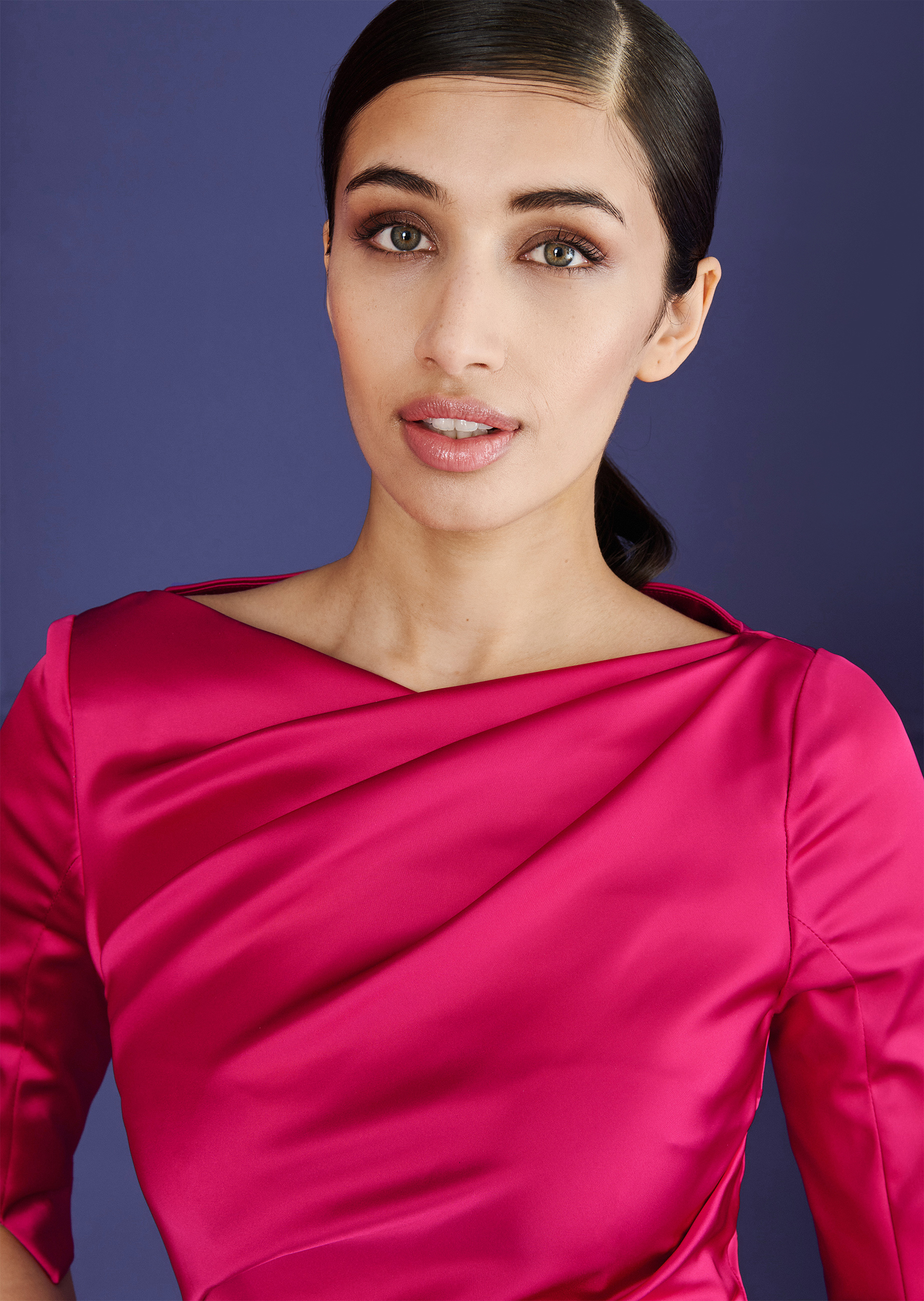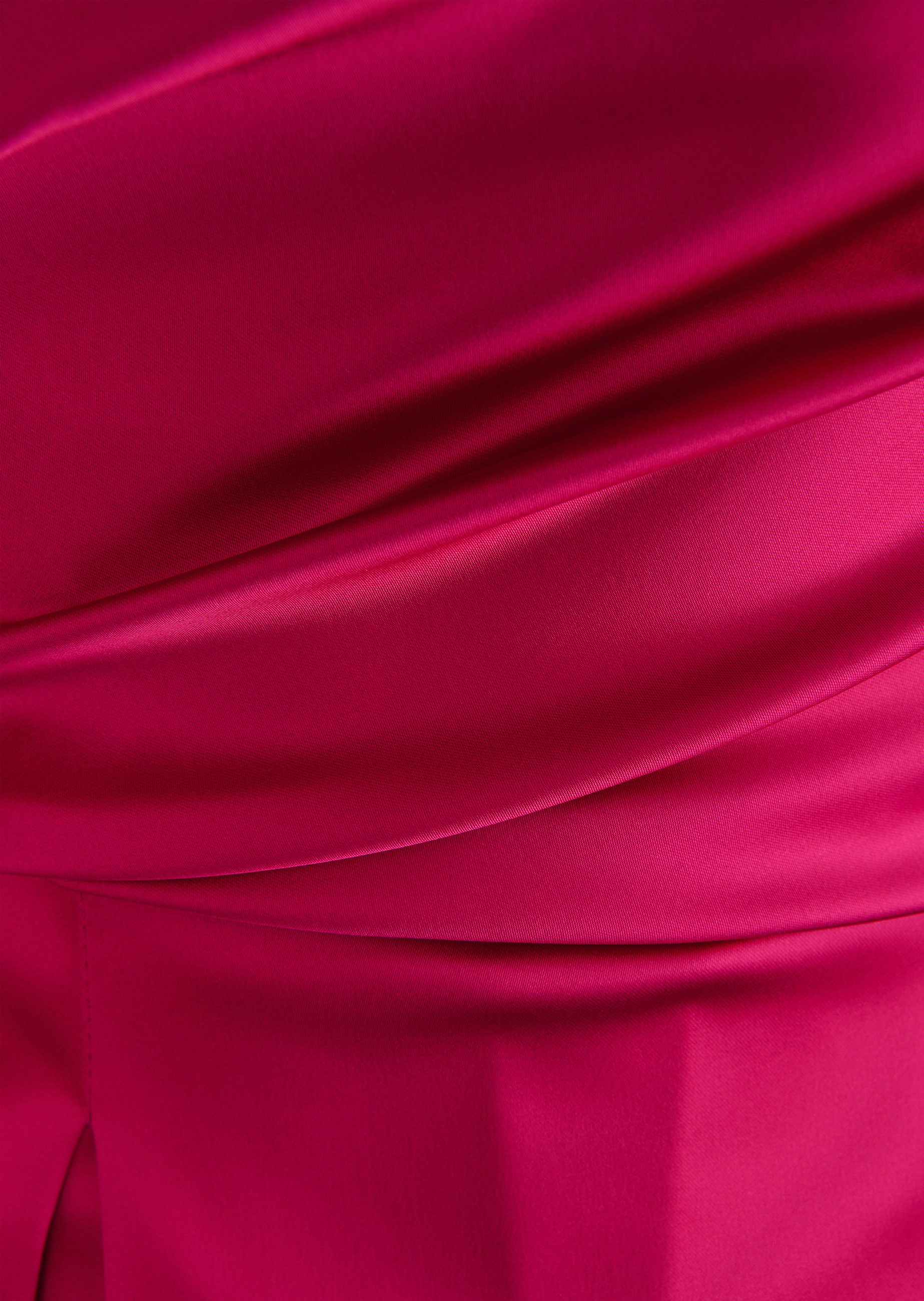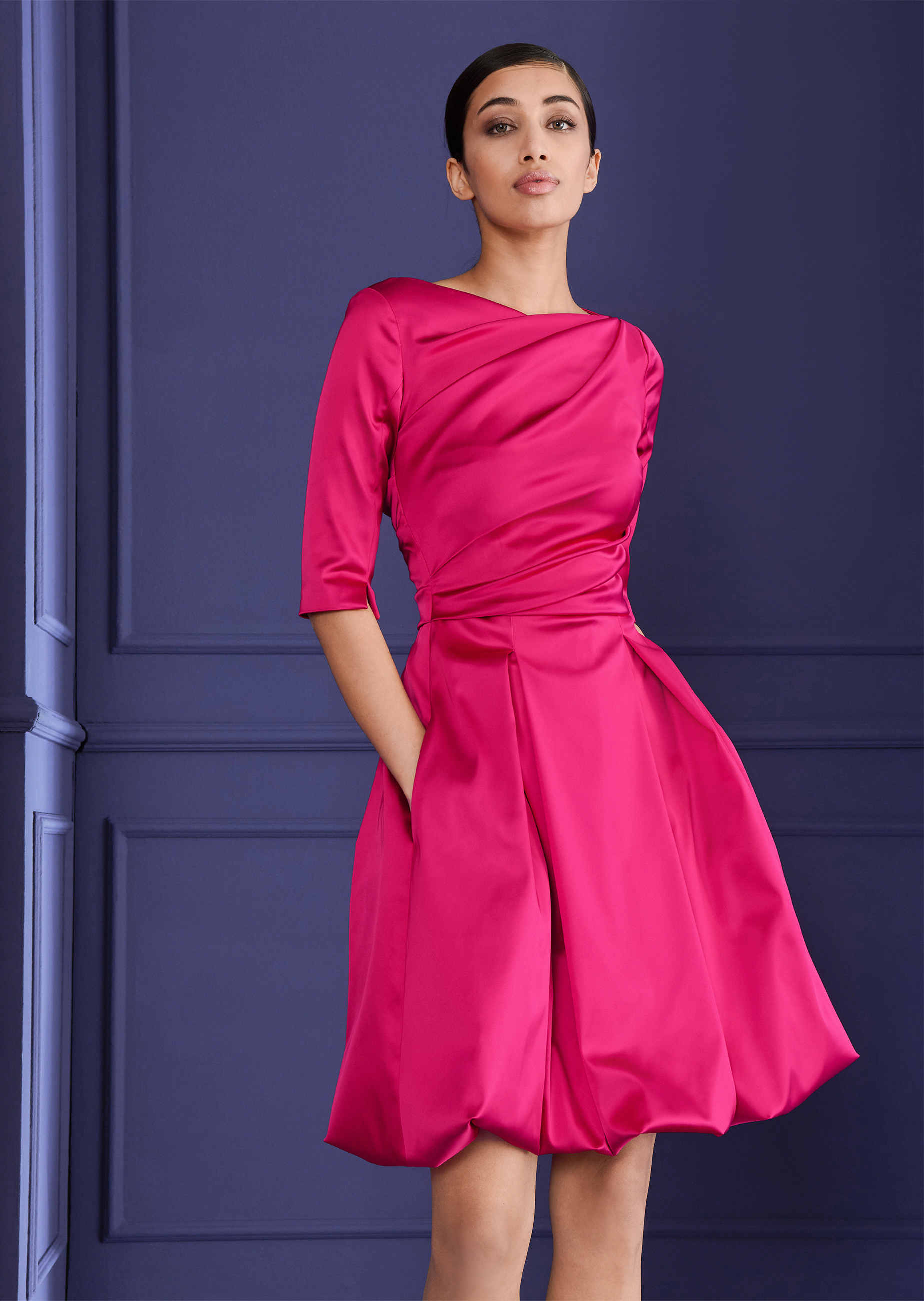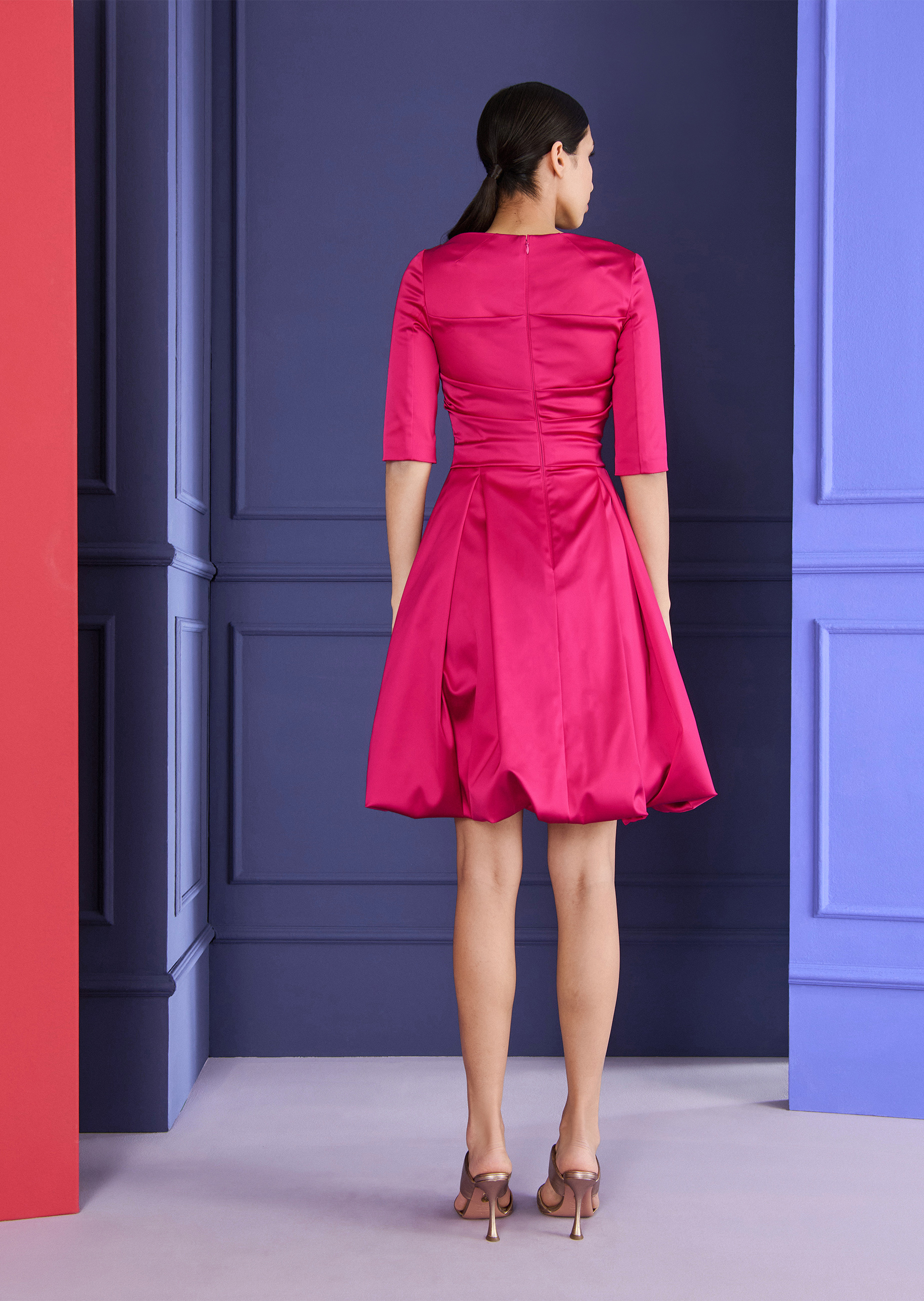 This cocktail dress will take you to new heights and immerse you in new stylistic realms. The sparkling, glamorous material immediately catches the eye. We made this dress from our glamorously shimmering Stretch Satin Duchesse. The knee-length balloon skirt adds an extra air of lightness and gives the piece an excellent base. This also puts extra emphasis on the fit & flare silhouette. Drapes at the center shape the figure. The bateau neckline and short sleeves round off the elegant look nicely, making it perfect for bridesmaids or the mother of the bride at a wedding as well as for big birthday celebrations or other formal events.