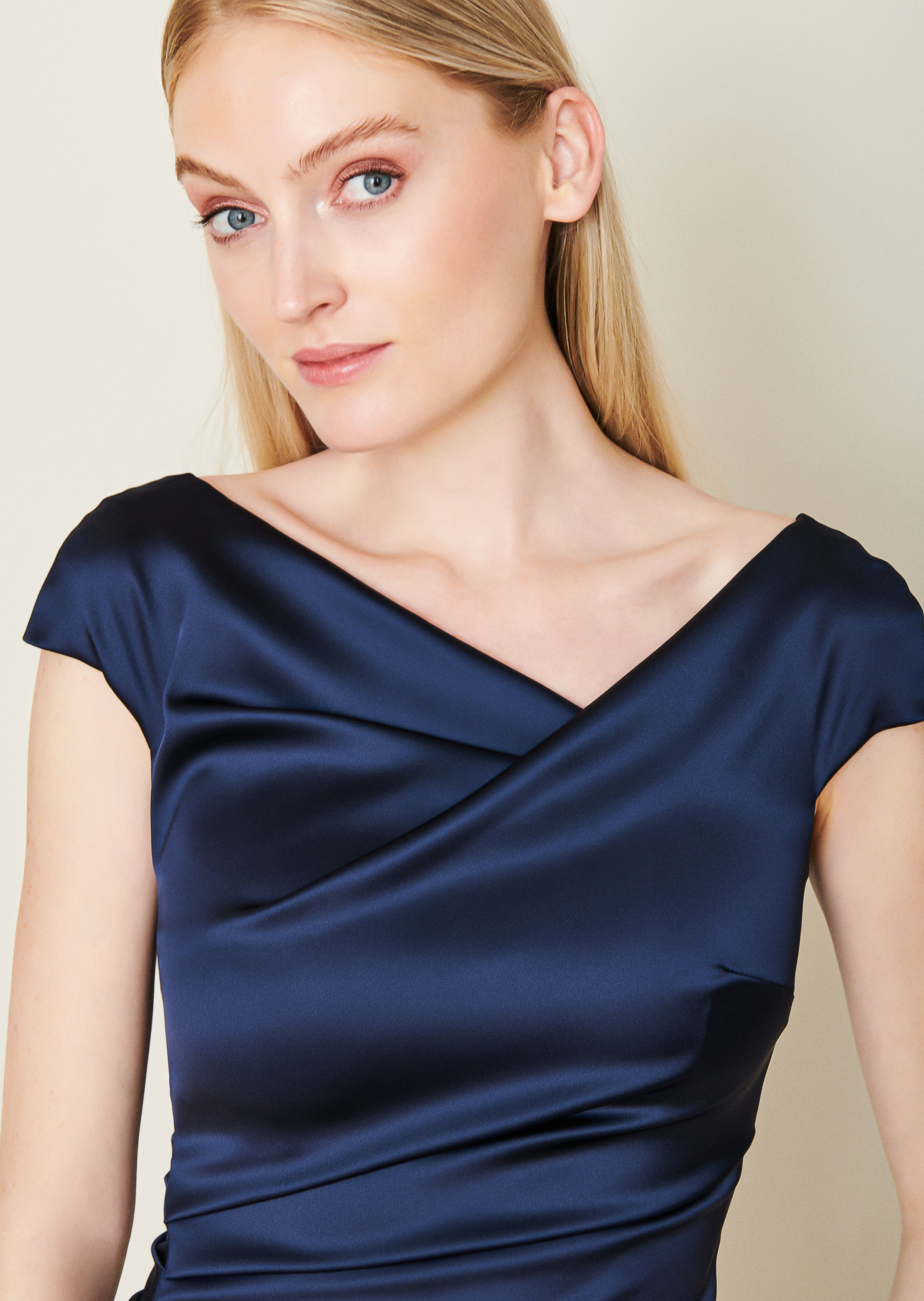 are you attending the captain’s dinner on a cruise ship or the festival in salzburg? roya is your classic dress for life’s special events. made from our bestselling, comfortable stretch satin duchesse material, the iconic talbot runhof pleats of this wonder material in a bright pink color cling flatteringly to your figure. the long sleeves do the rest while a generous slit – that you can easily reduce – fosters sublime sex appeal. combine it with delicate pumps or graceful sandals and wear jewelry to suit the occasion.
