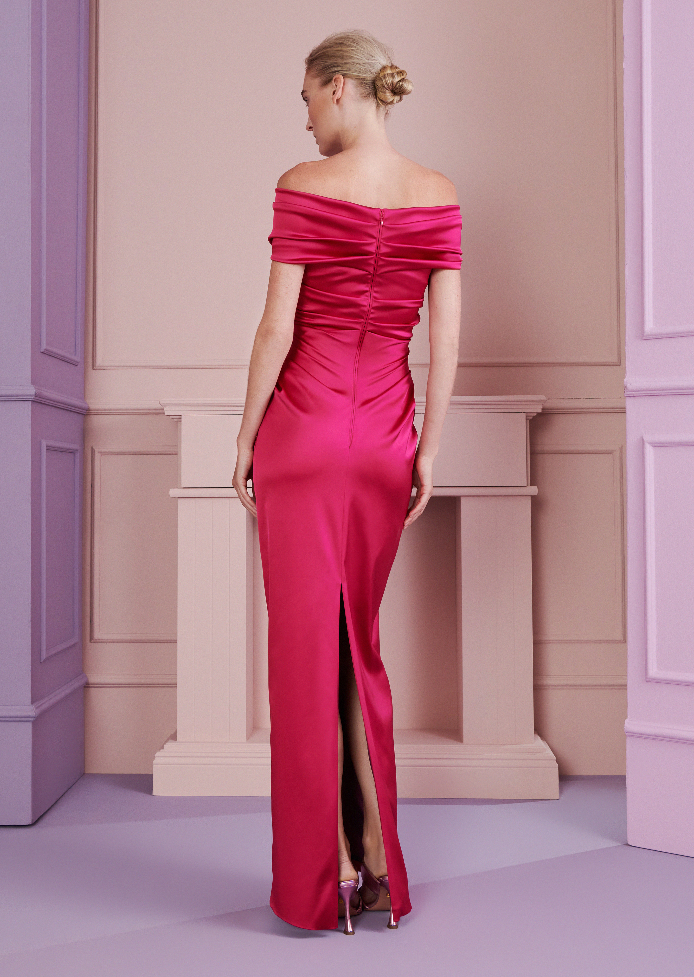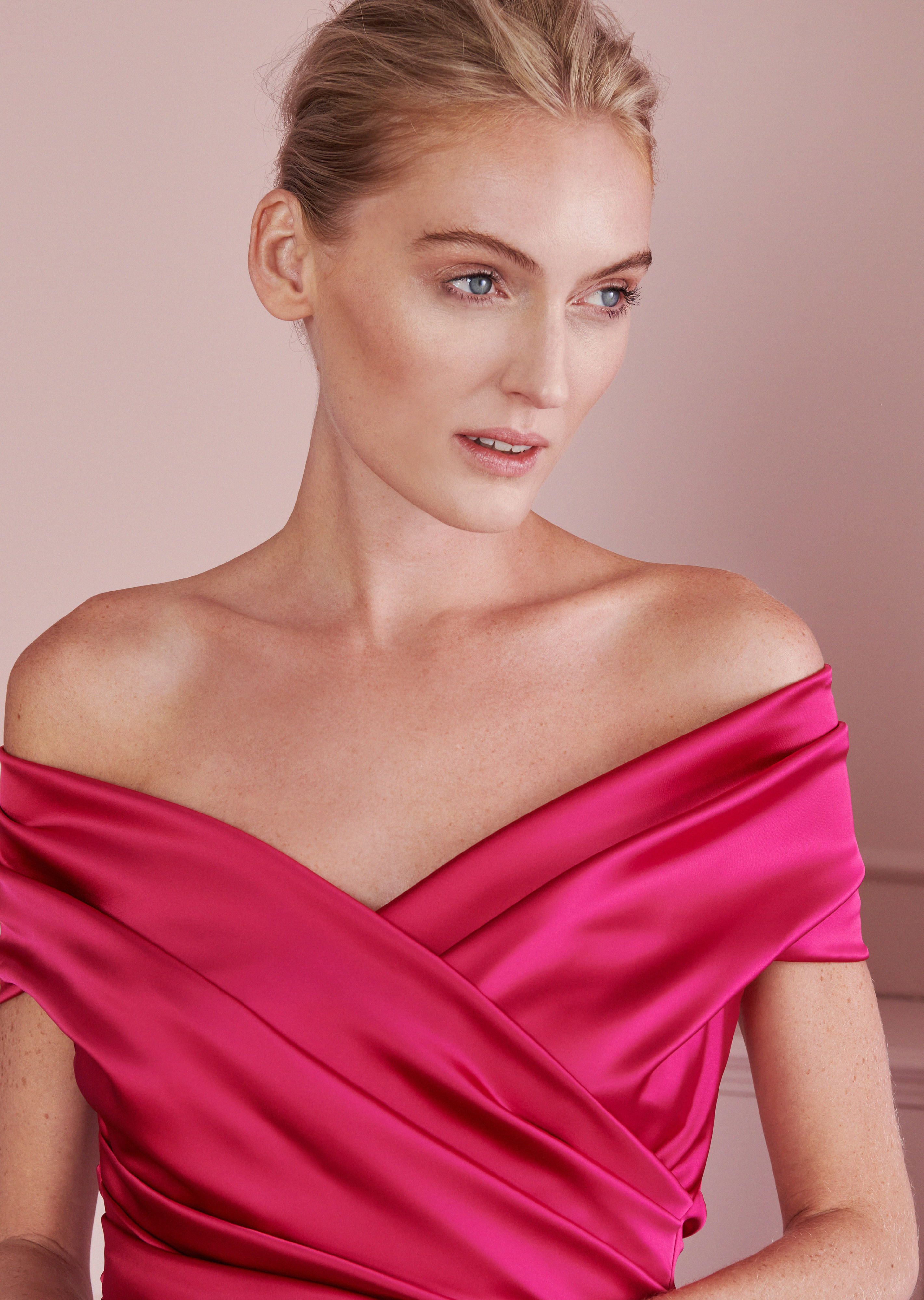 This dress, made of our bestseller material, a shimmering satin duchesse, is going to surprise you again and again. This floor length evening dress captivates first and foremost with the great crisscross draping, which, while not showing too much, tones the shoulders and collarbone emphasizing why this dress seems so exciting in its restraint. The artistic sleeve solution is also a highlight here, which on the one hand is loosely draped, but at the same time simply makes those critical areas under the arm disappear. On top of that our iconic draping naturally narrows your waist. To the festival, that exquisite soiree, or simply on the red carpet this gown will impress almost everywhere.