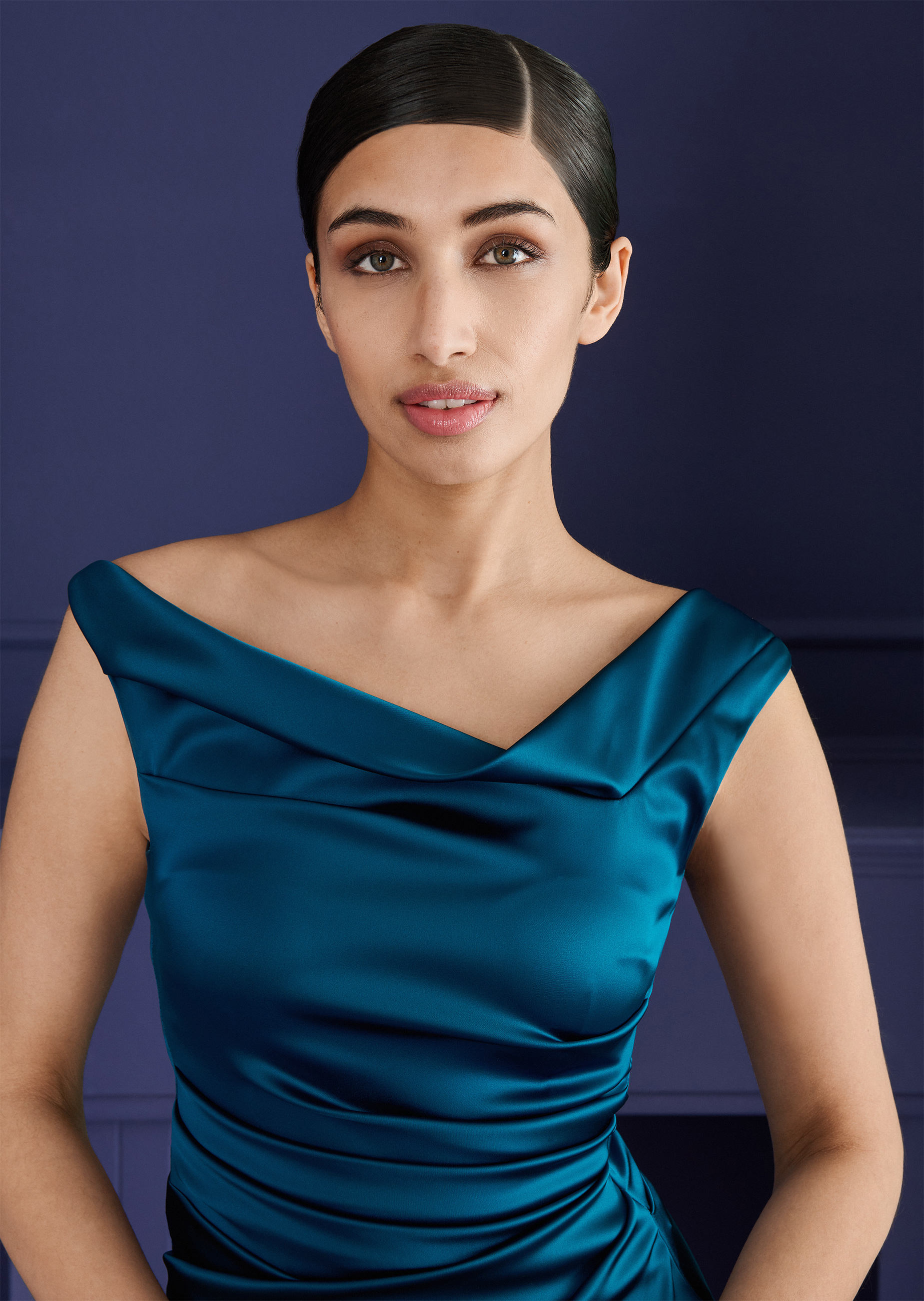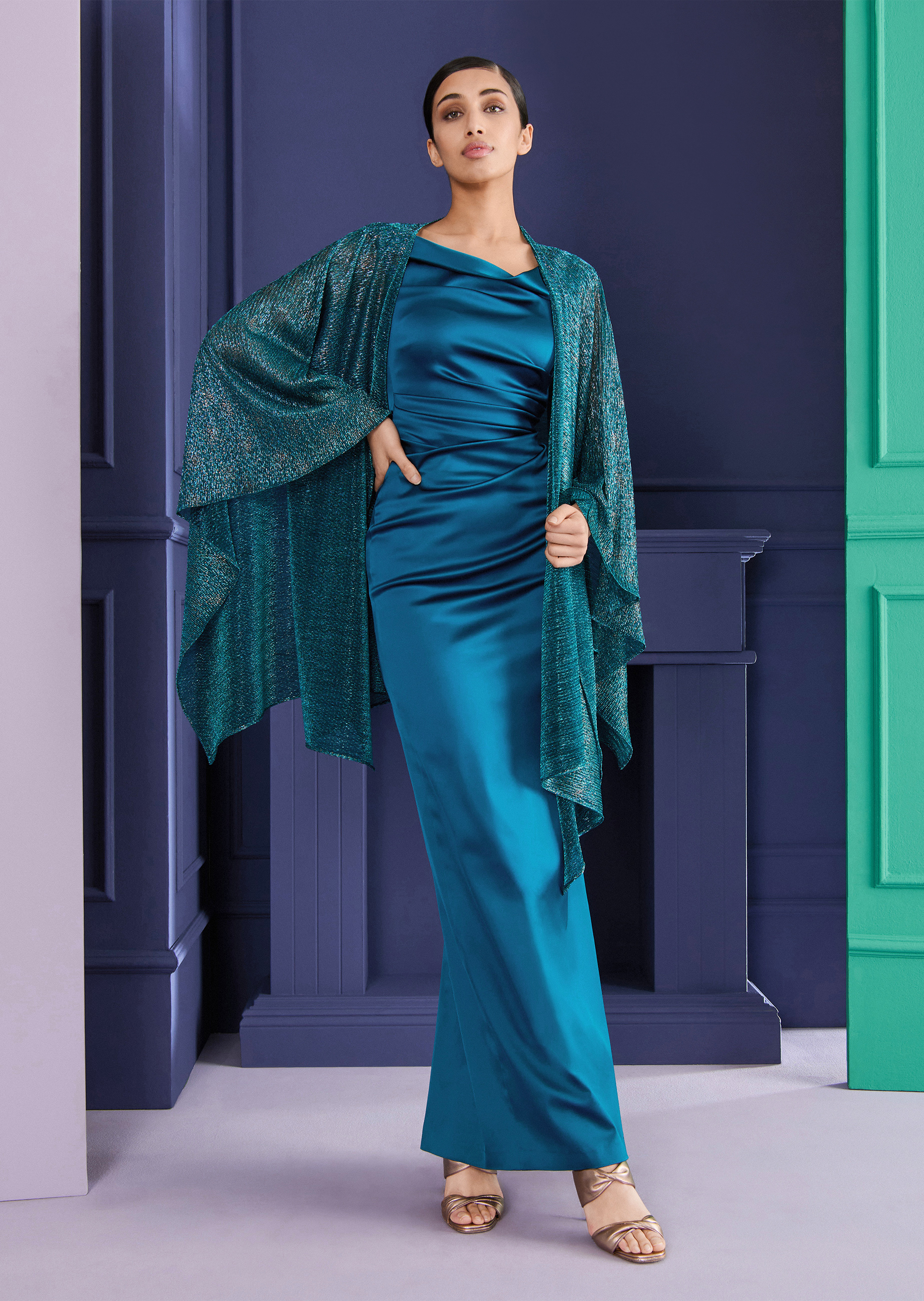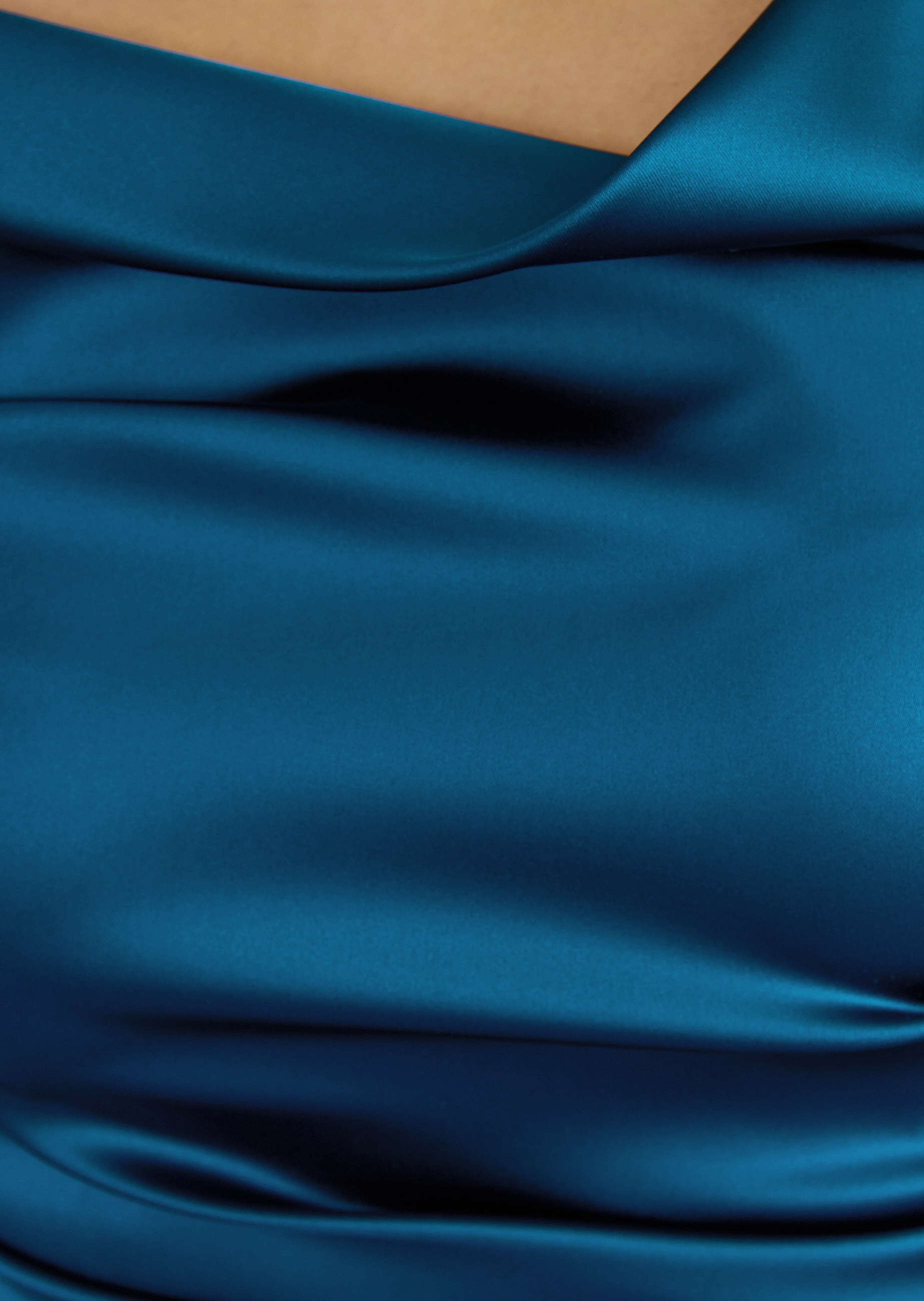 Our new evening gown in glamorous duchesse satin is as pretty as a picture. The narrow, twisted collar traces a sweeping line along the elegant bateau neckline like a delicate brushstroke. Draping accentuates the slim waist. The floor-length skirt section is streamlined, however the slit at the back allows for freedom of movement, meaning that you can also wear this evening gown to any event that involves dancing. Combine this gown with opulent jewelry and accessories as well as one of our delicate chiffon stoles for a ball. For an elegant banquet, on the other hand, keep it simple with heeled sandals and subtle jewelry.