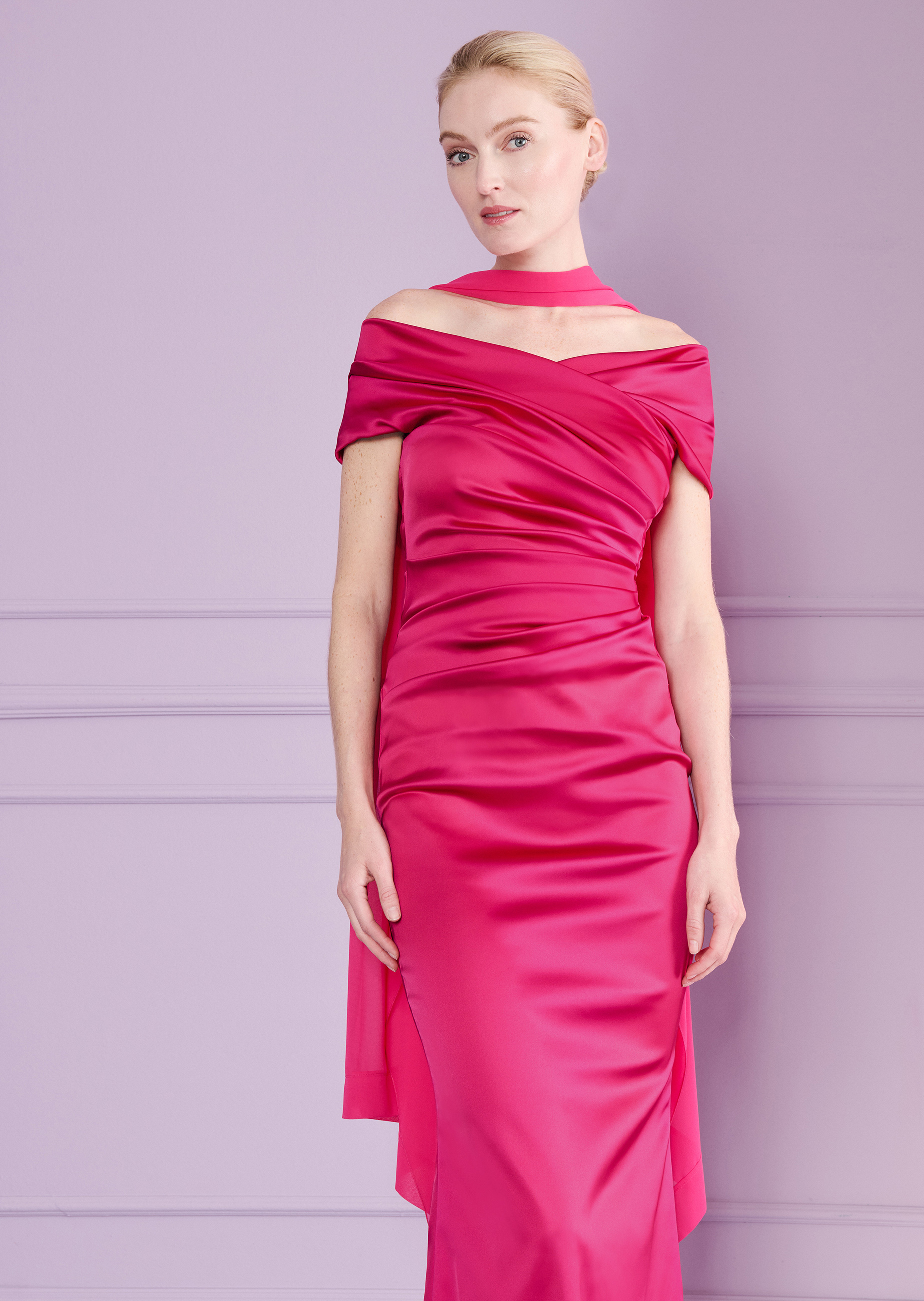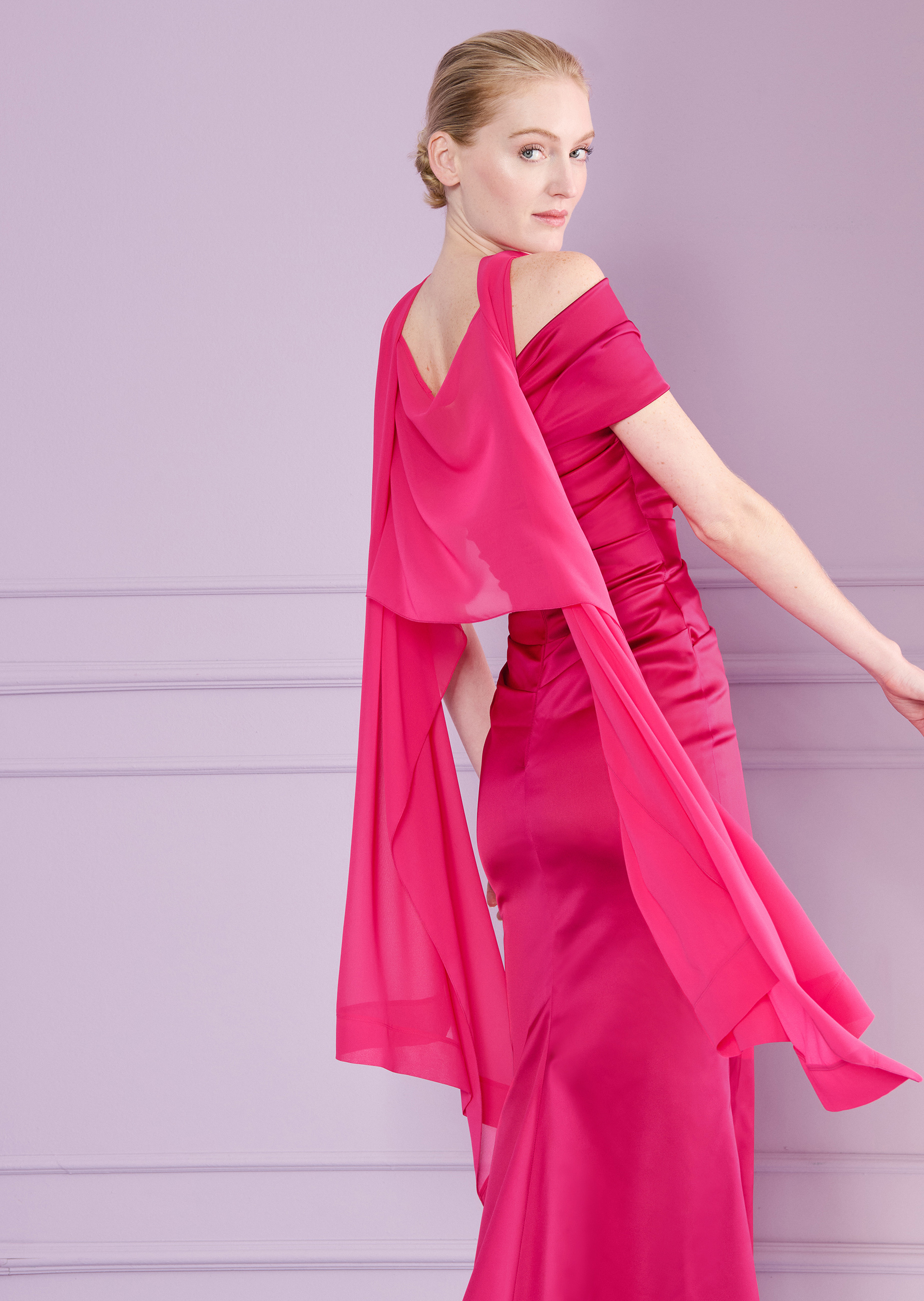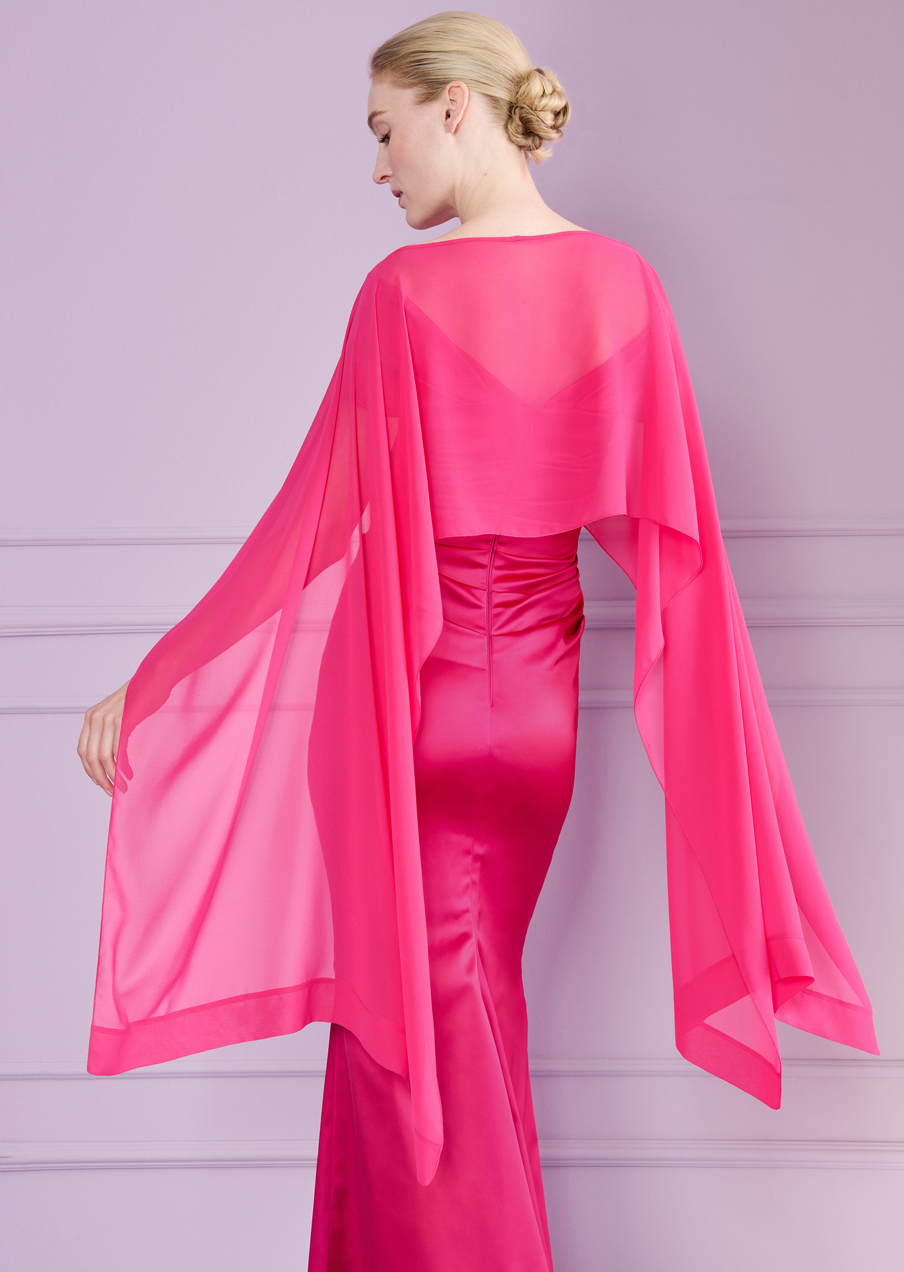 One stole – lots of styling options. This poncho is the perfect companion on cooler evenings or as a subtle way to cover up on more formal occasions. Thanks to the cut, our new stole can be worn in different ways. Simply pull it over your head and drape the flowing crêpe satin loosely over your shoulders. Or be a little more creative! Simply fold it over and knot it at the side, either on the front or back. This lets you create an exciting wrap top. There is no limit to the exciting looks you can create, especially in combination with simple evening gowns.