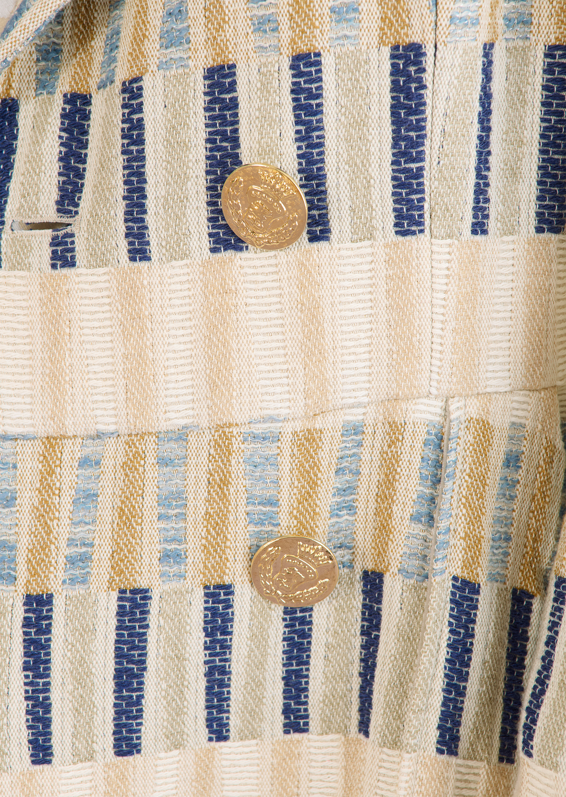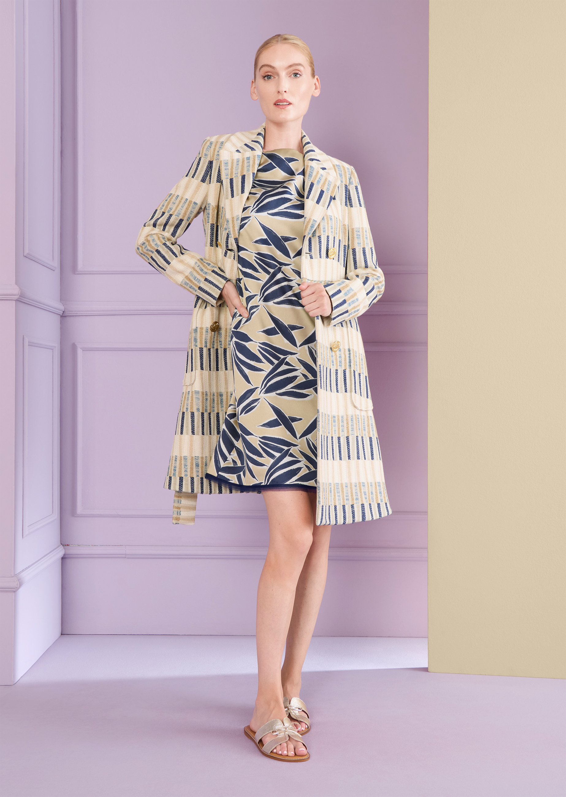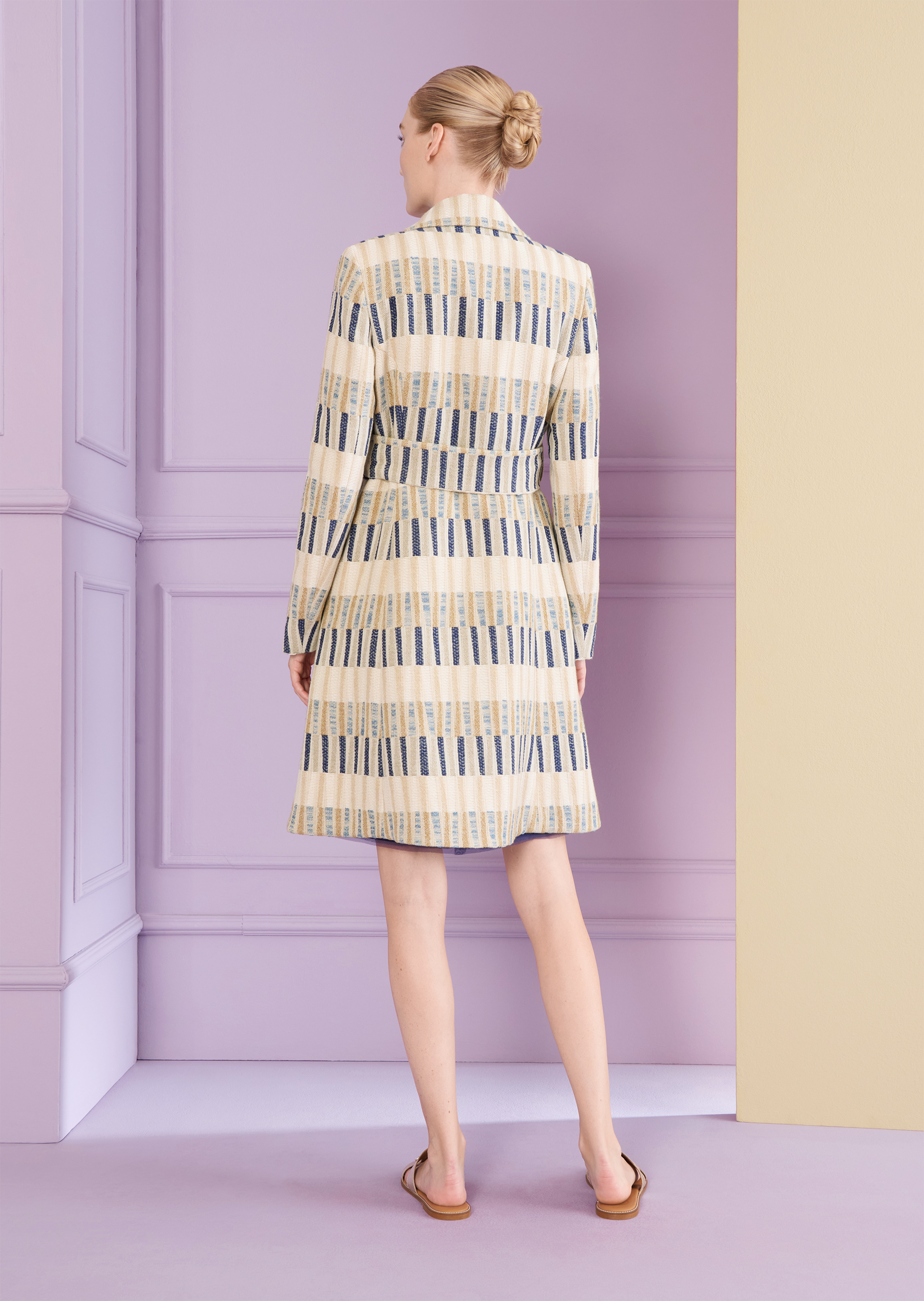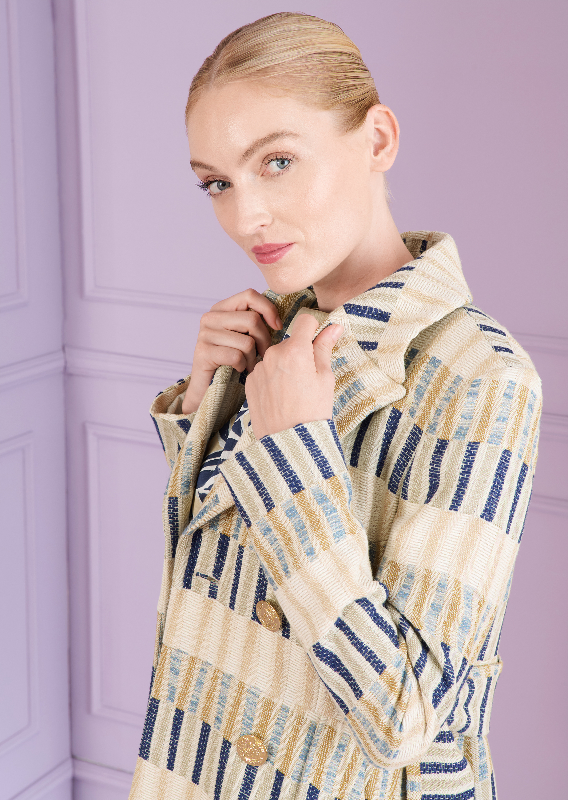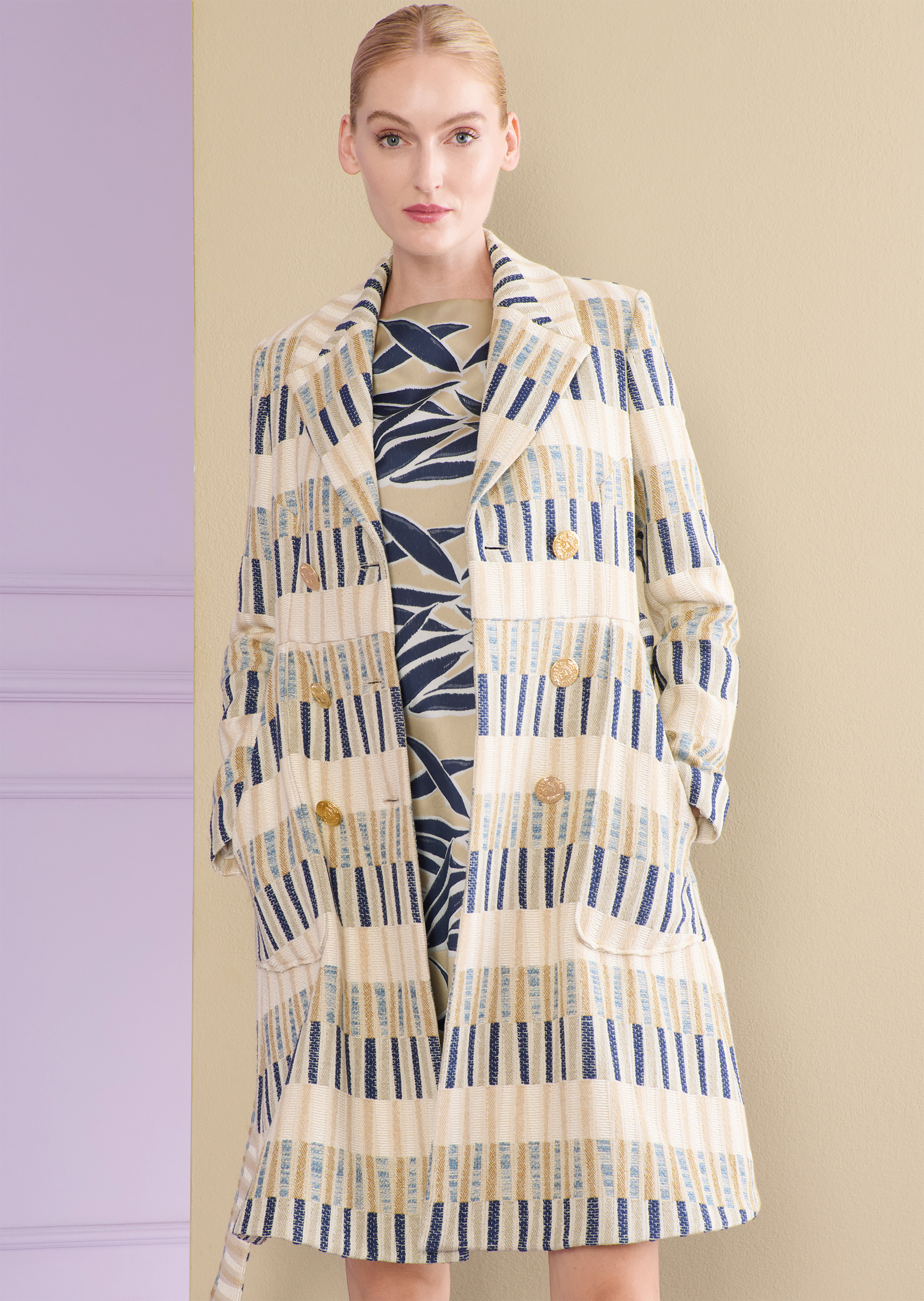 With this lightweight summer coat made from a breathtakingly beautiful cotton jacquard, you can skip the hassle and jump straight to a sensational look. We kept the silhouette feminine with a defined waist that flares out slightly towards the bottom. Meanwhile, the double-breasted coat also features a wide lapel, stylish fringing and low patch pockets. This coat is all you need for a cool look on a casual stroll through the city…