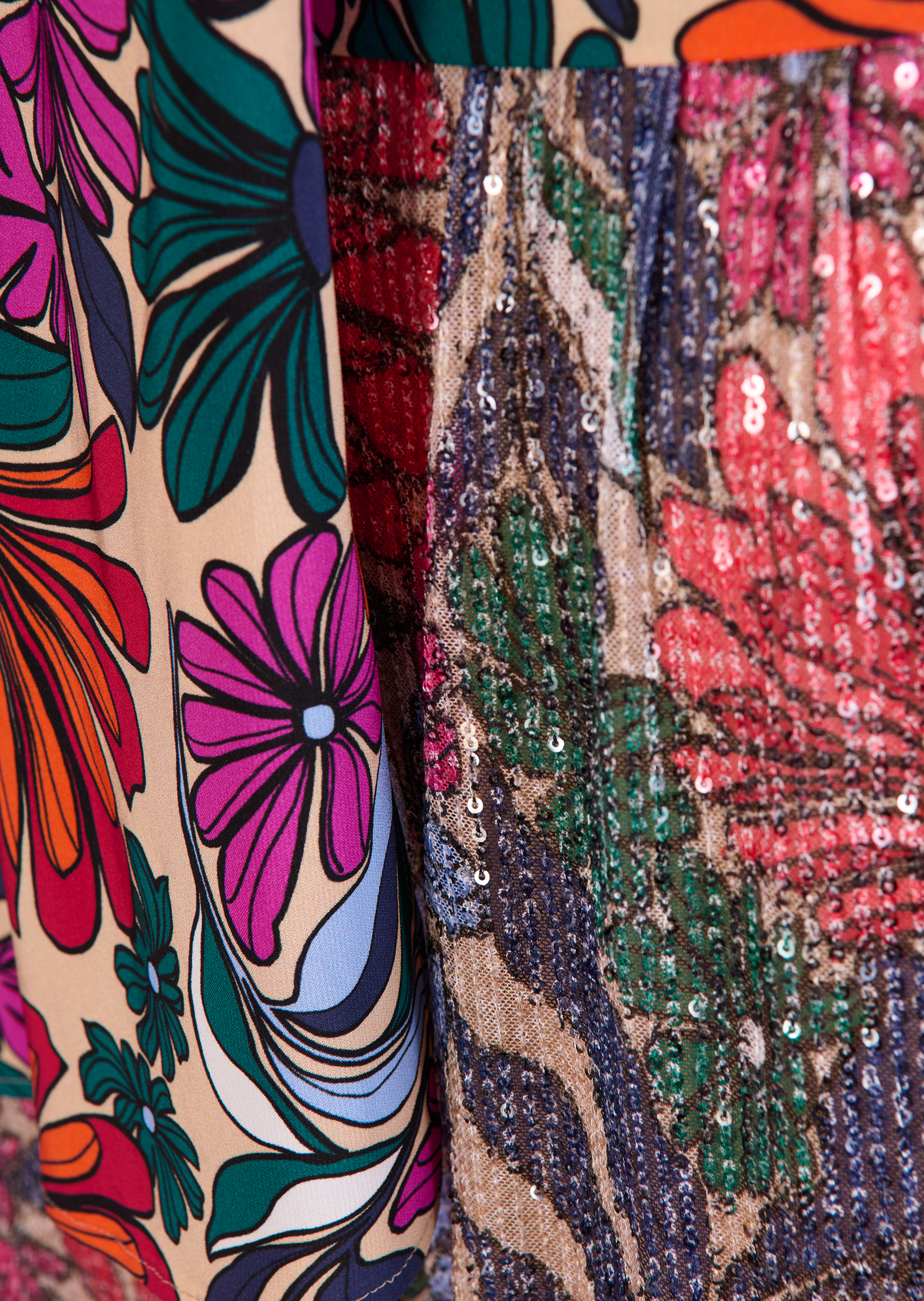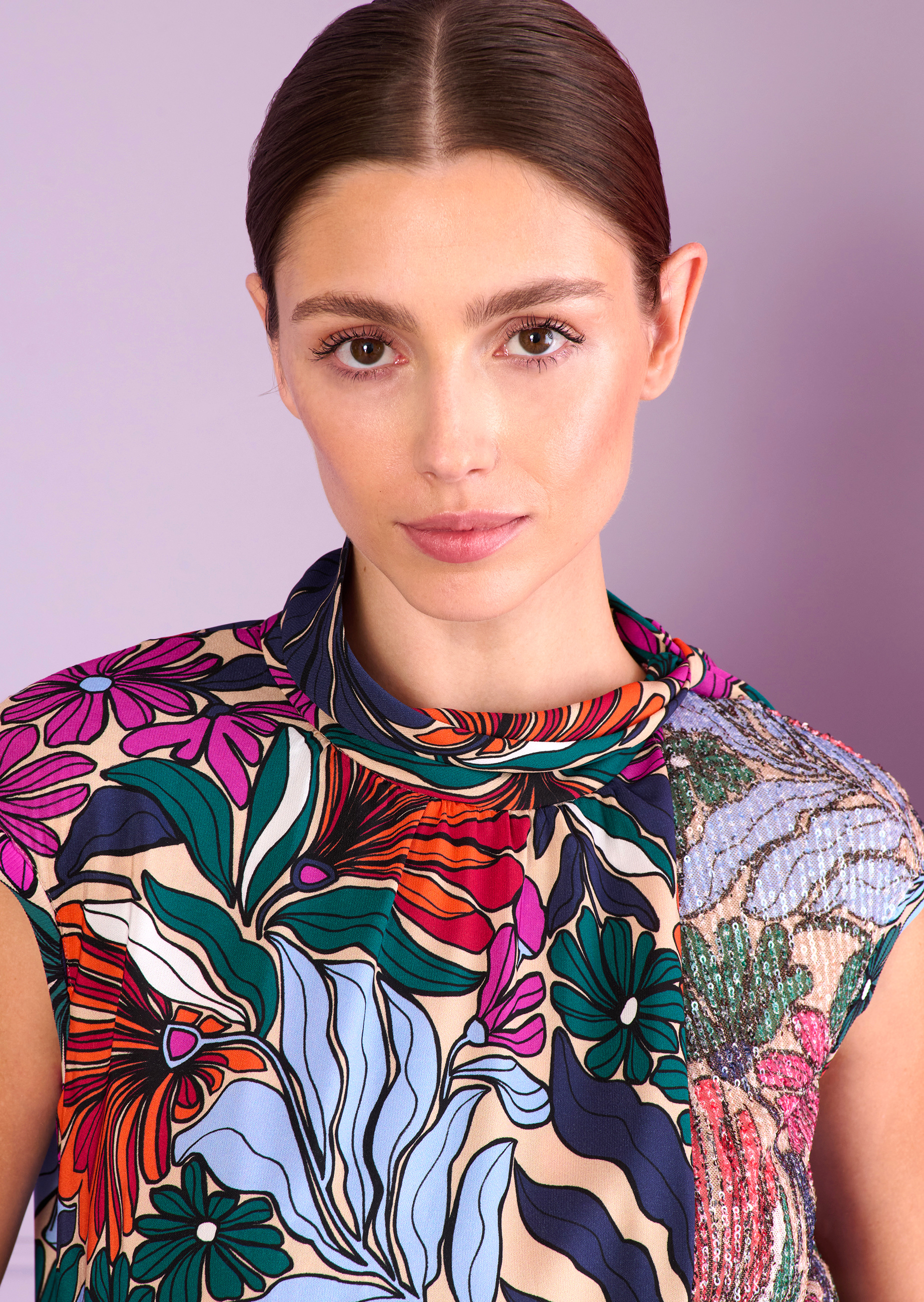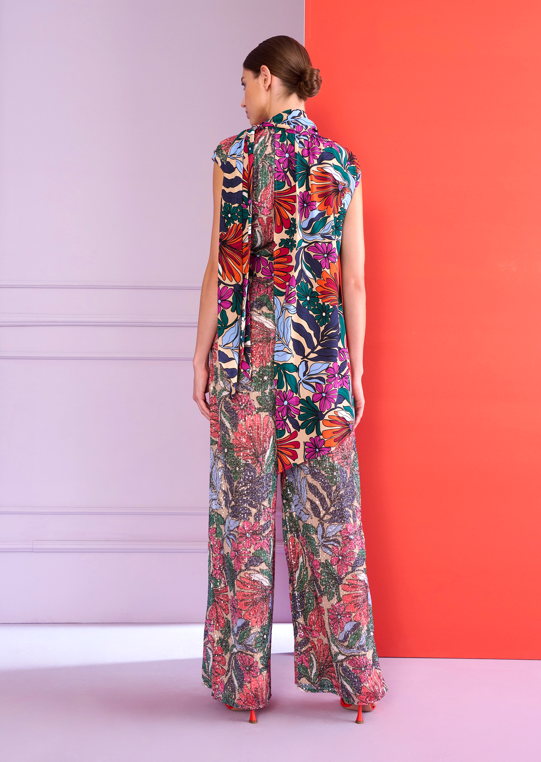 Cozy couture! Who says couture has to be complicated? Our new jumpsuit proves that the opposite is true. The cut is casual yet runway-ready, extravagant yet relaxed. It almost looks like a two-piece set. The top has a flowing, asymmetric ruffle and the stand-up collar is graced with a statement pussycat bow. The leg has a wider cut in a modern midi length. As well as being incredibly comfortable, the design invites you to wear your most exciting pair of stilettos. This piece is made from flowing, easy-to-wear tulle with a floral pattern. Spread the good vibes at your next evening event and dance into the early hours with ease.