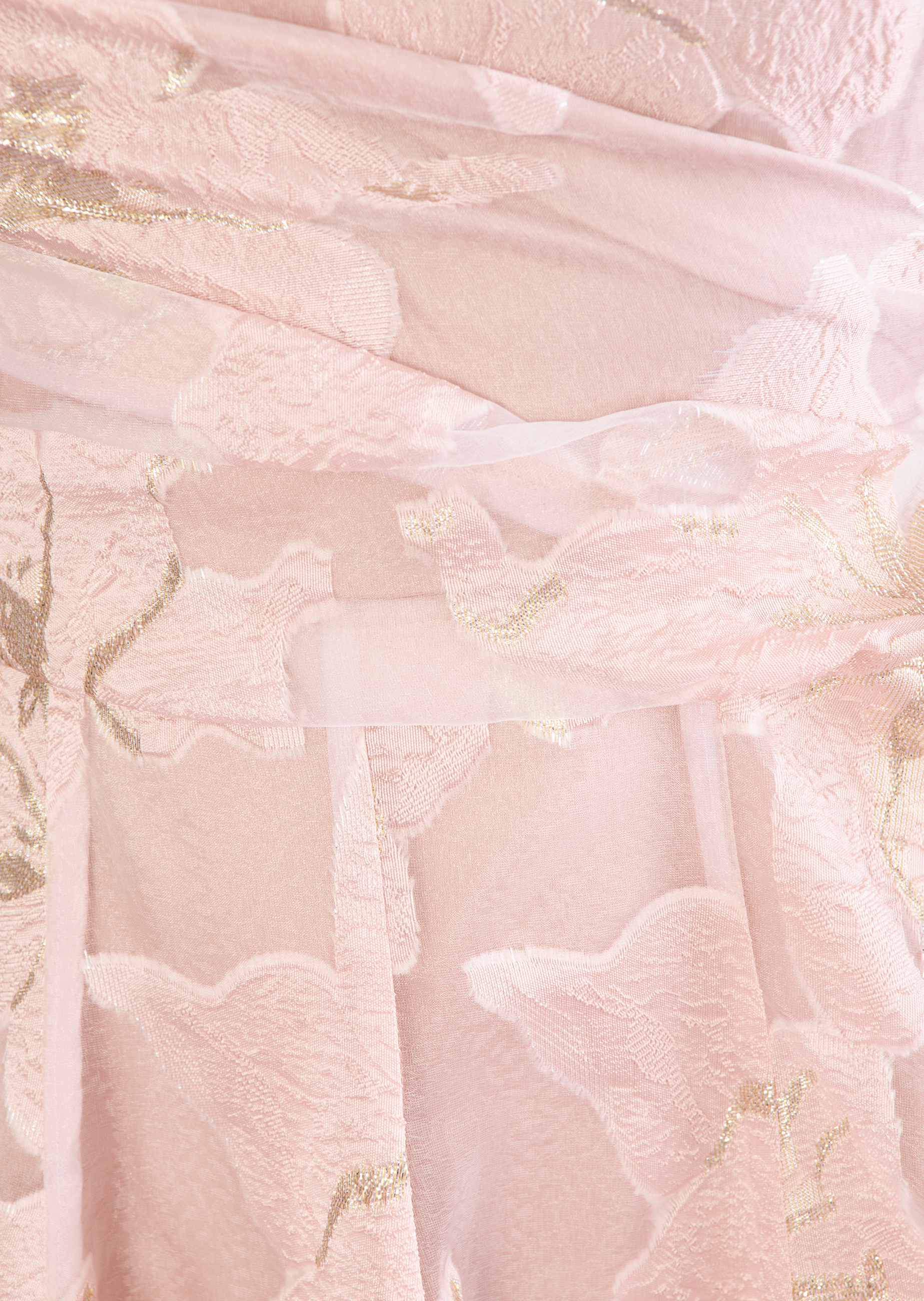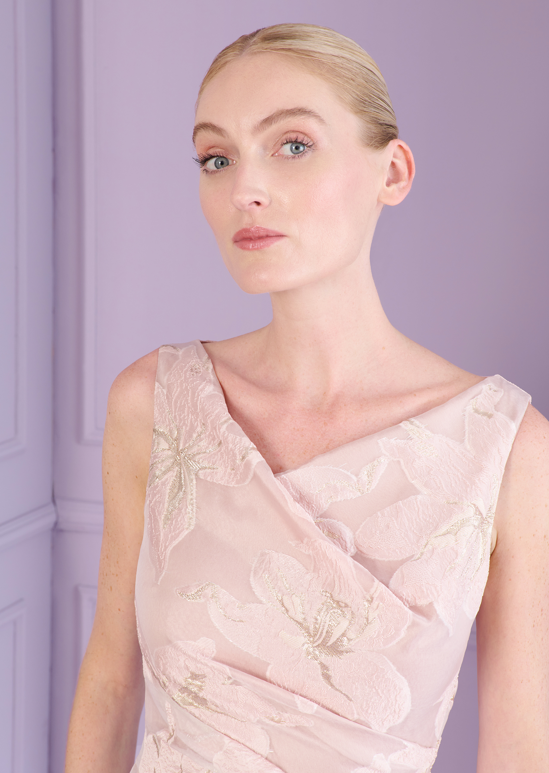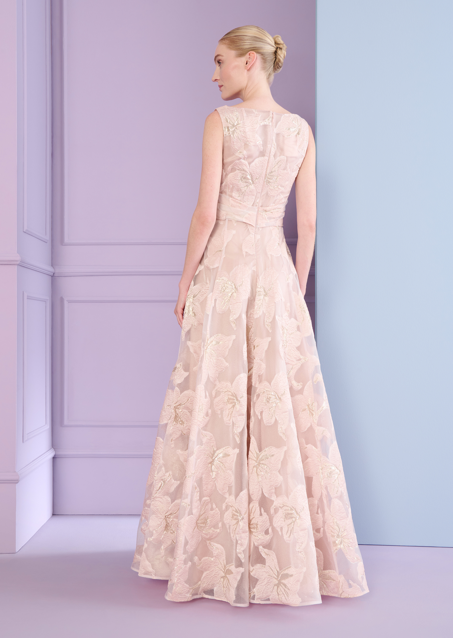 Our designers have concocted a truly feminine and effective design. This evening gown features a beautiful, get-you-noticed, accentuated neckline. Here, the shoulder strap lies directly on the shoulder, providing both security and freedom of movement. Sophisticated draping accentuates the narrow waist. The wide skirt sways beautifully with every step. However, it is the material, a luxurious organza jacquard, that really makes this gown stand out. This exciting look will ensure that the first dance is all yours, be it at a wedding or an opera ball!