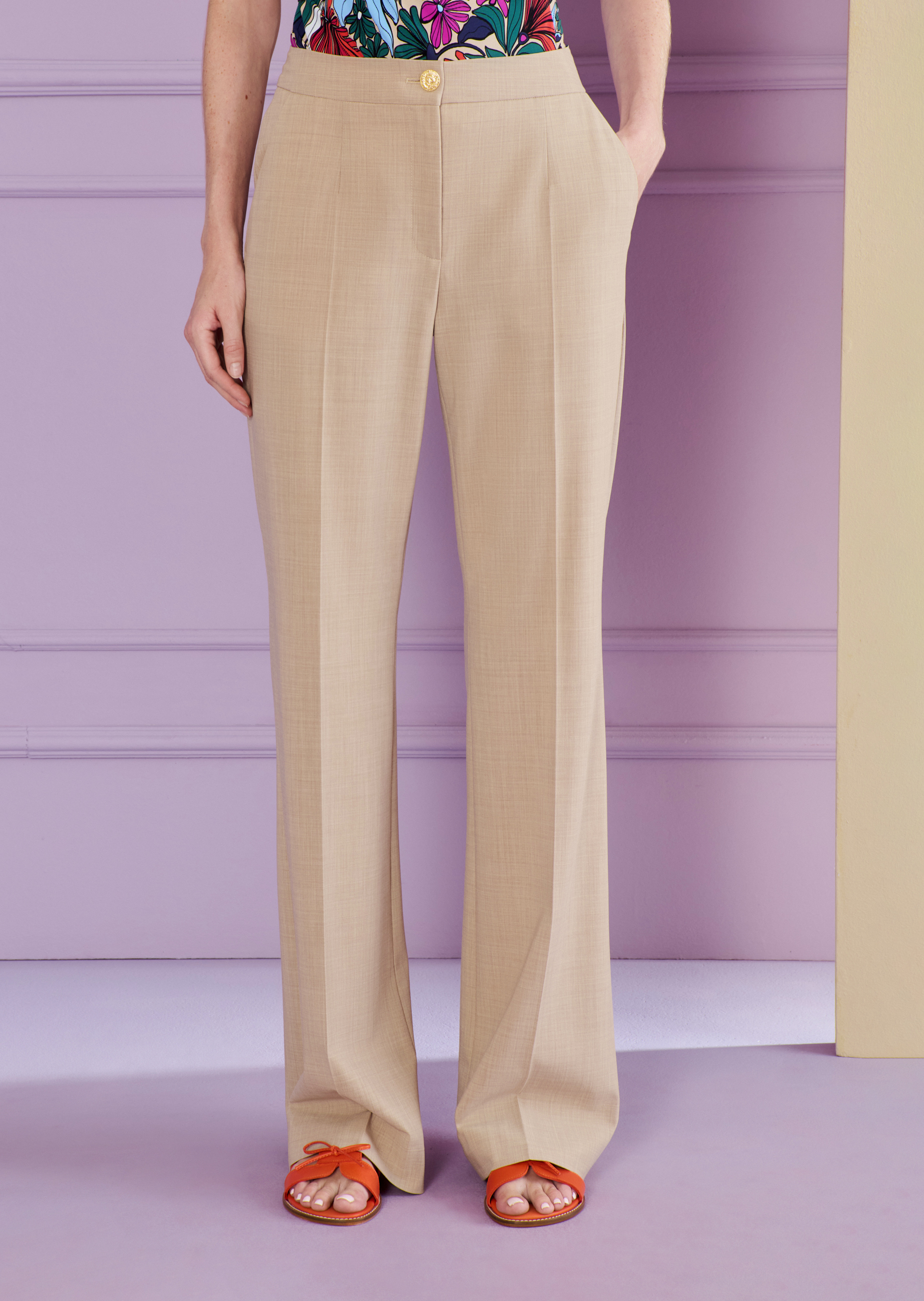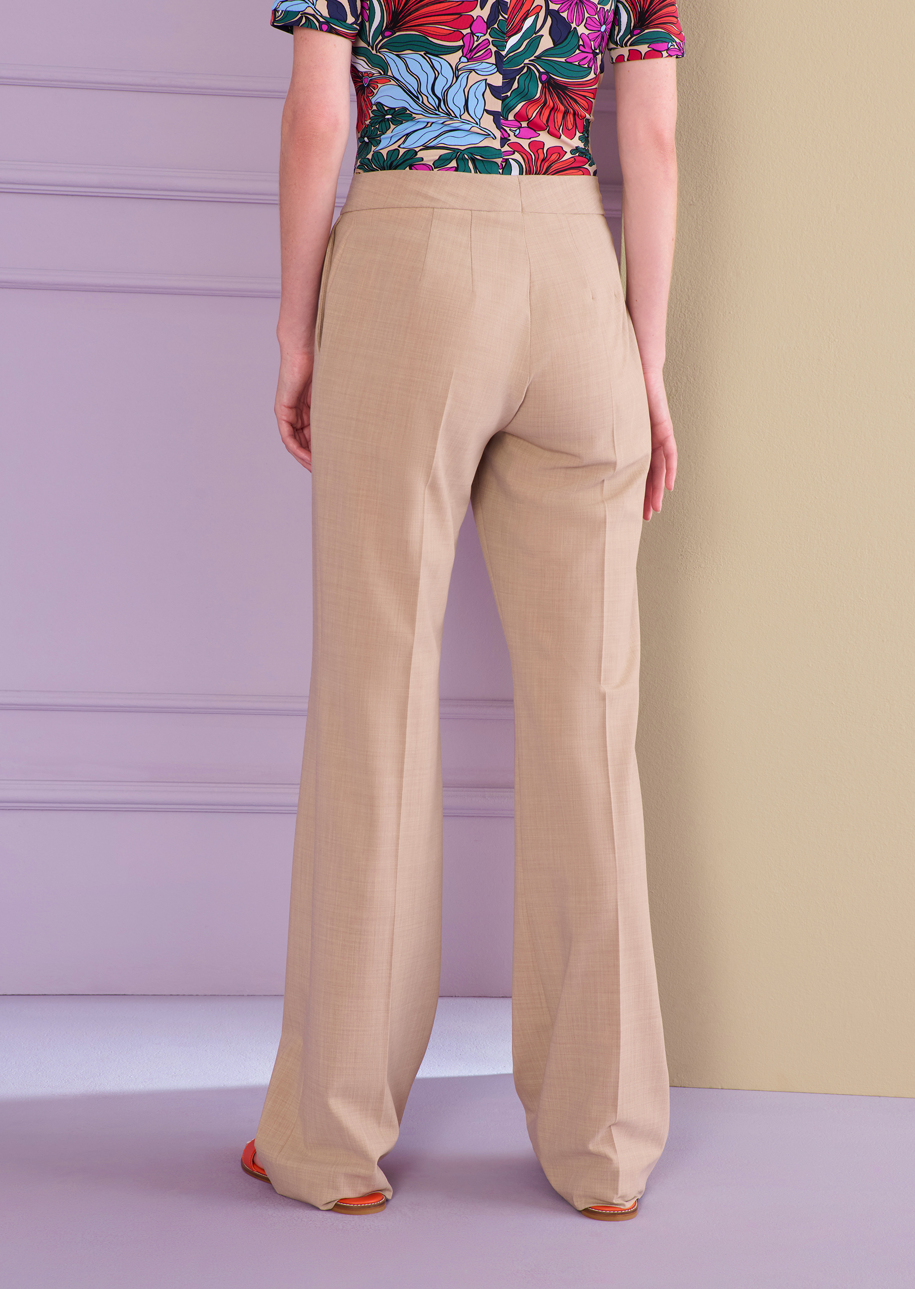 Legs like a supermodel! Our elegant trousers, made of a comfortable virgin wool stretch, literally flow down your body like a flattering compliment; especially because of a crisp cut around the butt. On top of that the practical pockets as well as trouser pleats make the classic tailoring look functional. Wear our style in combination with the matching blazer to the office or to the next important art fair. Combined with a blouse and flat shoes, you’ll be amazed by their versatility.