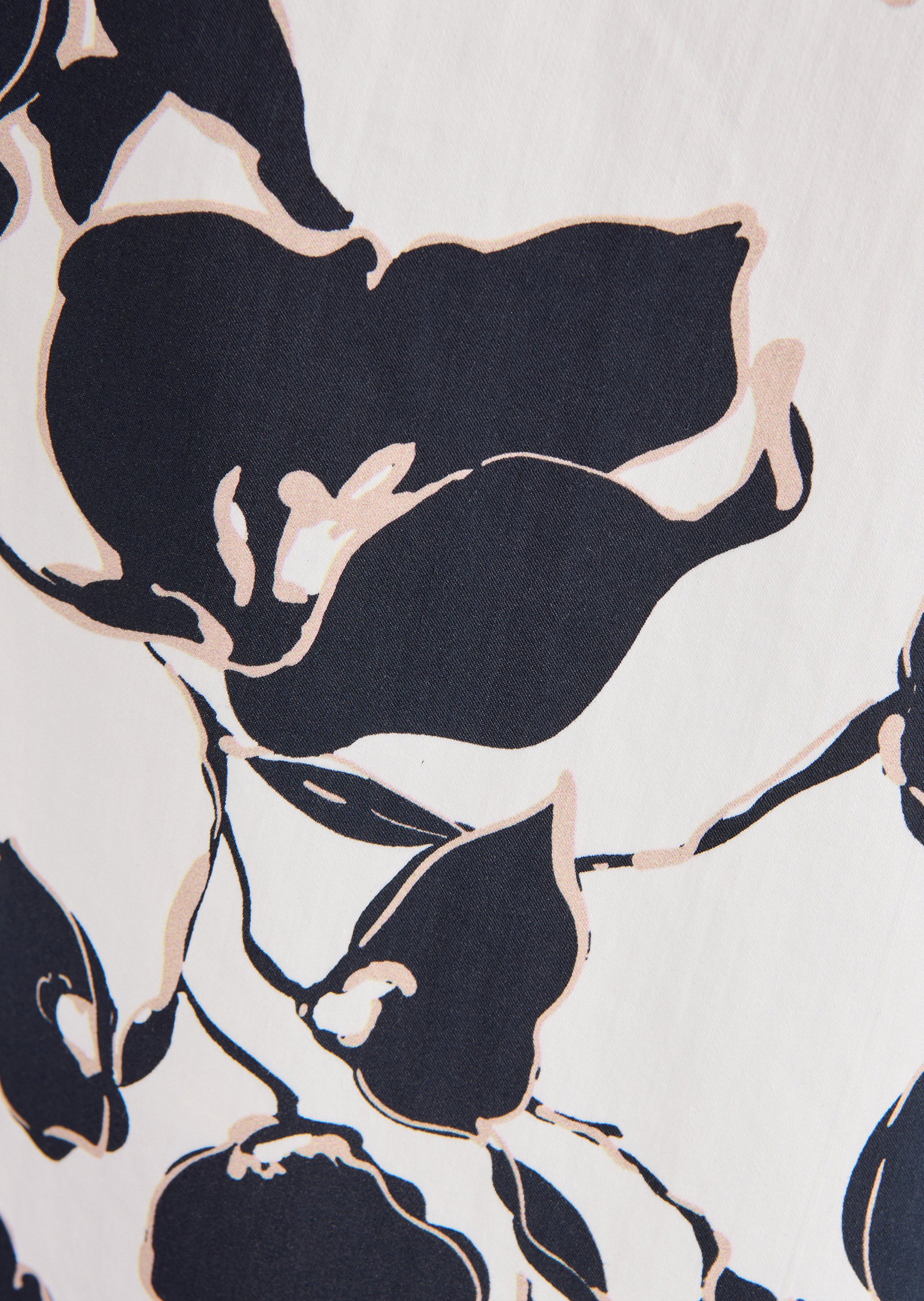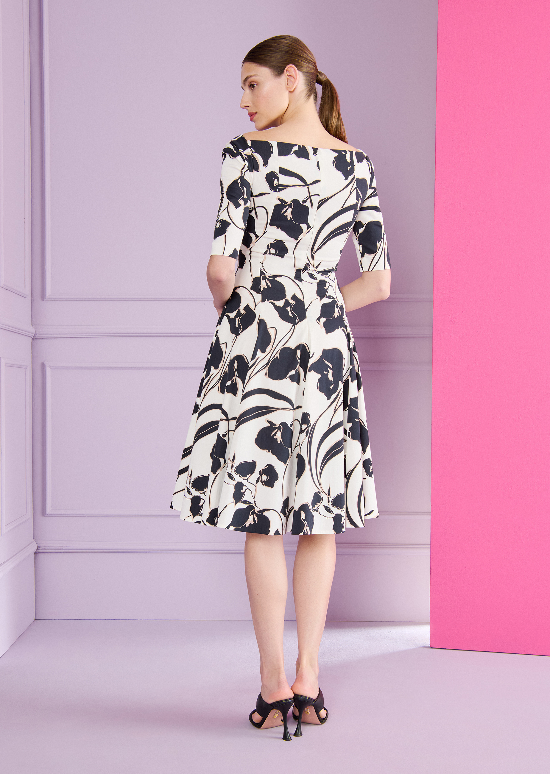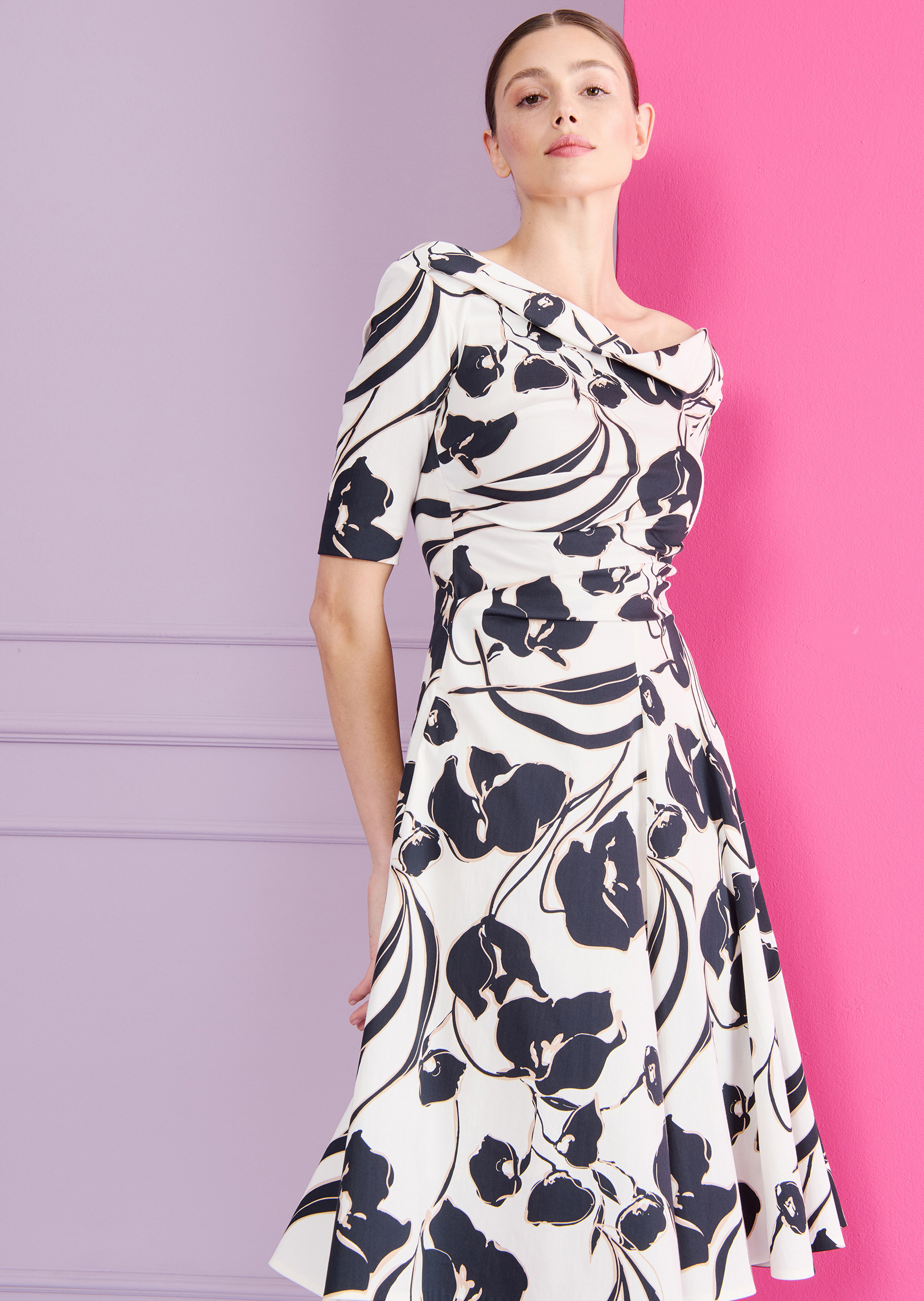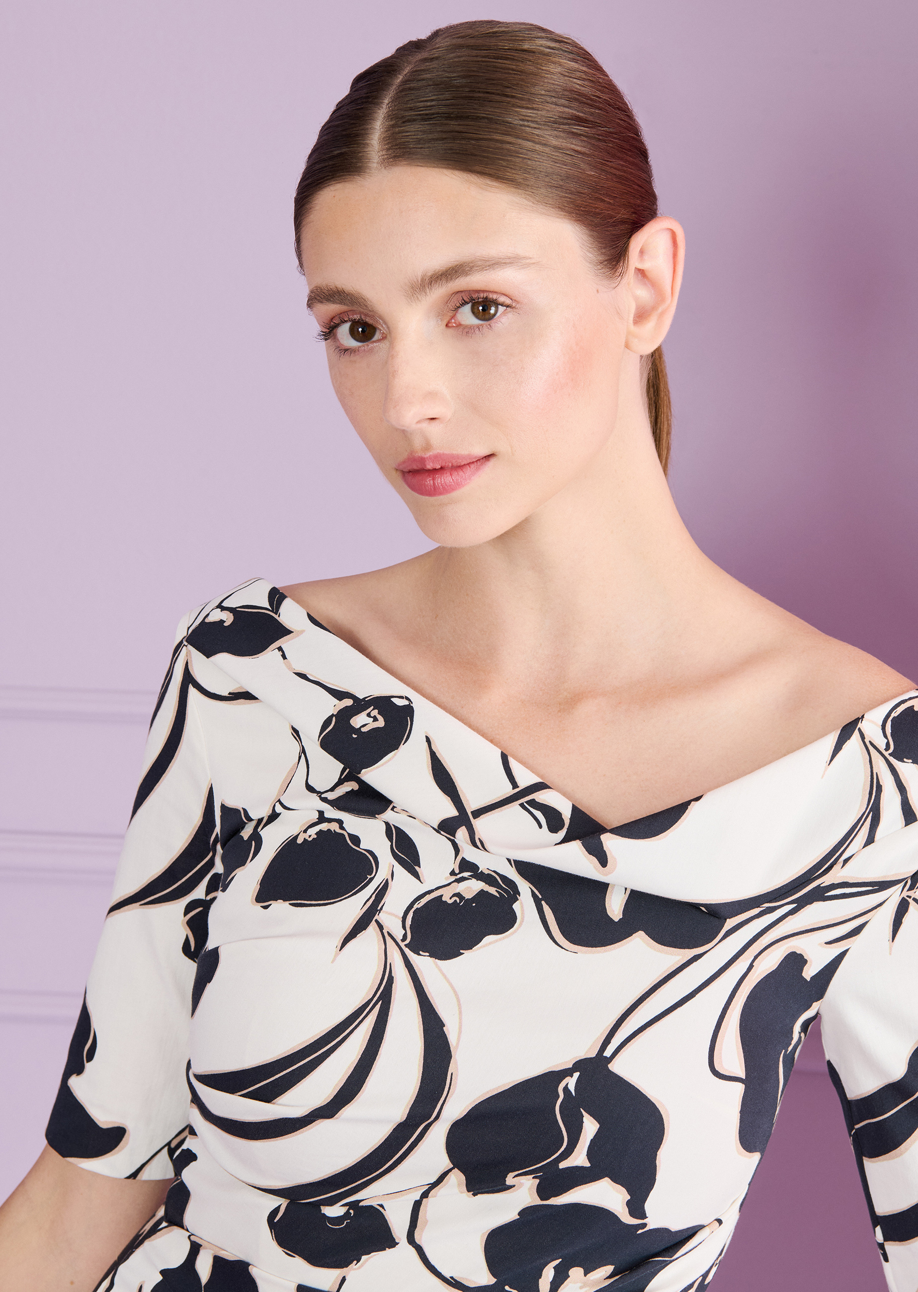 Bartenders always create exciting new cocktails by mixing ingredients in ways you wouldn’t expect. Naturally, this also works with cocktail dresses. Our creation is based on classical nuances: A midi-length, flared skirt and an elegant sweeping neckline... We shake that together and combine it with a lightweight cotton print with floral notes and garnish with sophisticated draping and crisp short sleeves. This is a super chic way to toast a grand evening at your next cocktail event.