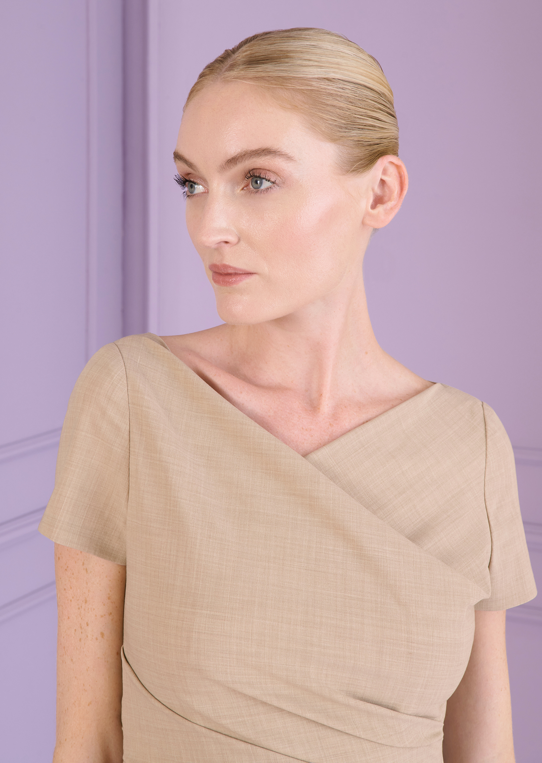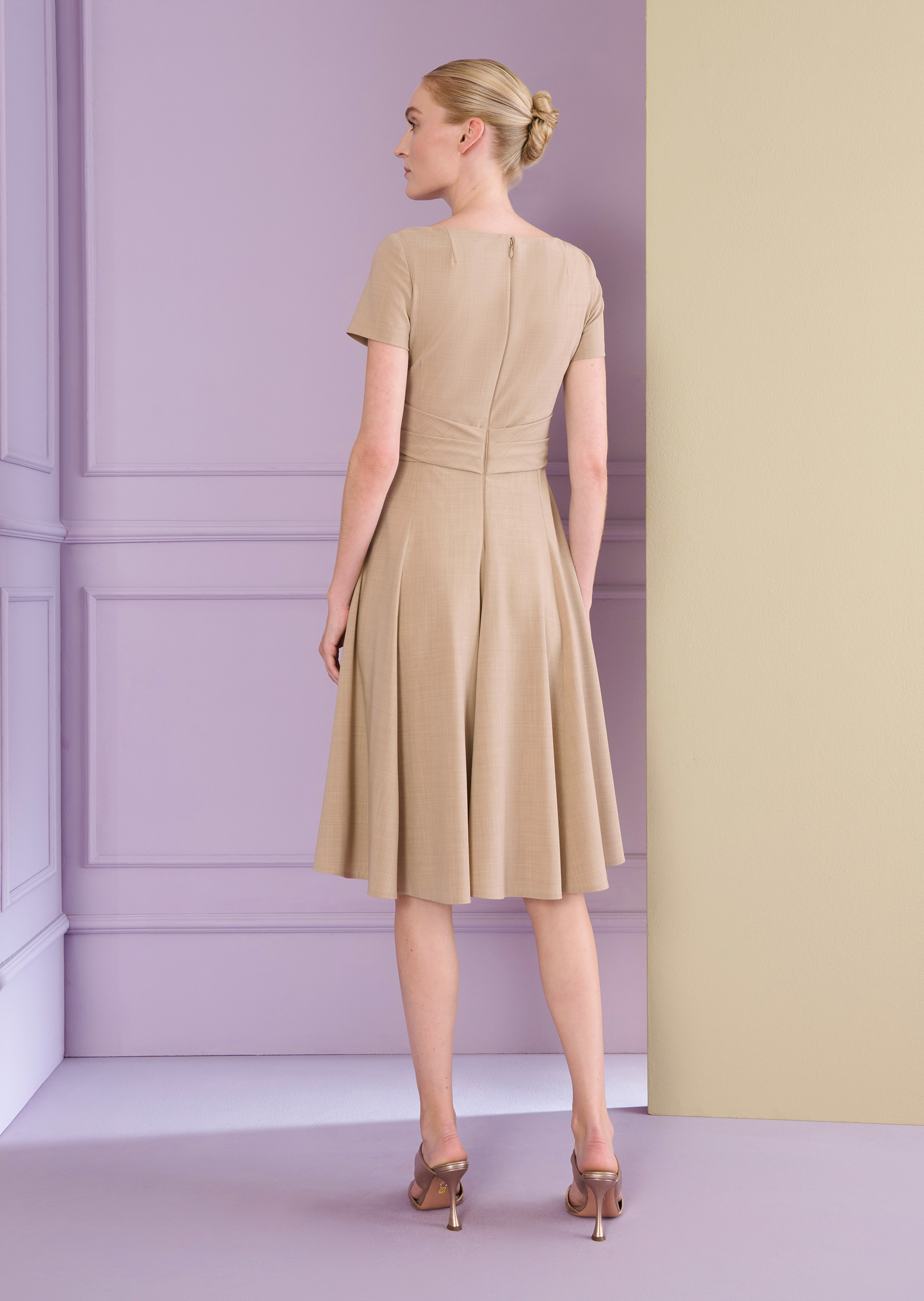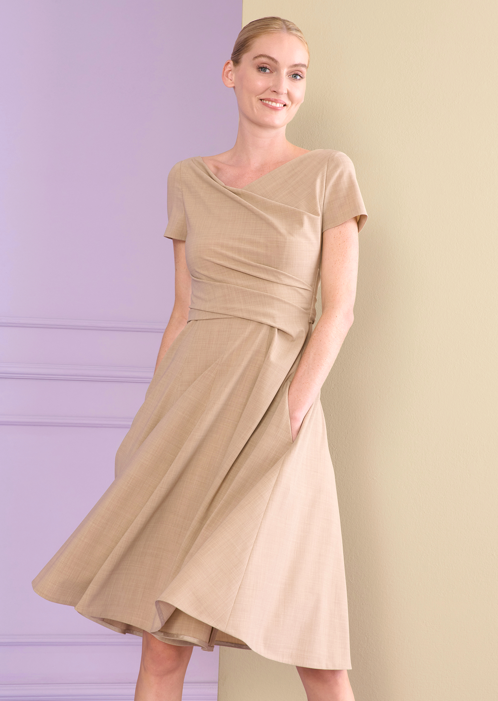Our designers have concocted a truly feminine and effective design. This day dress features a beautiful, get-you-noticed, accentuated neckline. Sophisticated draping accentuates the narrow waist. The wide skirt sways beautifully with every step. However, it is the material, a flowing and wonderfully light wool fabric woven in Italy, that really makes this dress stand out. Wear it to work with a chic blazer. Come the evening, just slip into some stylish pumps, add a clutch, and an edgy leather jacket.