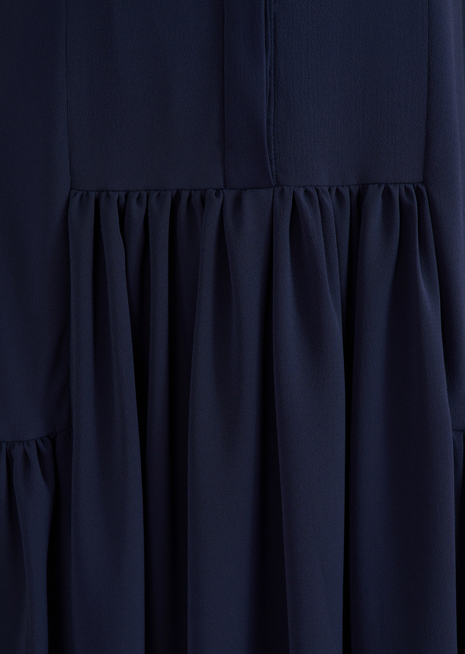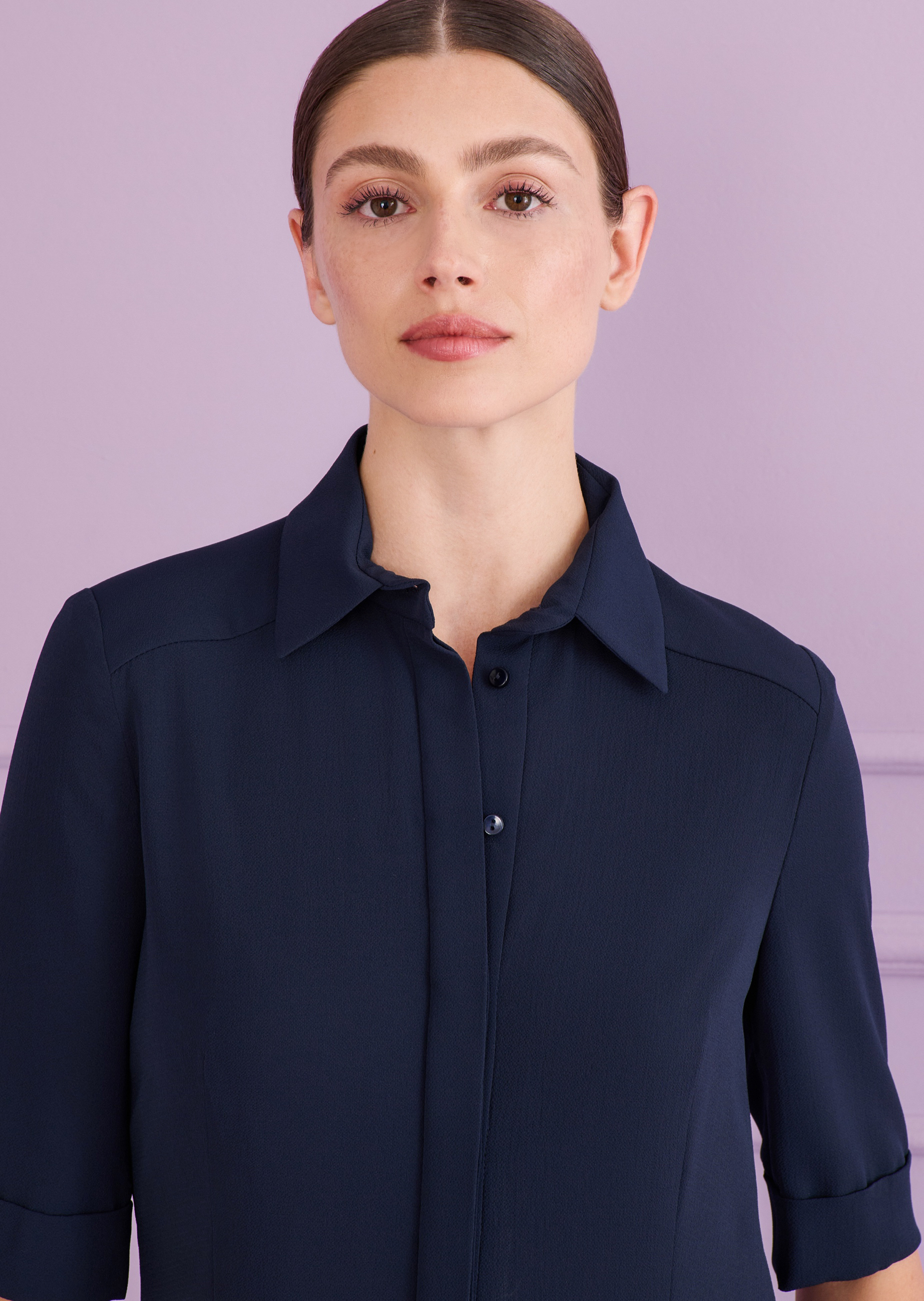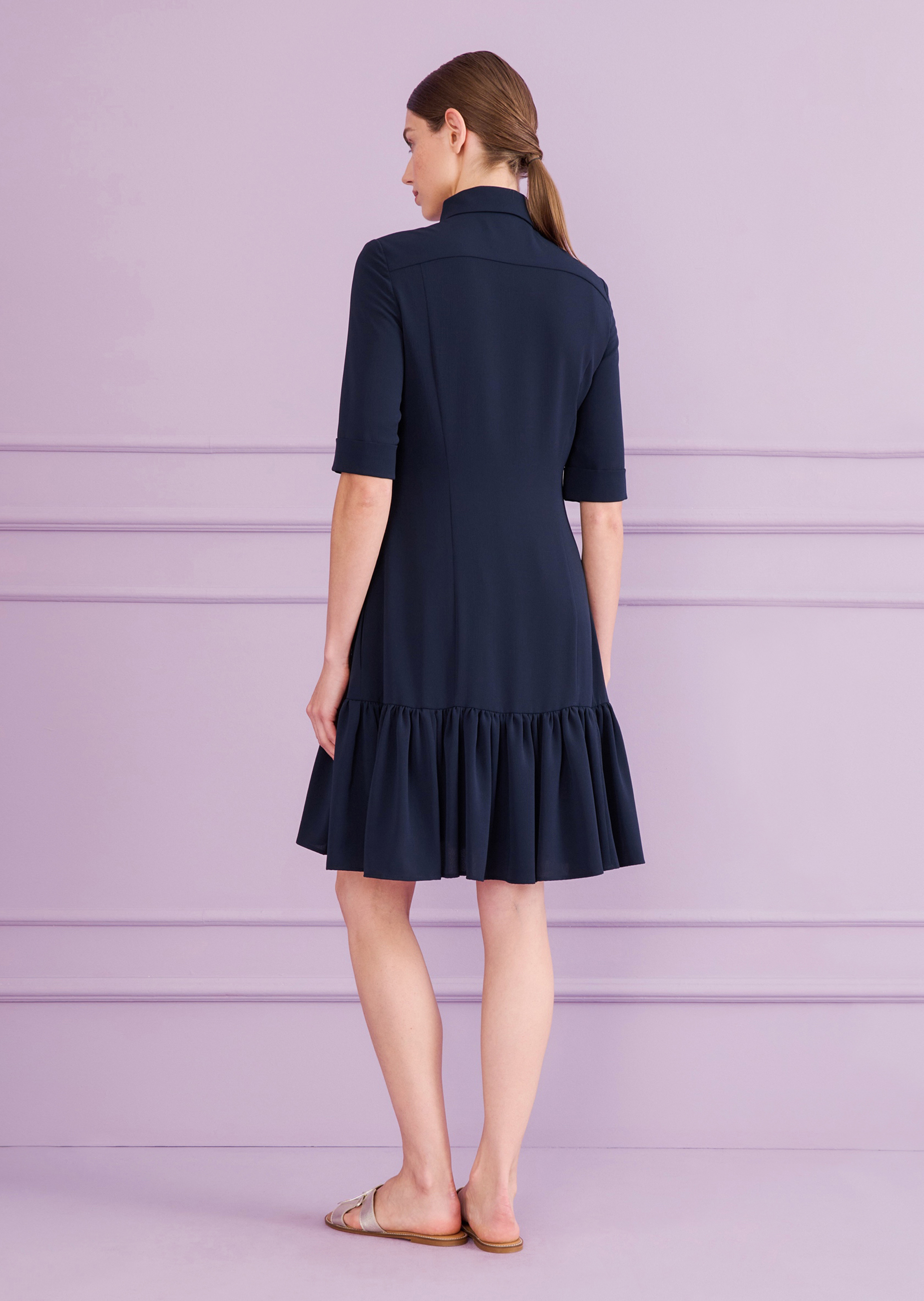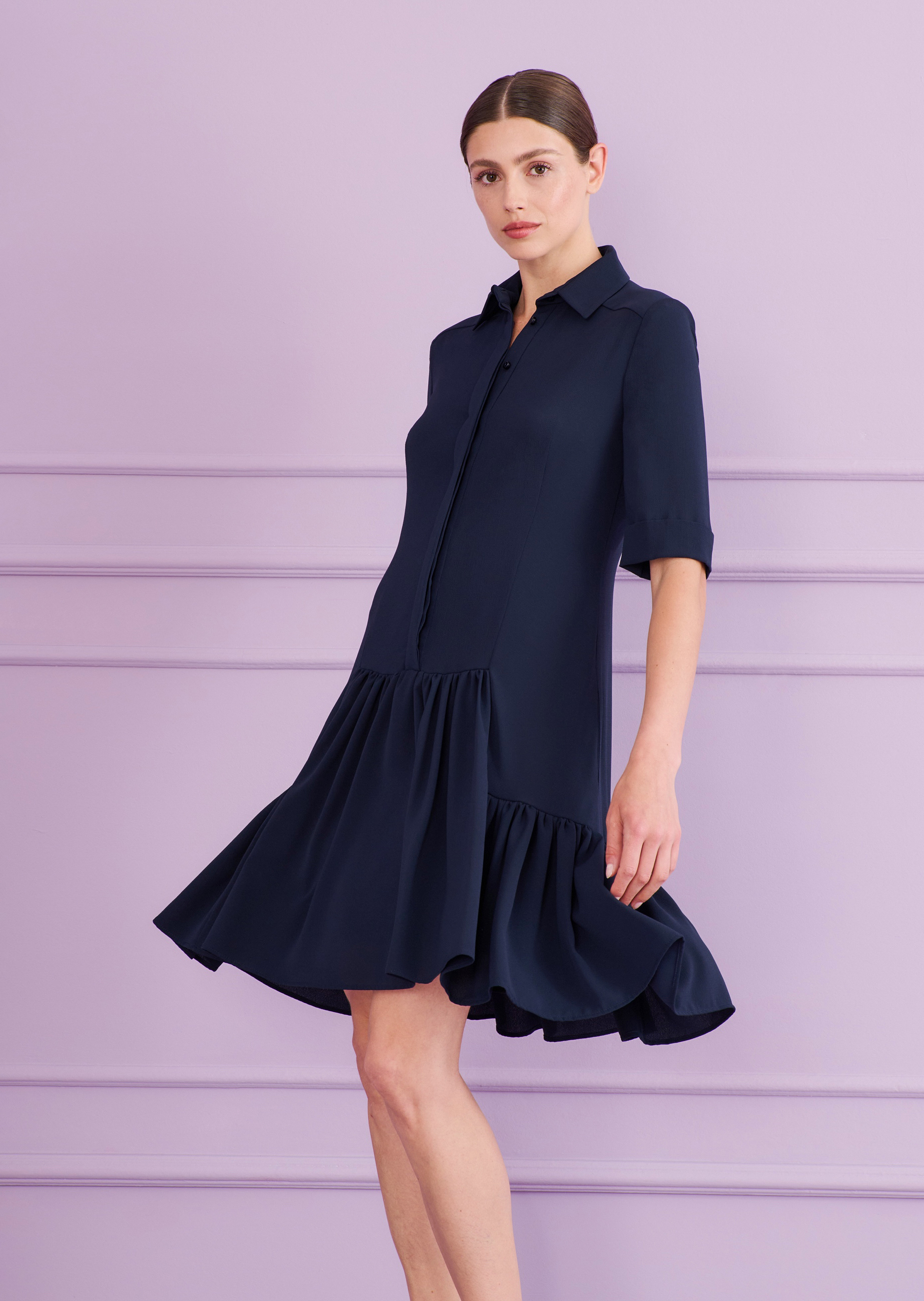 this day dress is absolutely inspired... made from a soft stretch crespina, this loose shape shirt dress is beyond comfortable no matter what your day will bring. the clever cut and tiered skirt makes use of perfect proportions and the collar and button placket means you have options. deep side pockets add that last smattering of cool understatement. wear this style with flat sandals during the day in the city, with flats in the office and with high strappy sandals for a summer cocktail in the evening.