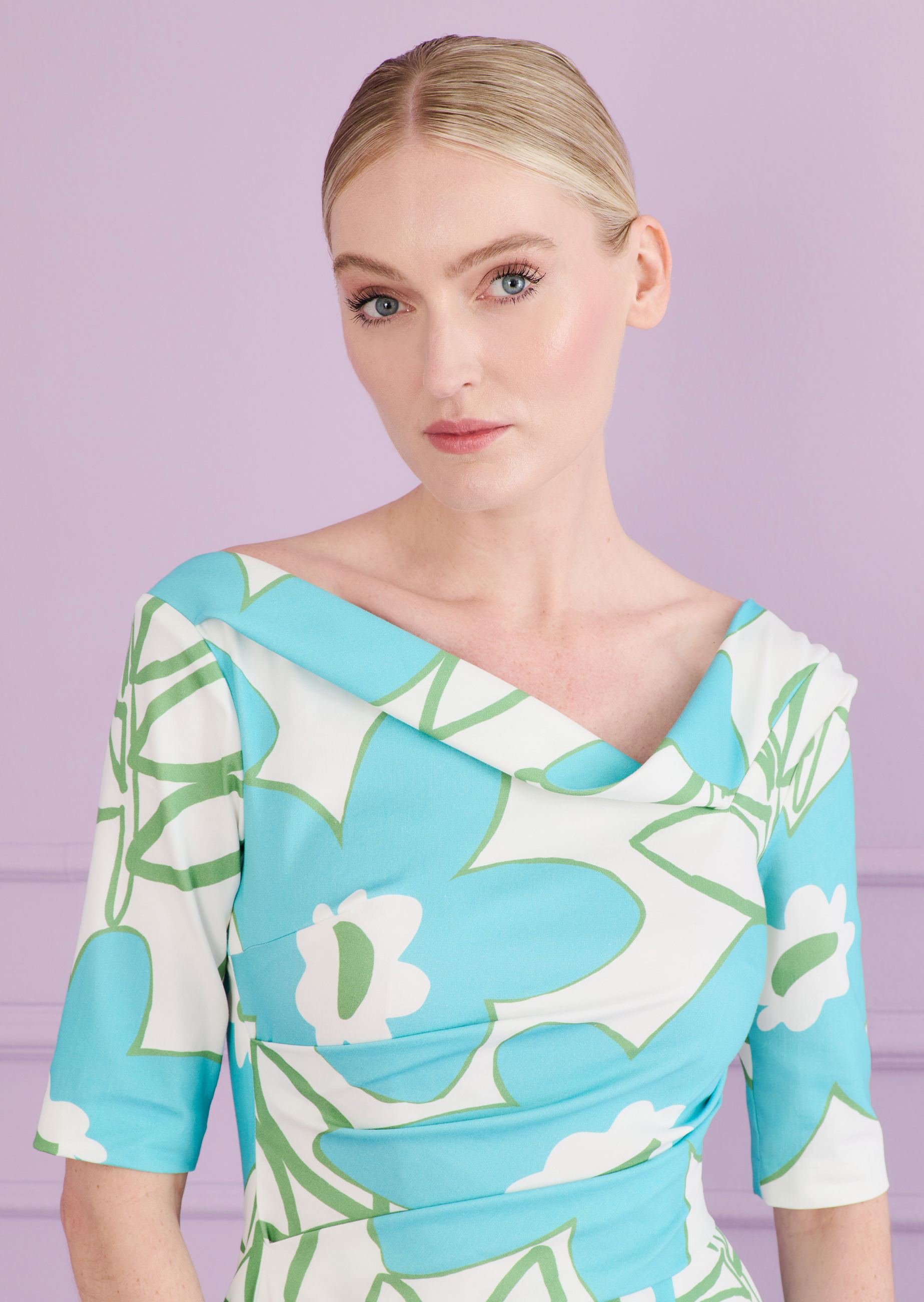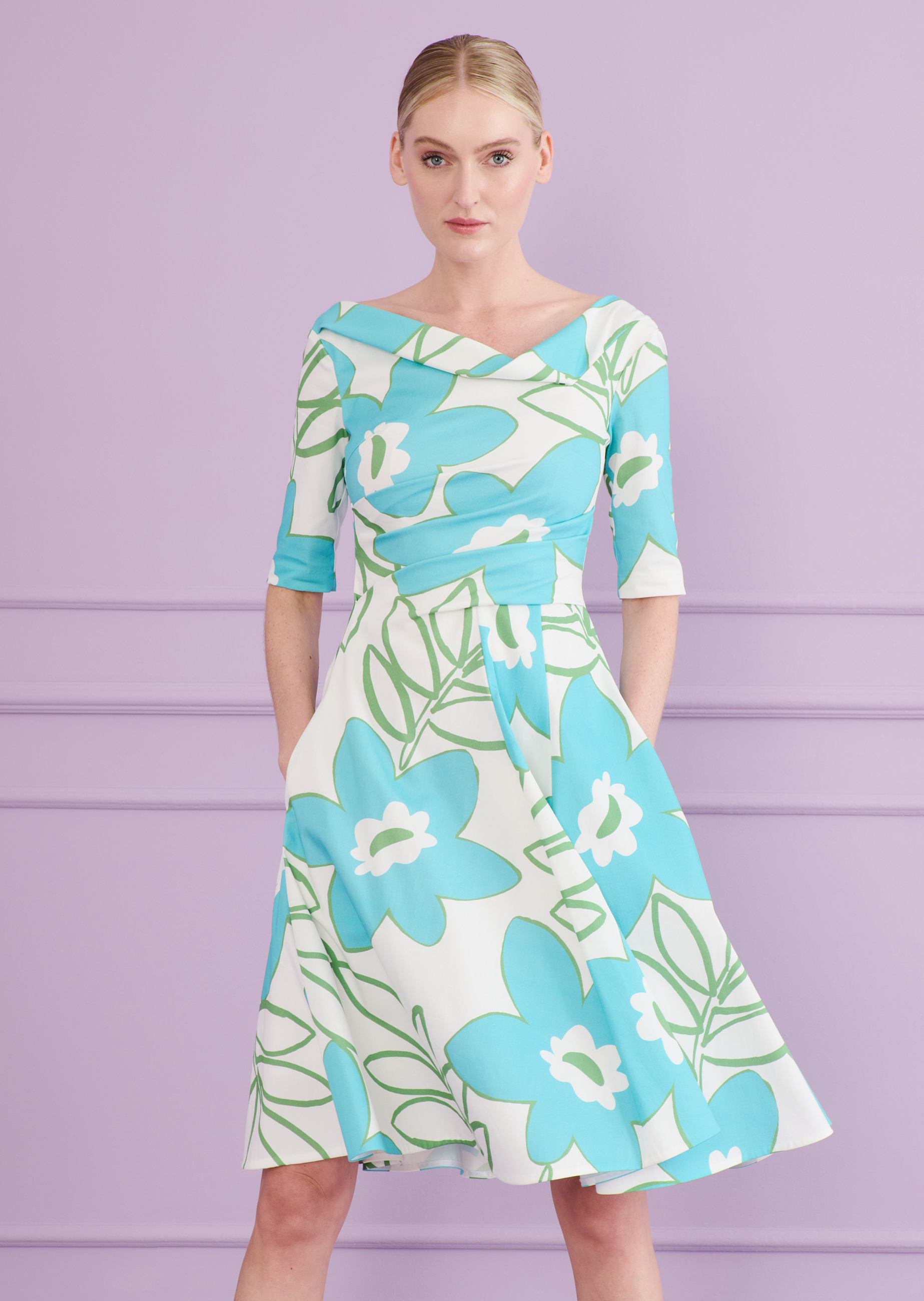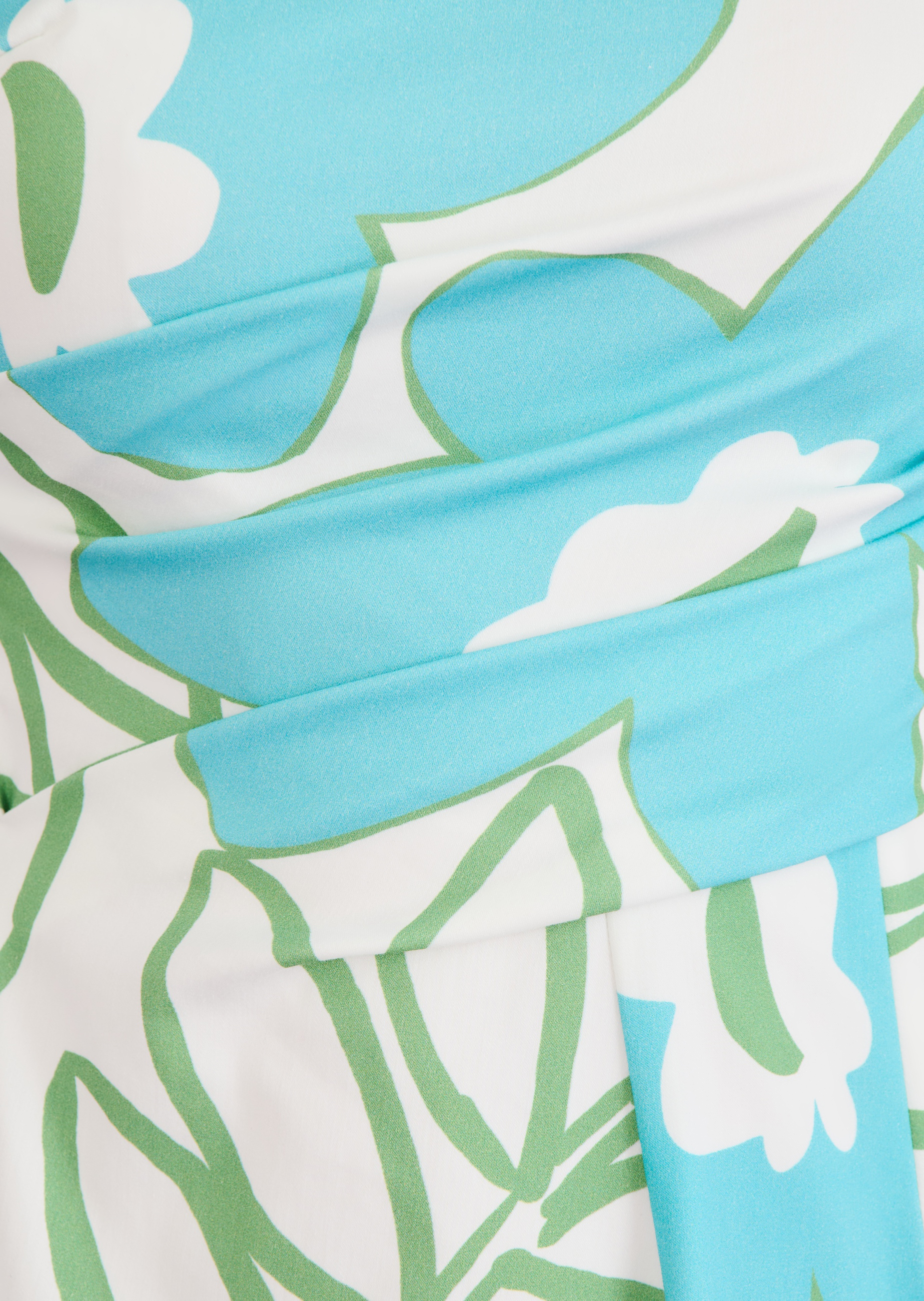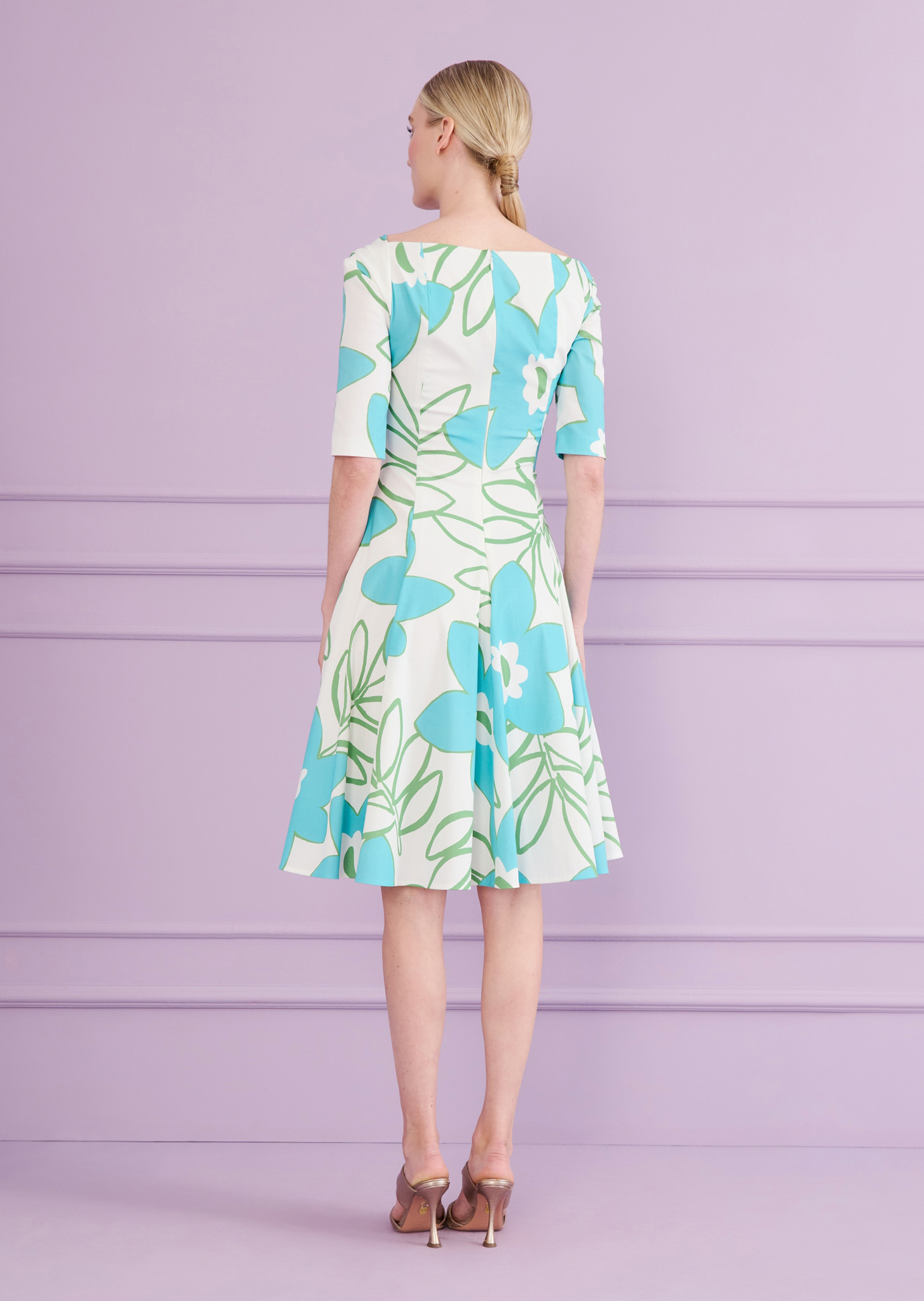 Whether during the day or at a family celebration – this printed cotton dress is a true all-rounder for any occasion. The elegant boat neckline beautifully highlights your collarbones, while the wide, flared skirt moves gracefully with every step. Half-length sleeves offer both confidence and a touch of warmth – perfect for those early spring days. Thoughtful draping at the waist creates a flattering silhouette, enhancing your natural shape. And thanks to the lightweight cotton fabric, you’ll feel effortlessly comfortable – whether enjoying everyday moments or celebrating on warm summer days.