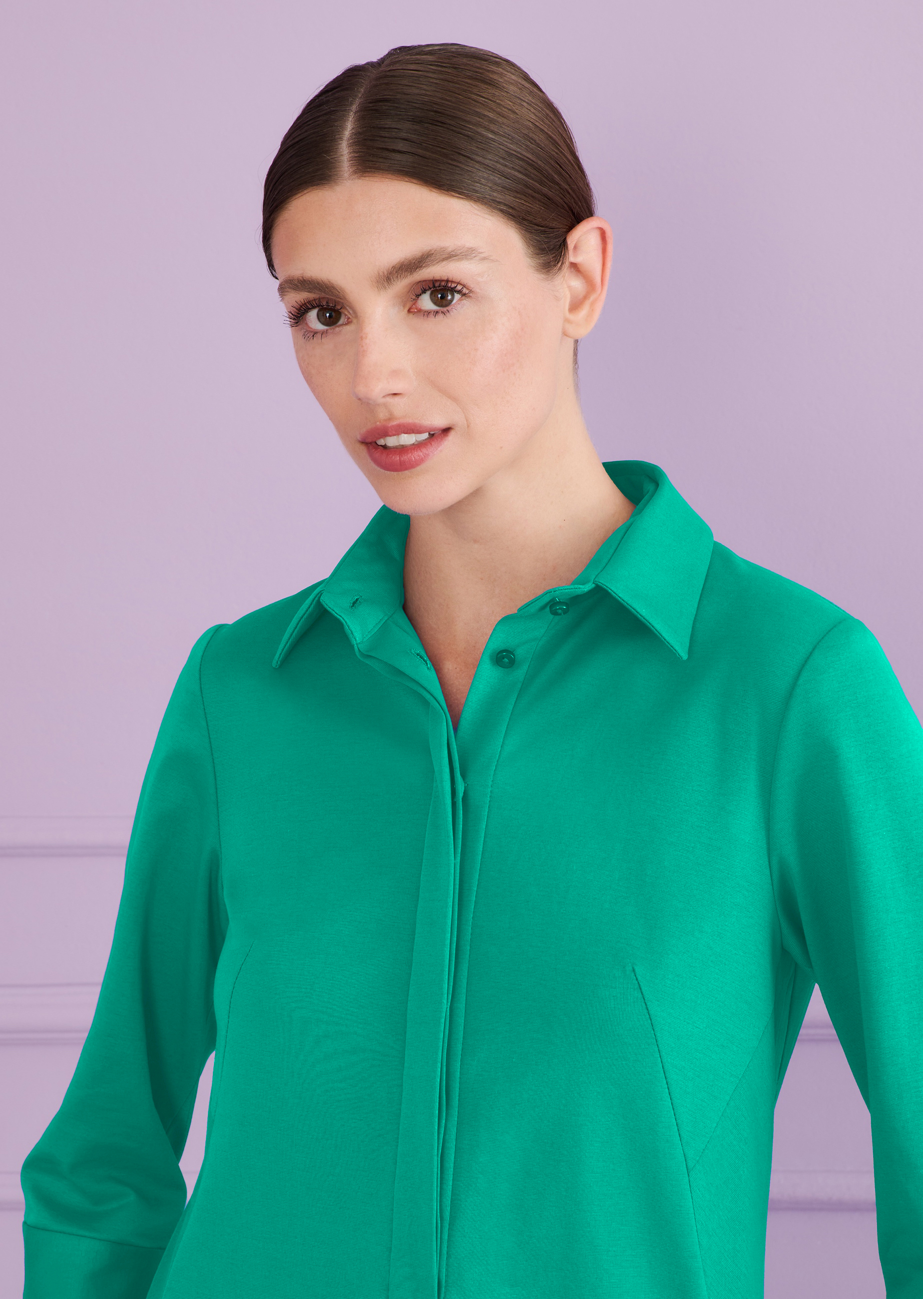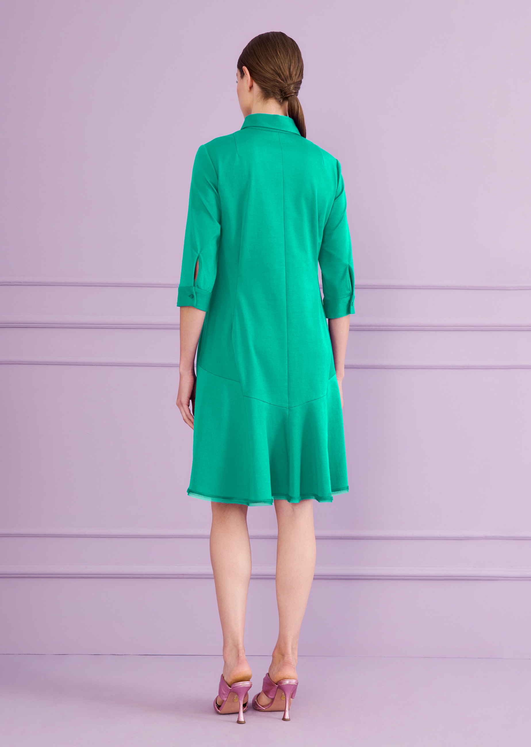 Sometimes the magic lies in the hidden details – as is the case with this apparently simple day dress. In fact the artistic cut has more to it than at first meets the eye. Look and you will see that the elaborate design reveals itself at the sides. Otherwise, this knee-length dress has an understated look with a subtle round neckline and slim, mid-length sleeves. We made it from a light punto milano cotton fabric in a royal navy blue color. You can wear this dress at the office, or wear it with heels in a statement color for an exciting evening look.