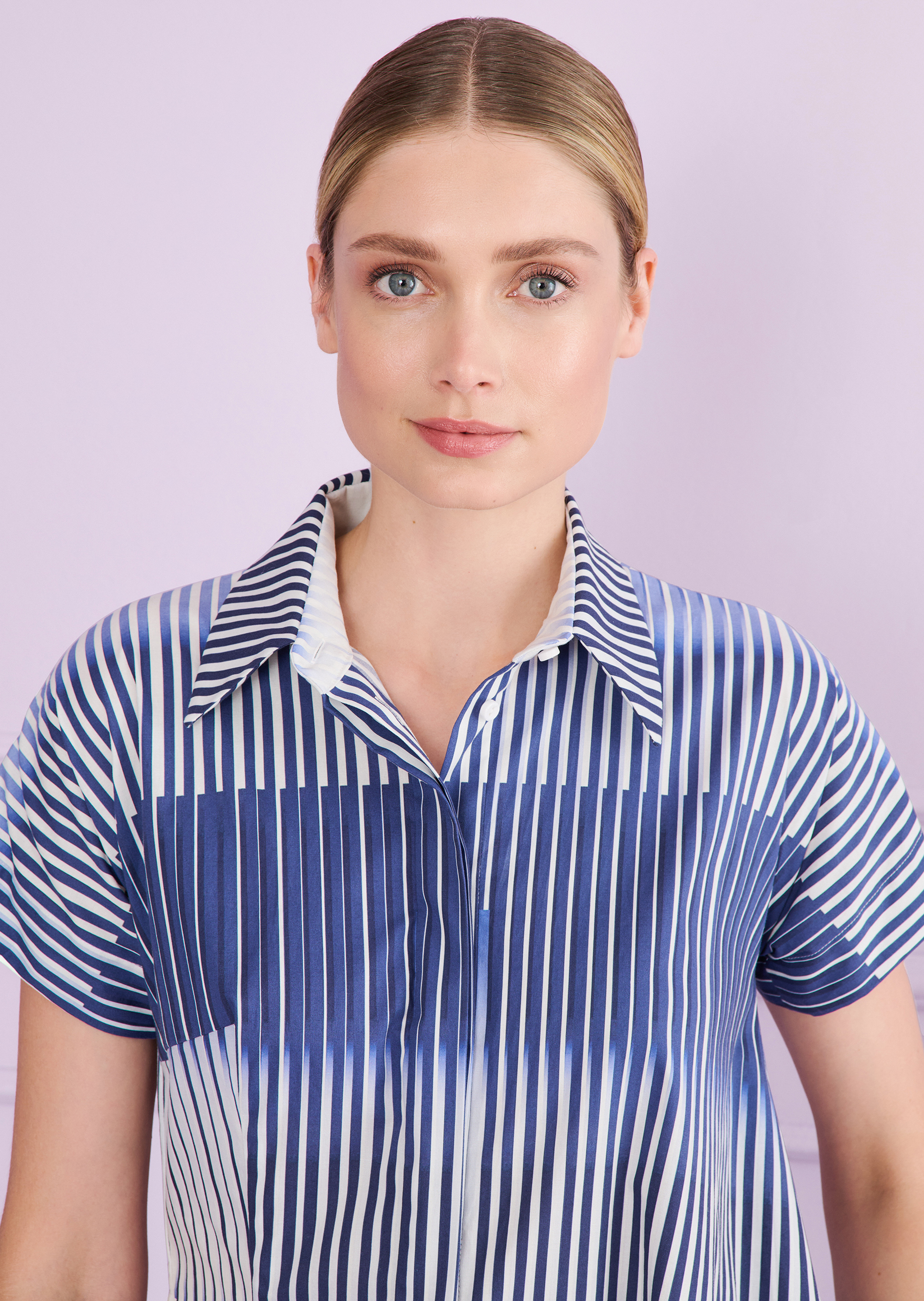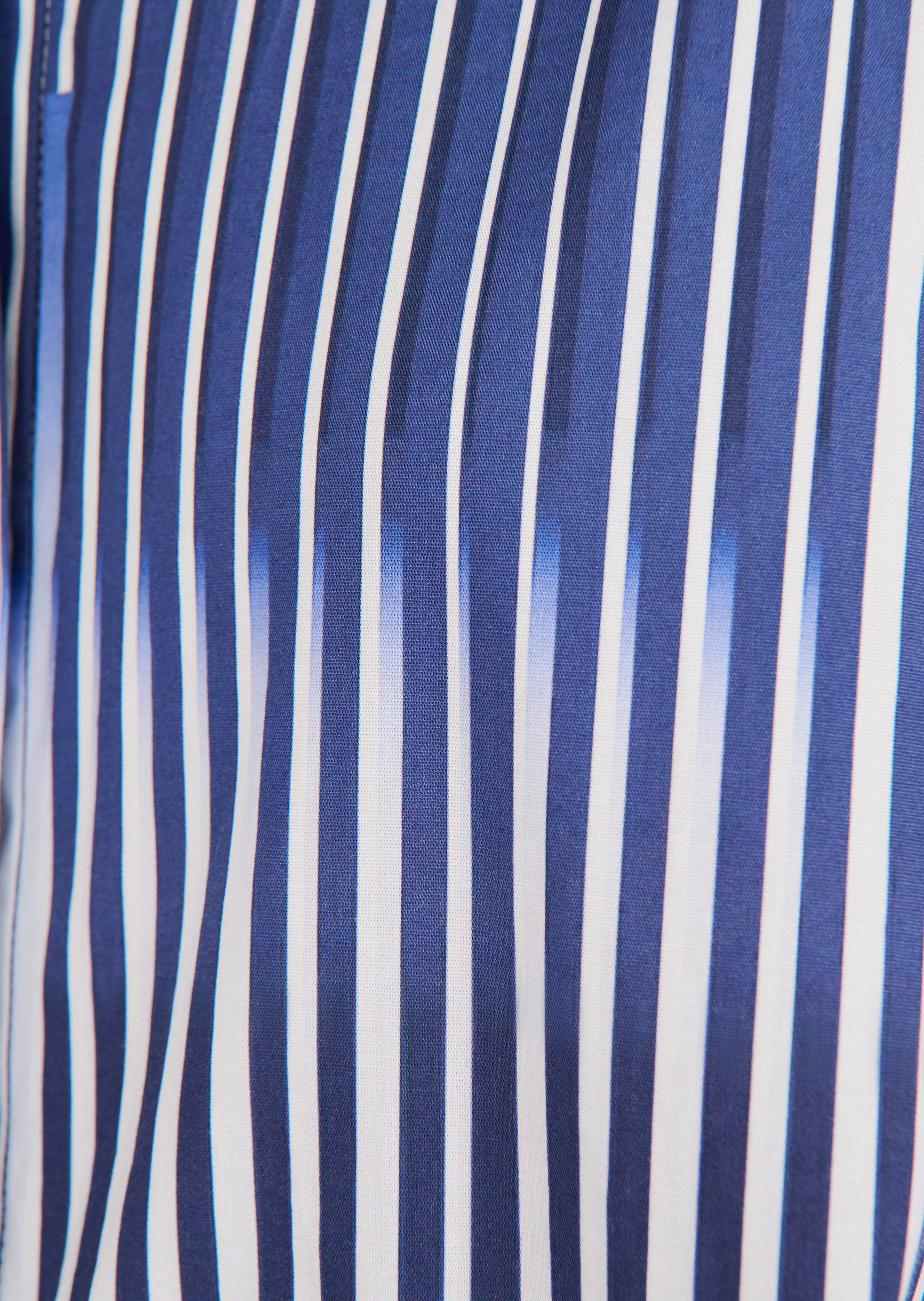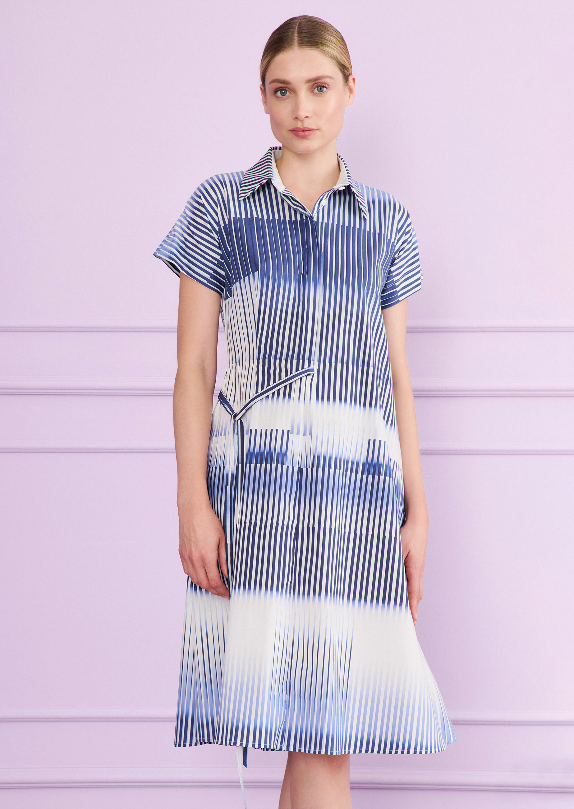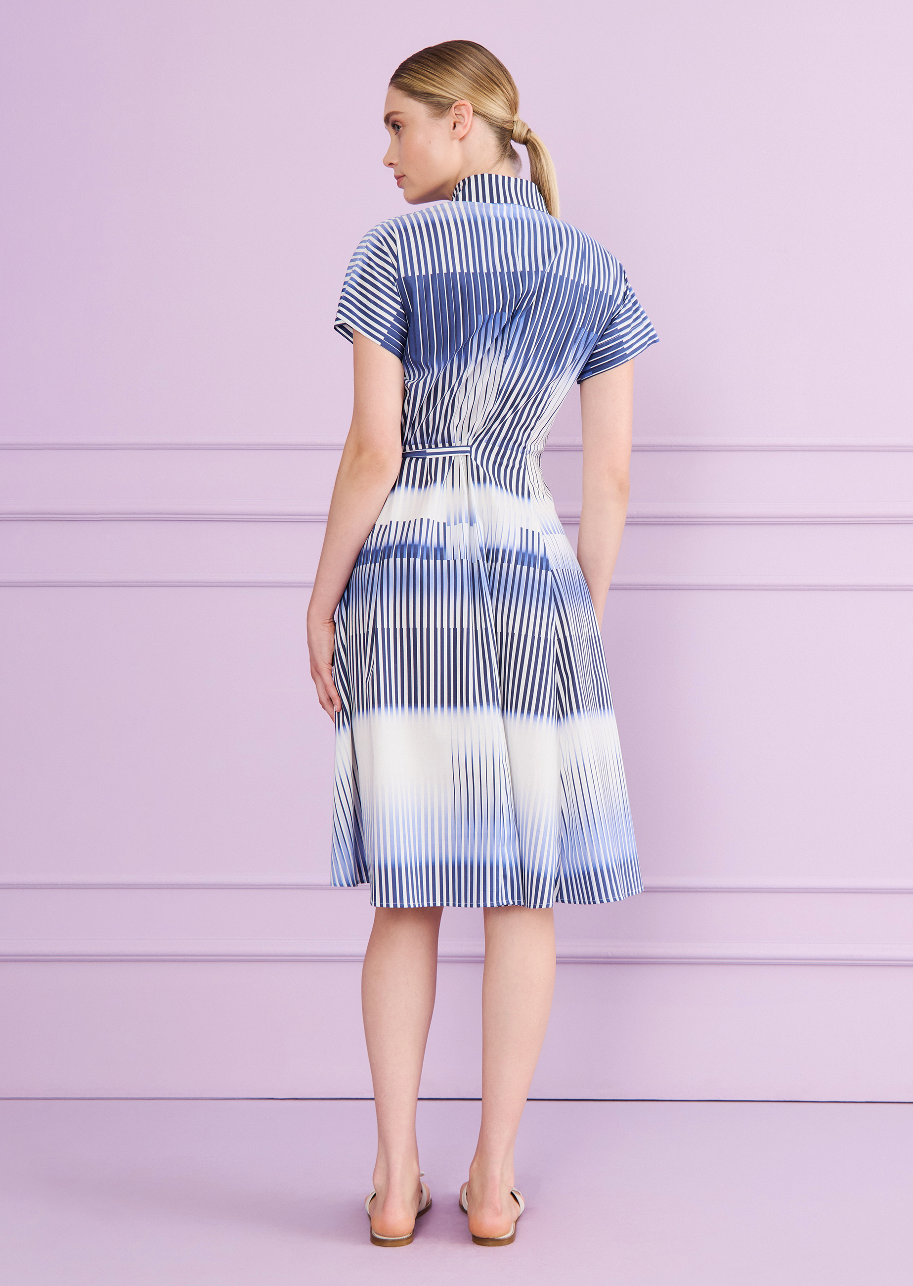 The shirt dress has been reinvented! At first glance, this day dress made of a lightweight printed stretch cotton fabric might seem like a chic fit & flare dress. But there really is something about this cut. The cut resembles the fit & flare dress in two different ways. On the one hand, the cut gives the impression of a fitted waist. On the other hand, the dress is loose. The waist is gathered and accentuated by a cord. This not only gives the dress (this season in a brand new knee-length version) an exciting look, it also gives it a casual, unique style. Mid-length sleeves with cuffs complete the summery look. Try wearing it with trainers and a simple cross-body bag.