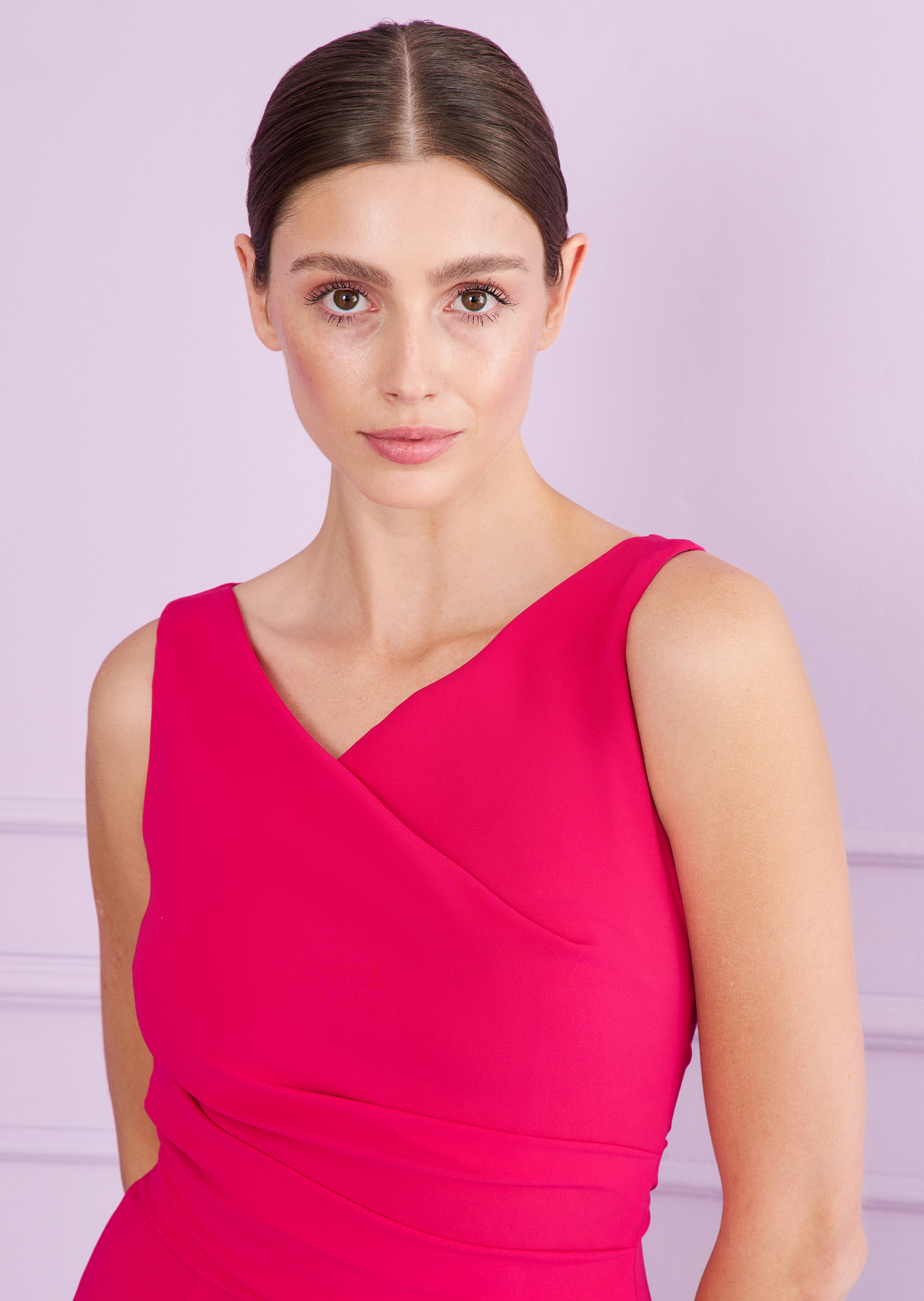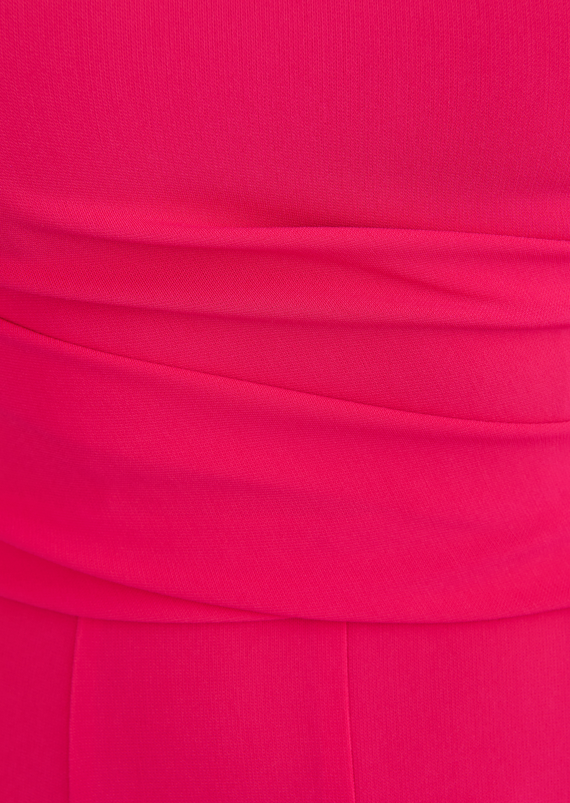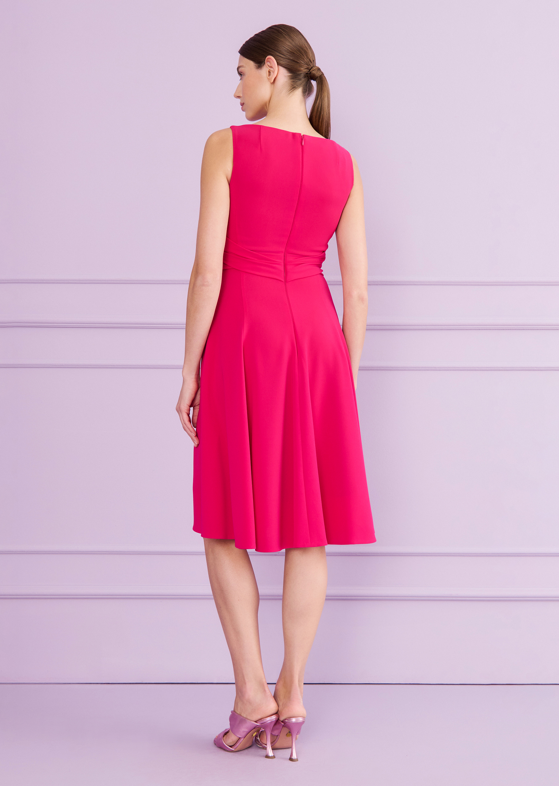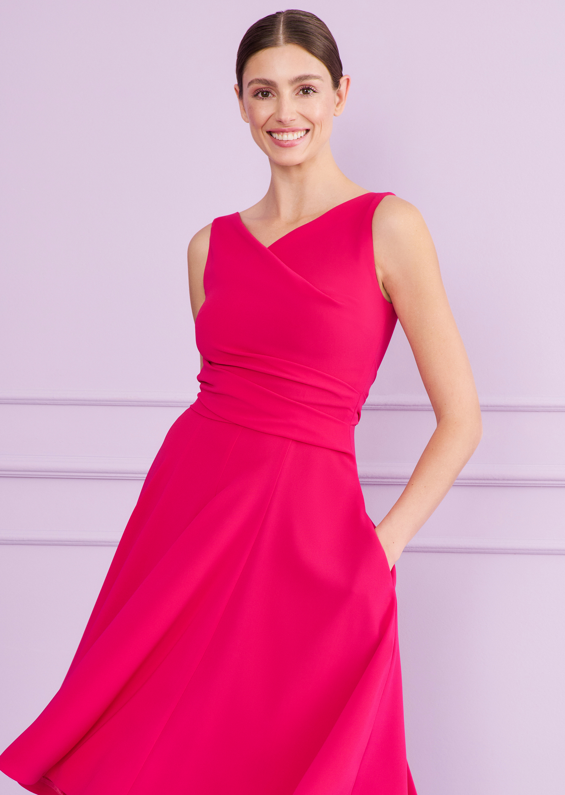 Our designers have concocted a truly feminine and effective design. This day dress features a beautiful, get-you-noticed, accentuated neckline. Here, the shoulder strap lies directly on the shoulder, providing both security and freedom of movement. Sophisticated draping accentuates the narrow waist. The wide skirt sways beautifully with every step. However, it is the material, a dynamic, flowing cady fabric, that really makes this dress stand out. Wear it to work with a chic blazer. Come the evening, just slip into some stylish pumps, add a clutch, and an edgy leather jacket.