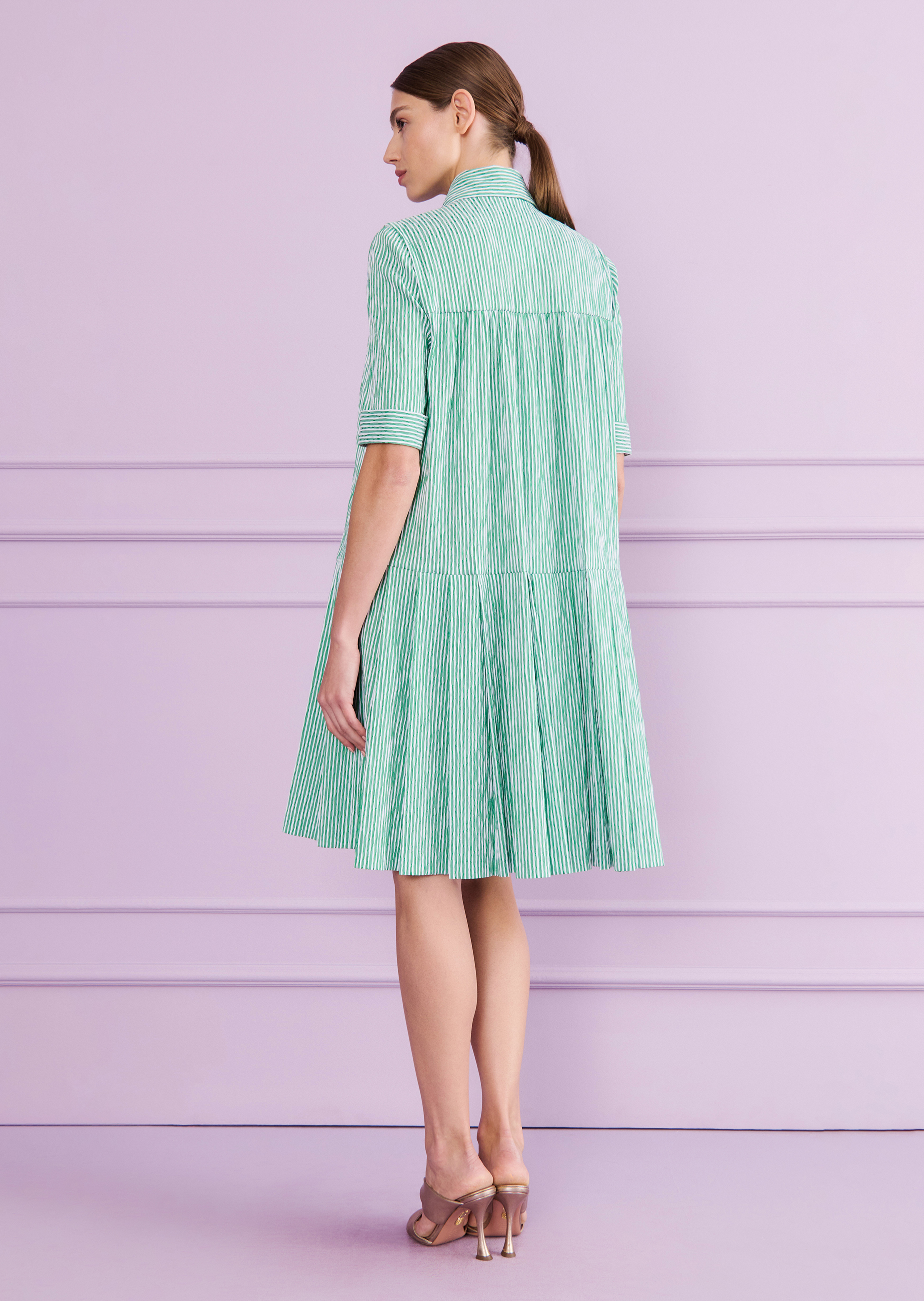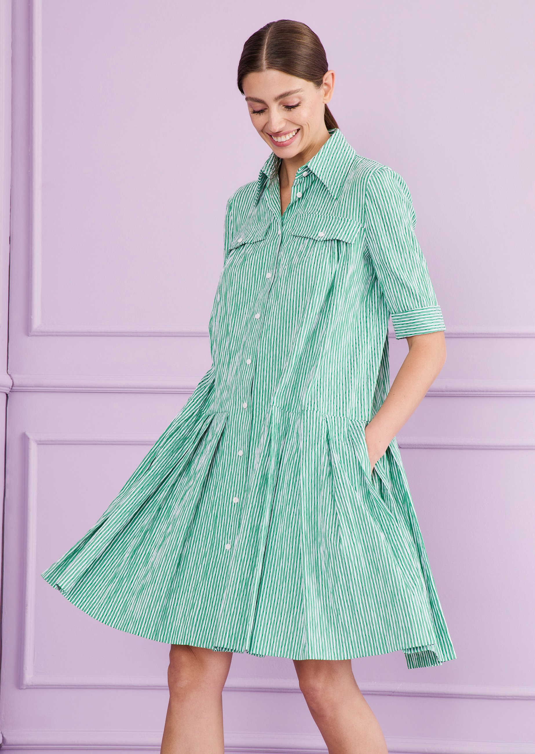 Casual is your middle name – and this day dress with elbow-length sleeves is your go-to summer uniform. The silhouette is as easygoing as you are, with relaxed volume and effortless lightness. A shirt collar, patch breast pockets, and a breezy flounce give it a sporty, laid-back vibe. Made from our ultra-comfortable seersucker, the fabric feels great and requires almost no fuss. Style it with sneakers and sunglasses for a stroll through the city, or pair it with sandals and a straw hat for your favorite getaway spot. And the best part? This seersucker is incredibly suitcase-friendly.