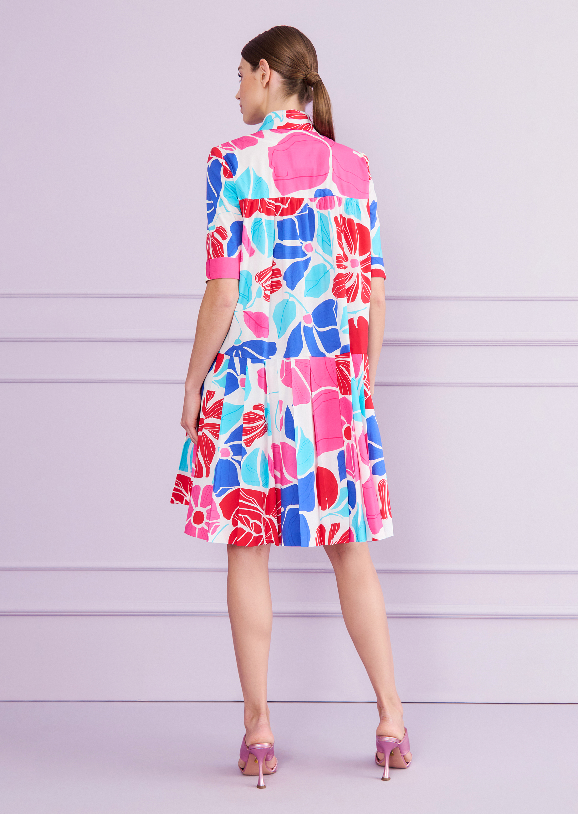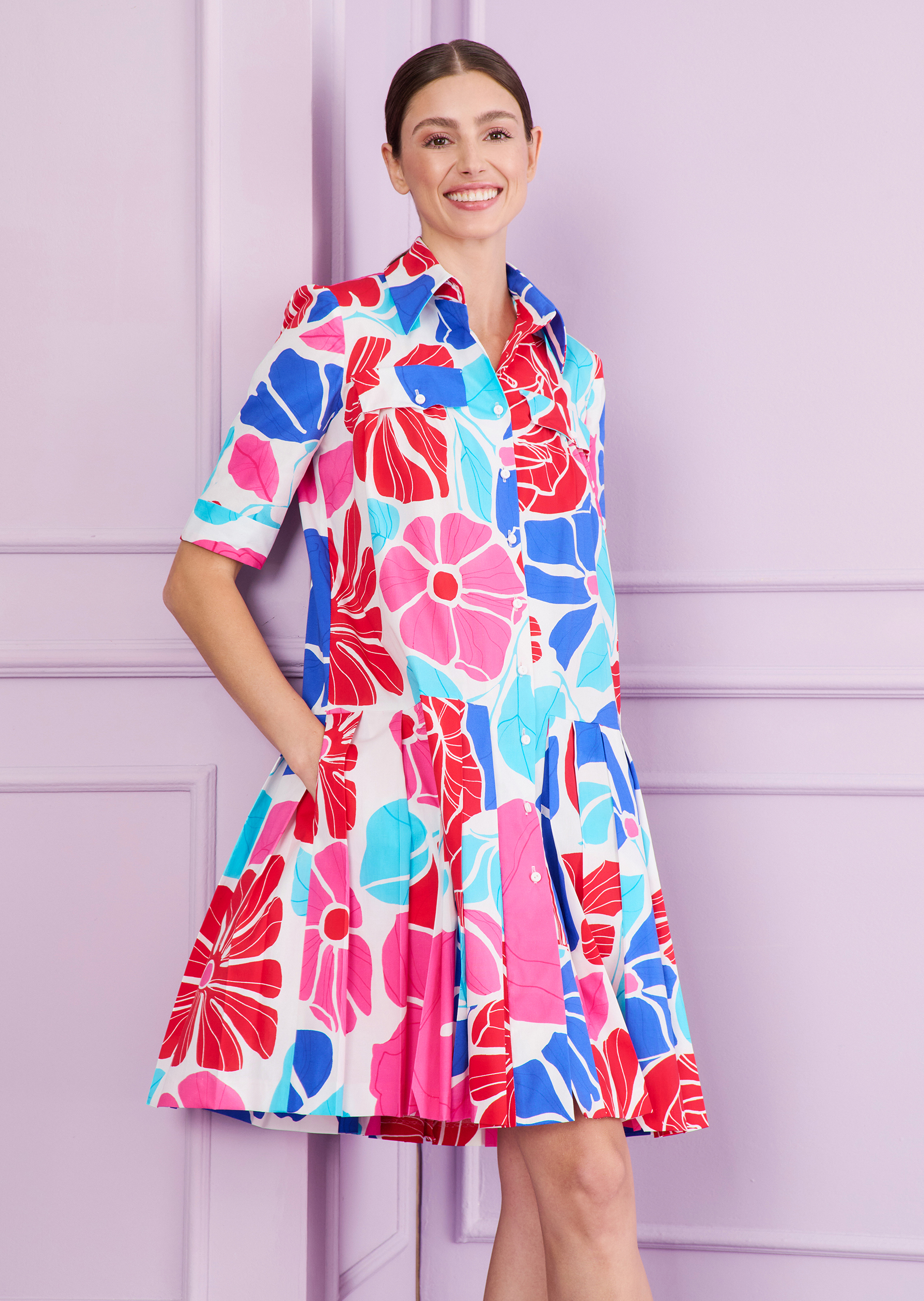 Casual is your middle name – and that’s exactly why this daytime dress with half-length sleeves is set to become your summer go-to. Its relaxed silhouette mirrors your easygoing vibe, offering breezy volume and effortless charm. A shirt collar, patch pockets, and a playful flounce hem add a sporty twist to the look. The fabric? A lightweight poplin with a cheerful floral print that feels as carefree as it looks. Pair it with sneakers and sunnies for a stroll through the city, or with sandals and a straw hat for a stylish holiday moment.