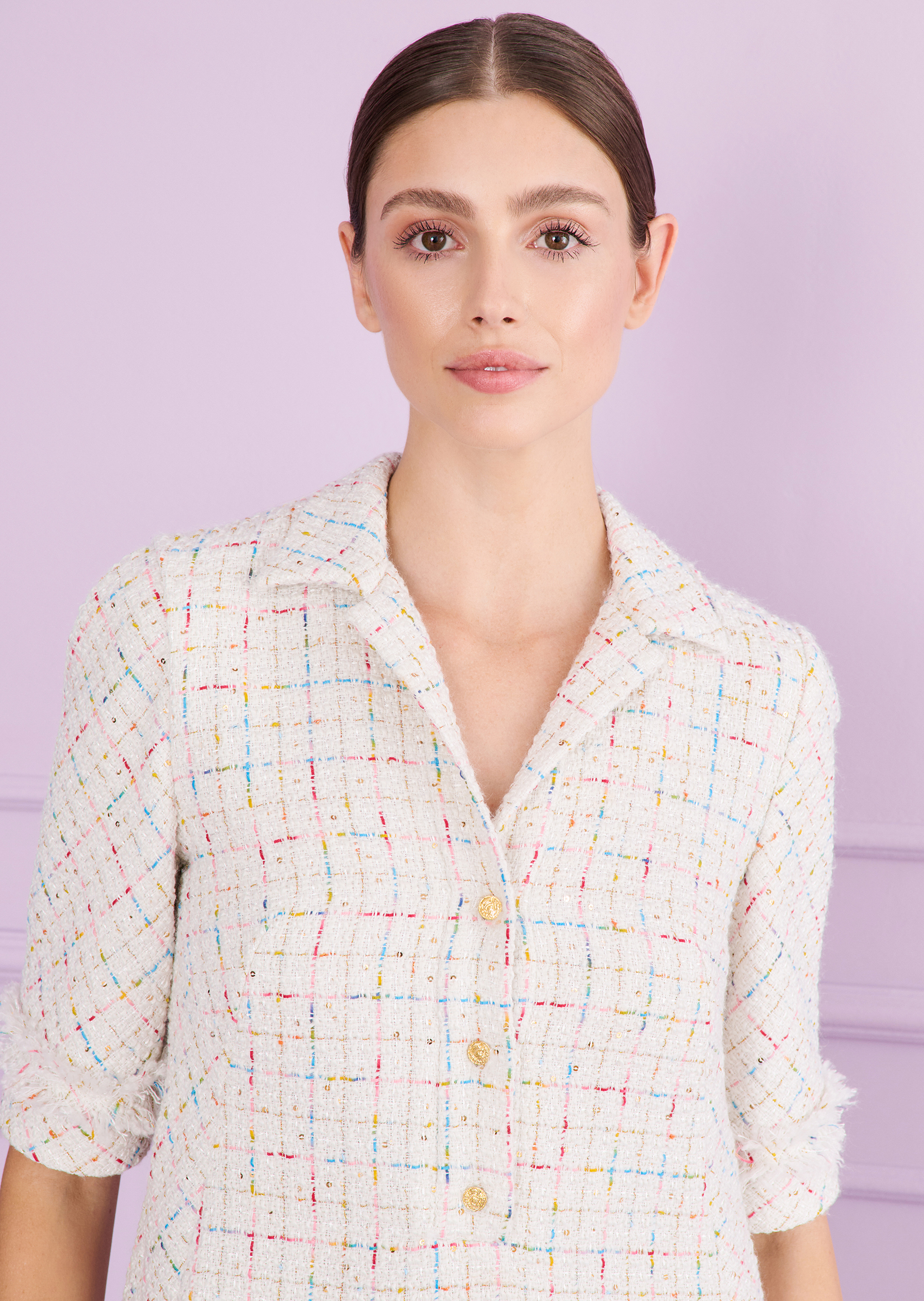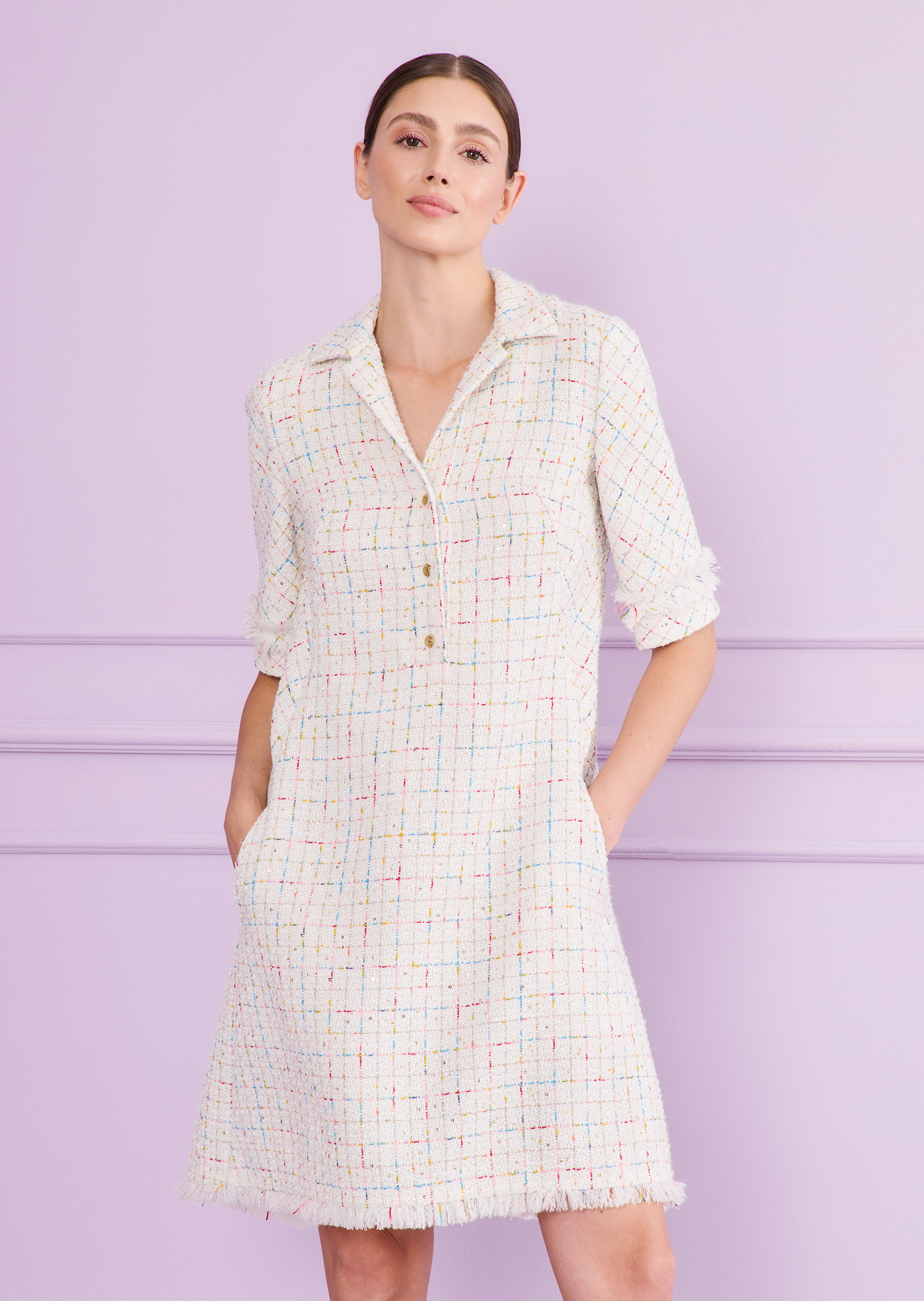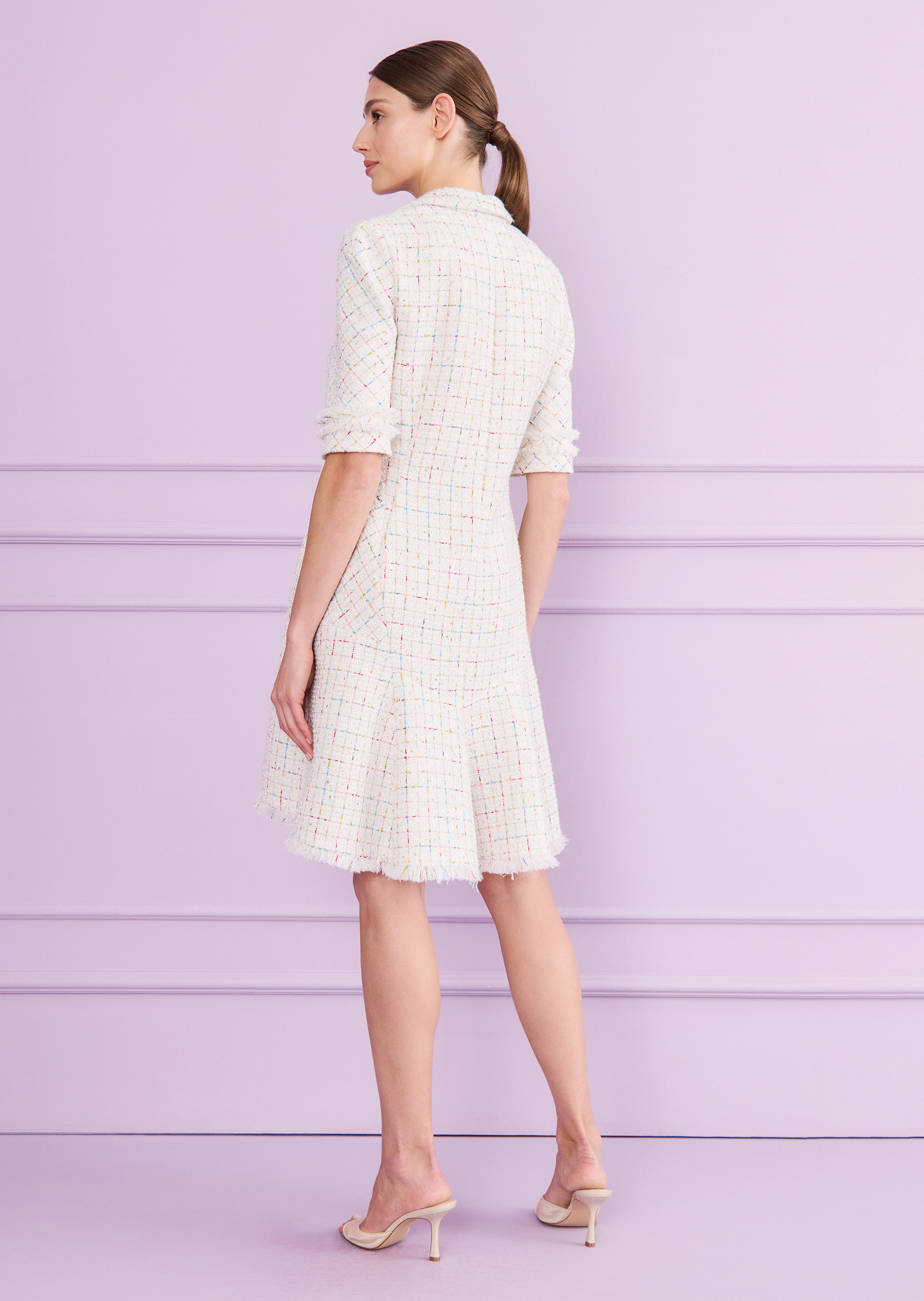 Manchmal liegt die Magie im Verborgenen – so auch bei diesem zunächst schlicht erscheinenden Kleid. Dabei hat es der kunstvoll kreierte Schnitt in sich. Bei genauerem Hinsehen erschließen sich die aufwendig gestaltete Konstruktion an den Seiten. Auch sonst wirkt dieses knielange Kleid zurückhaltend mit dezentem Reverskragen und halblangen schmalen Ärmeln. Wir haben es aus einem subtil funkelnden Rainbow Sequin Tweed gefertigt. So tragen Sie dieses Kleid entspannt ibeim Ausstellungsopening, genauso aber auch am Abend mit aufregenden Heels in einer knalligen Farbkombination.