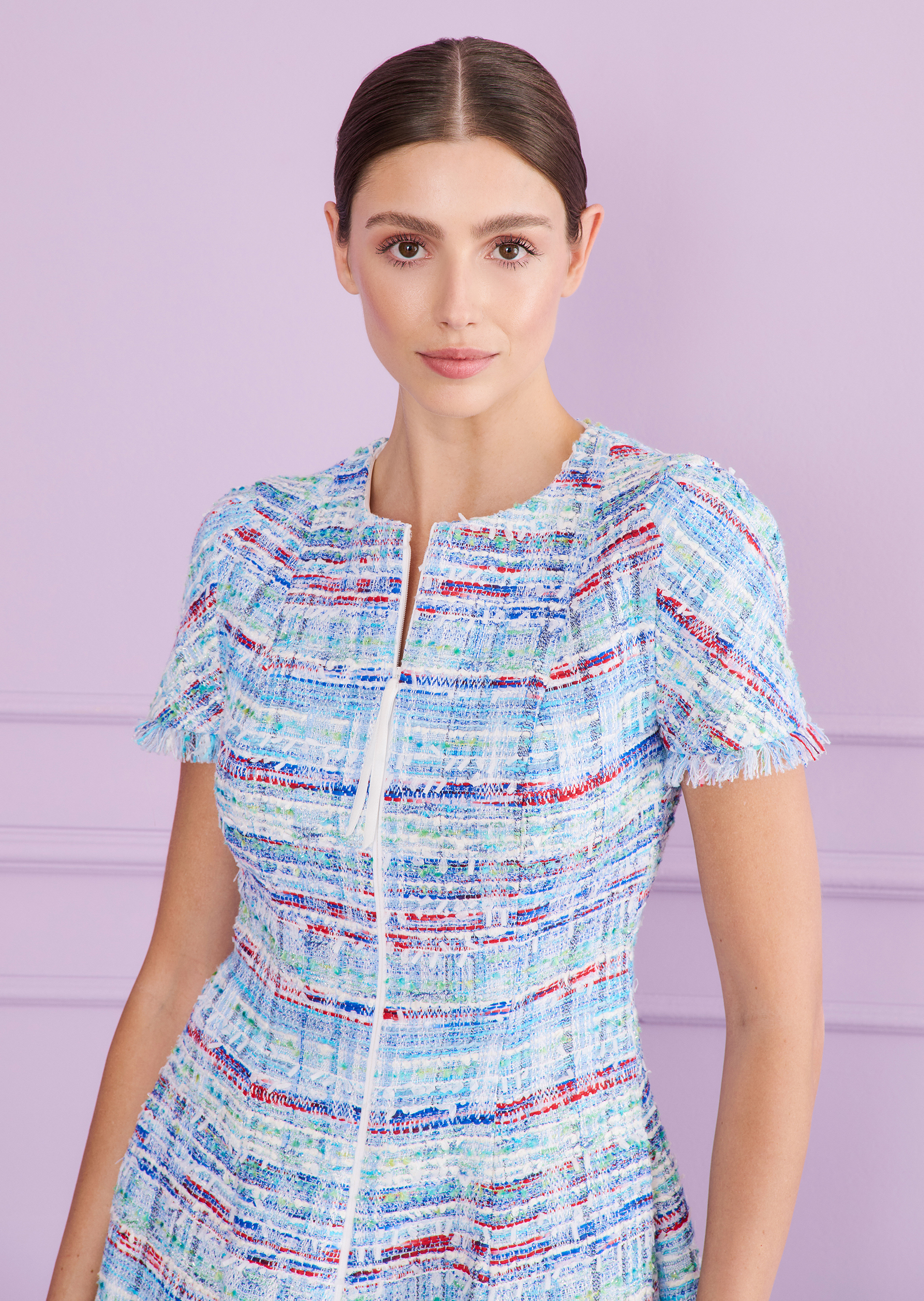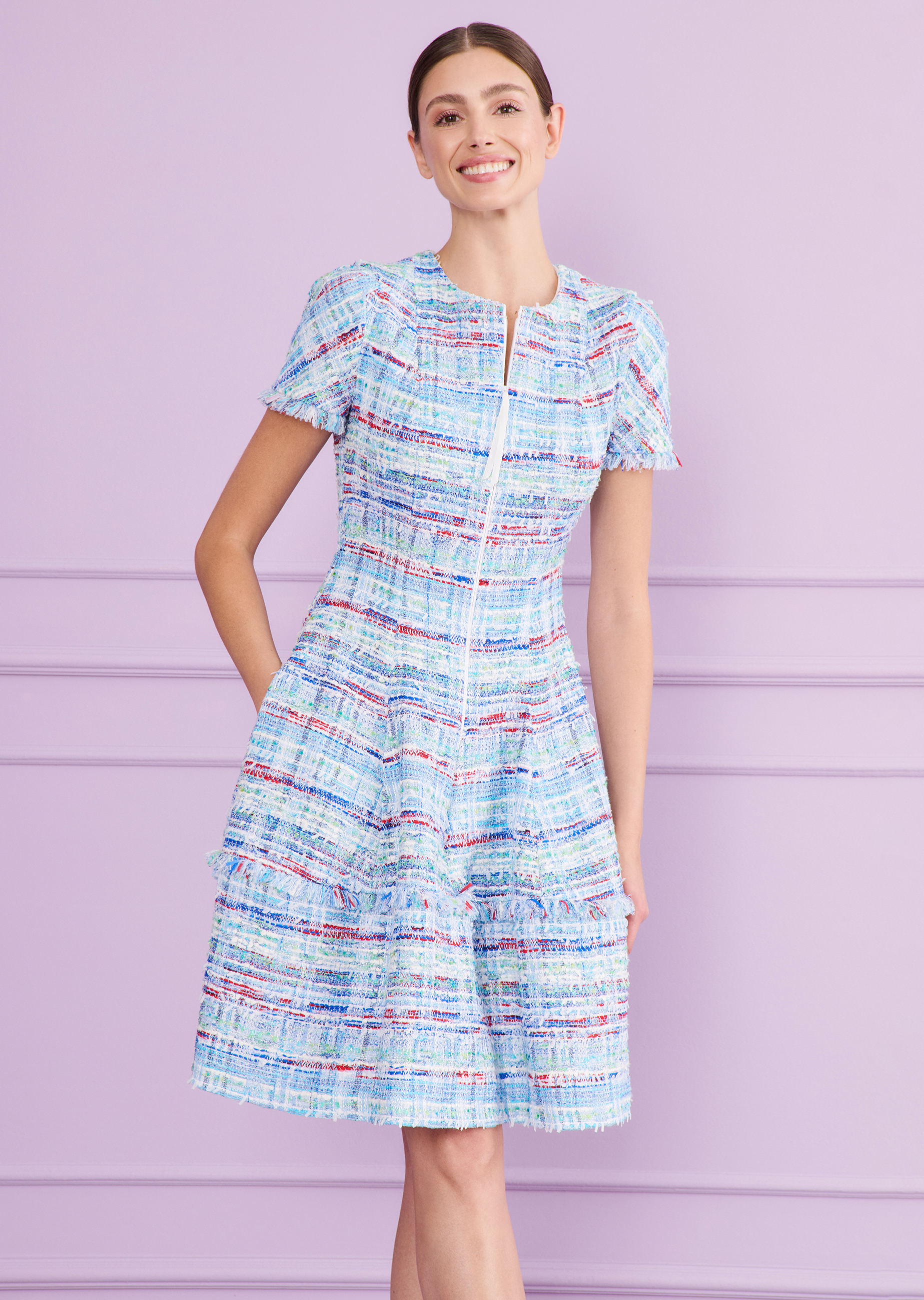 Forget tweets — go for timeless tweed. This classic fabric lets you turn heads without ever logging in. In this knee-length day dress, you’ll turn heads with pure style and quiet sophistication. The round neckline with zipper closure offers versatility: wear it zipped up for a polished look, or slightly open for a more relaxed feel. The paneled construction and gently flared skirt flatter the silhouette, while short sleeves provide light coverage for the upper arms – and just the right amount of warmth when the weather cools. Whether you're dressing for a holiday gathering, a business lunch, or a dinner date – compliments are sure to follow. Real-life likes included.