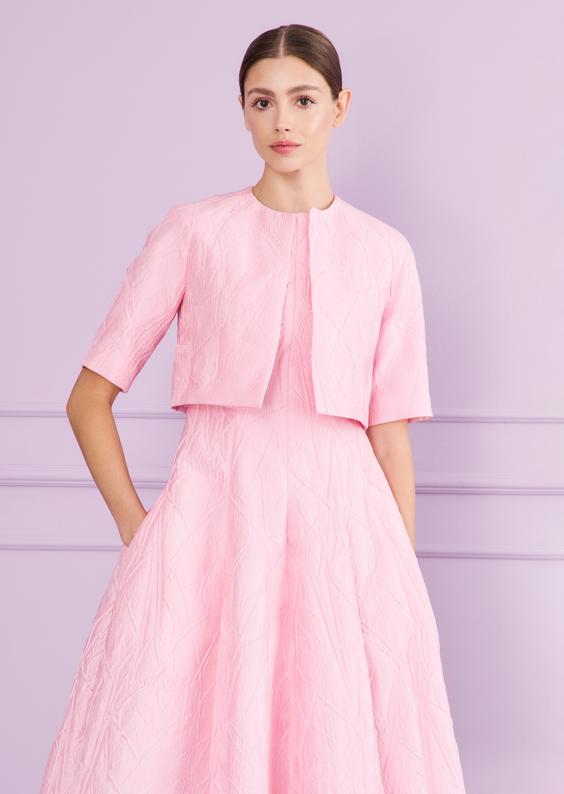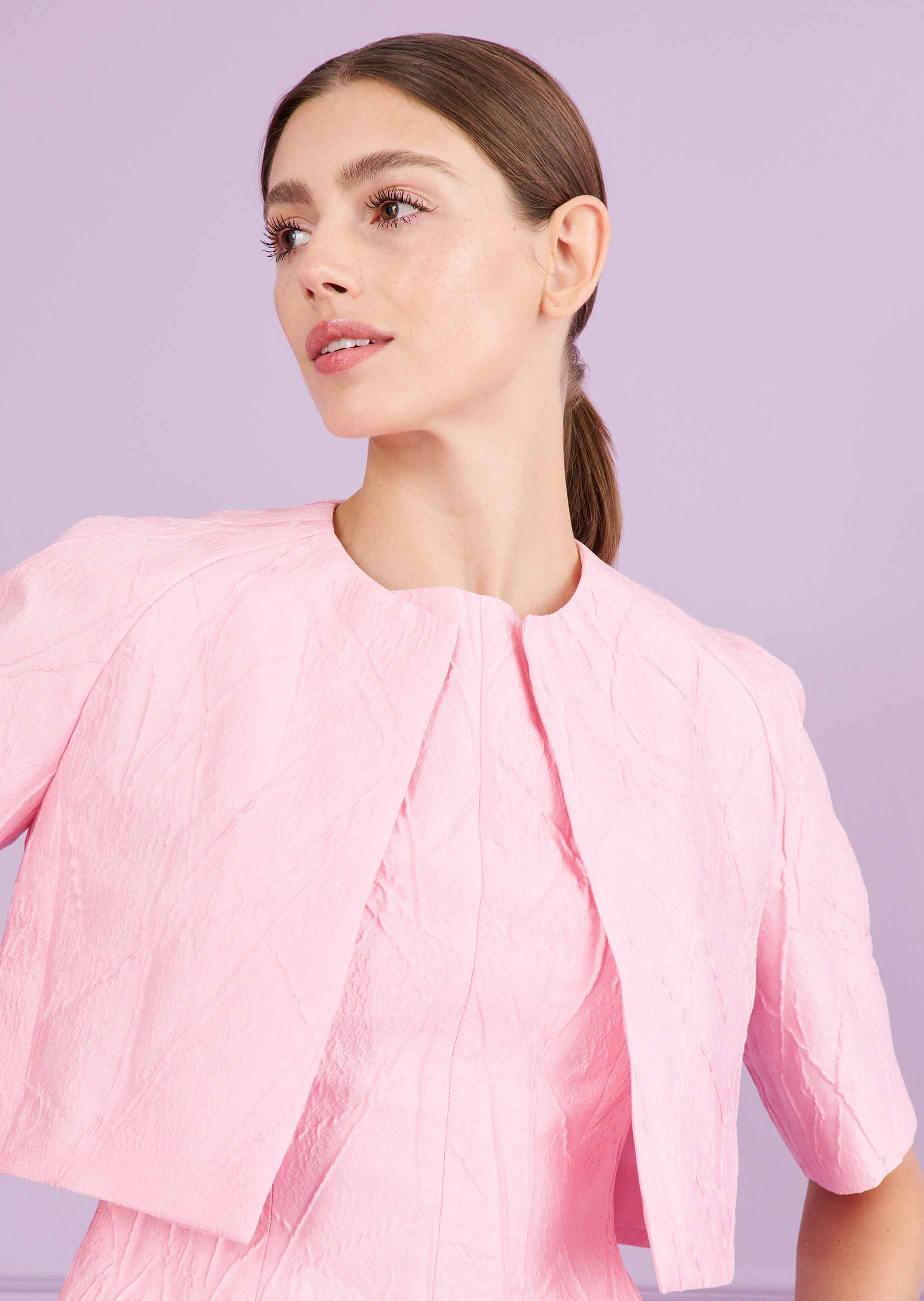 Straight and simple yet so smart: this is not just any little half-sleeve jacket. The breathtakingly beautiful fabric is so striking at first glance, while great details reveal themselves on closer inspection. Raglan sleeves give this classic jacket a sporty note. The boxy fit looks modern but not too casual when teamed with the matching cocktail dress. At the registry office, the jacket is the perfect enhancement to the matching cocktail dress by Talbot Runhof but also looks stunning teamed with more casual looks.