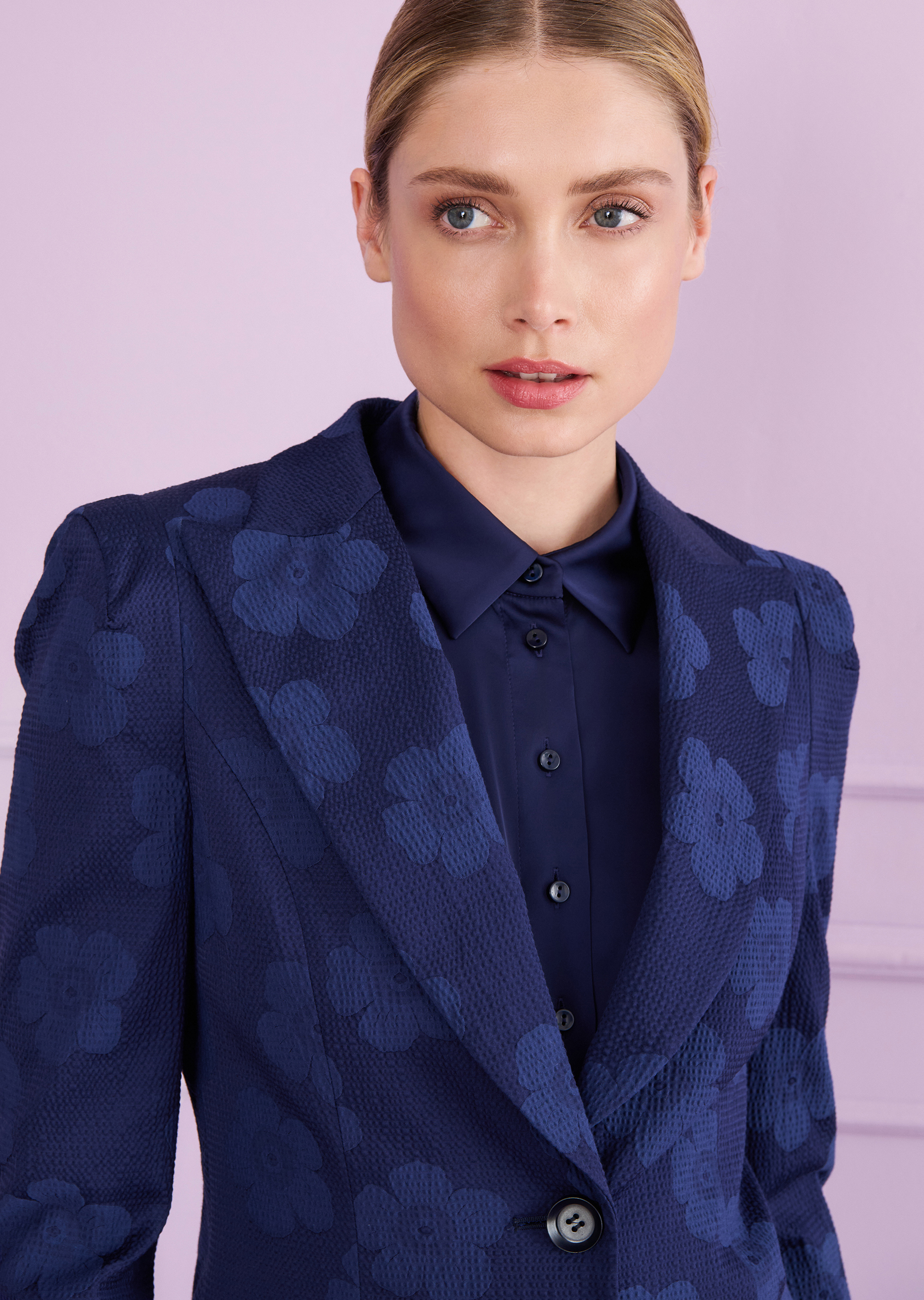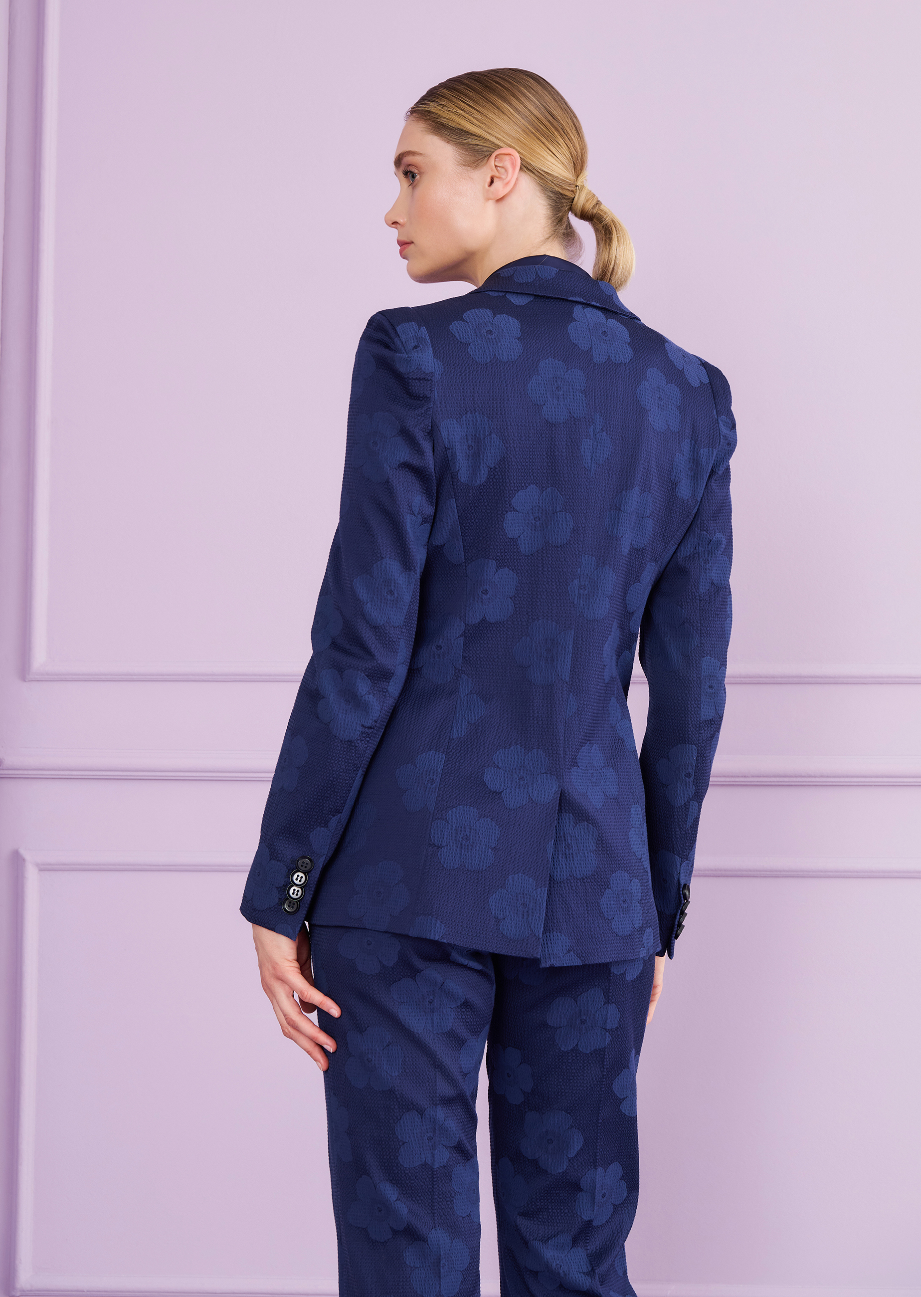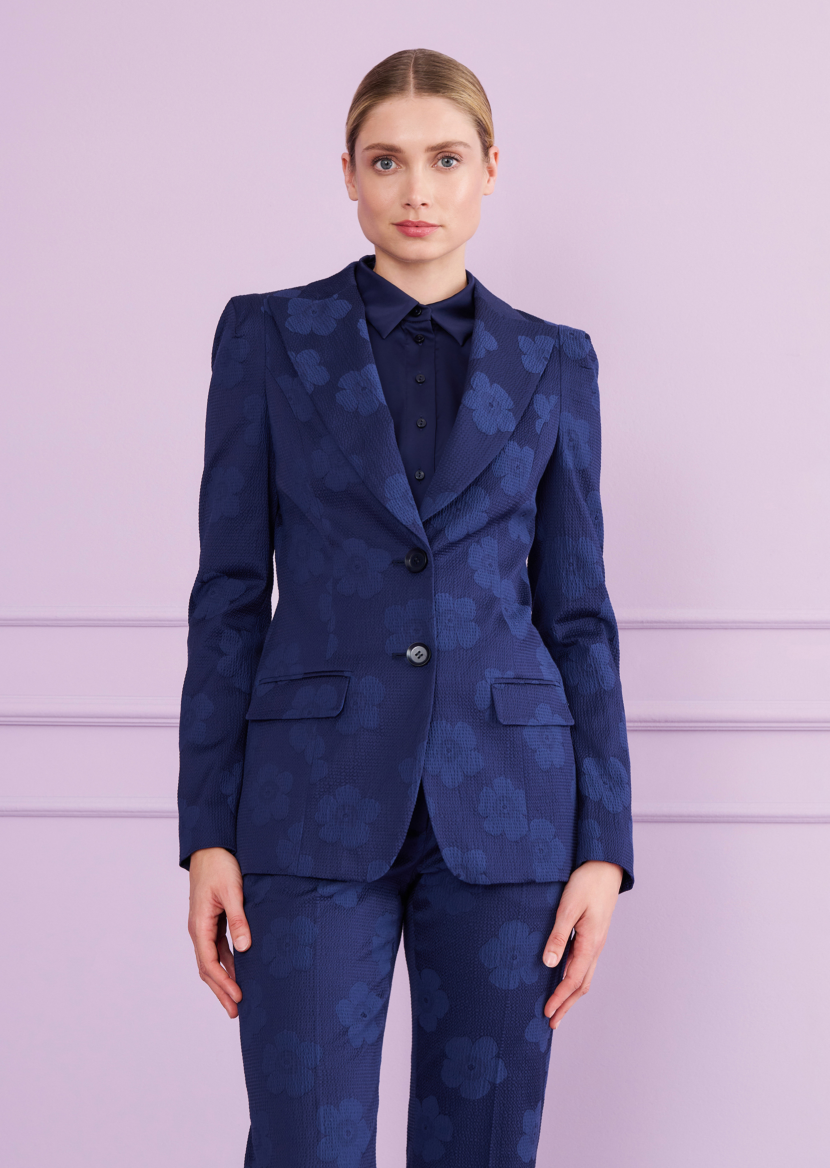 Effortless Elegance. Power dressing, but make it relaxed. This blazer blends tailored structure with soft ease, thanks to its lightweight floral jacquard. The sharp lapel and two-button front add just the right amount of polish – no fuss, no stiffness. Think: dressed-up dinners, late-night gallery visits, or a theatre date with friends. Chic, but never trying too hard. One thing’s certain: this jacket gives off quiet confidence and timeless style – wherever the evening takes you.