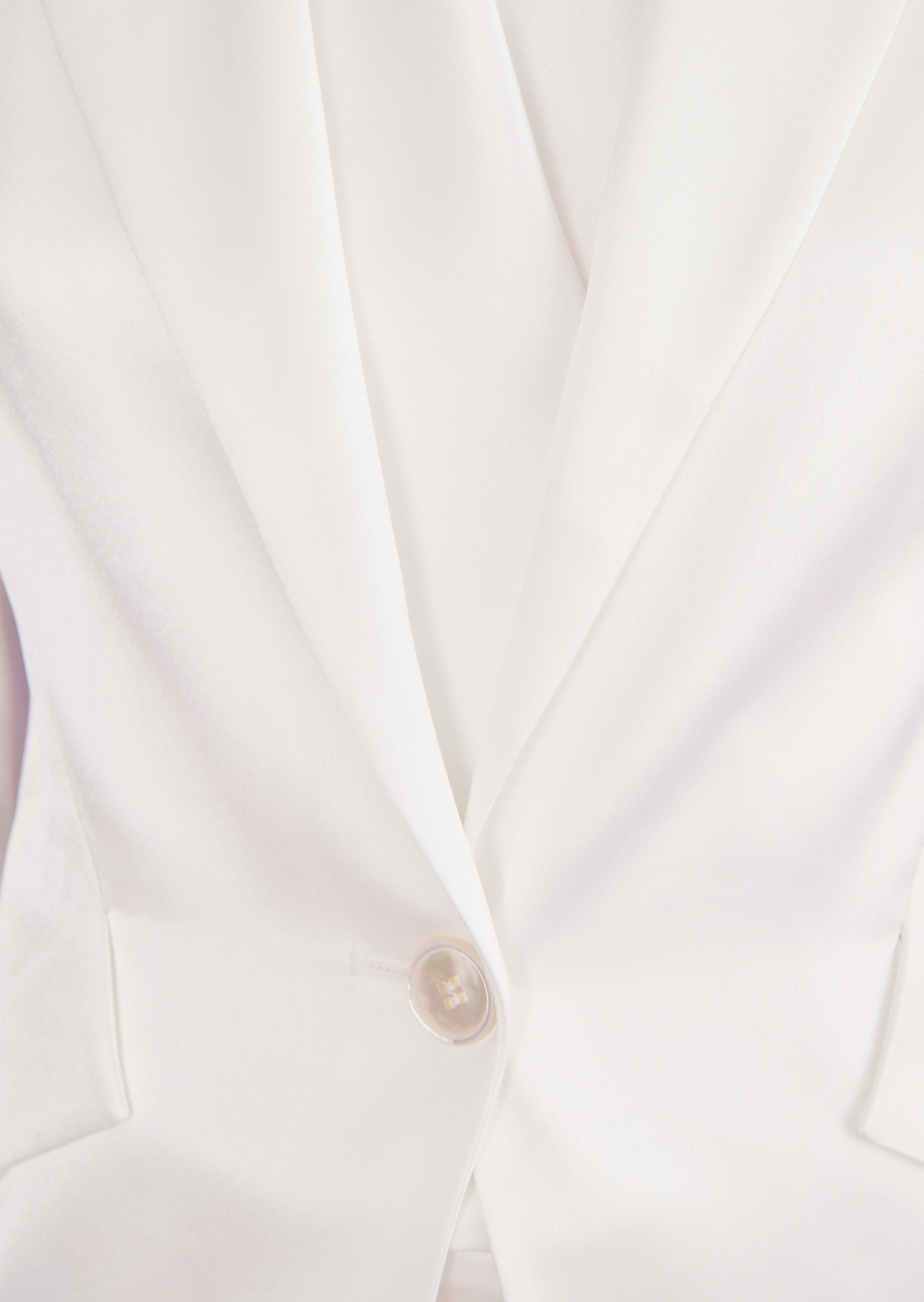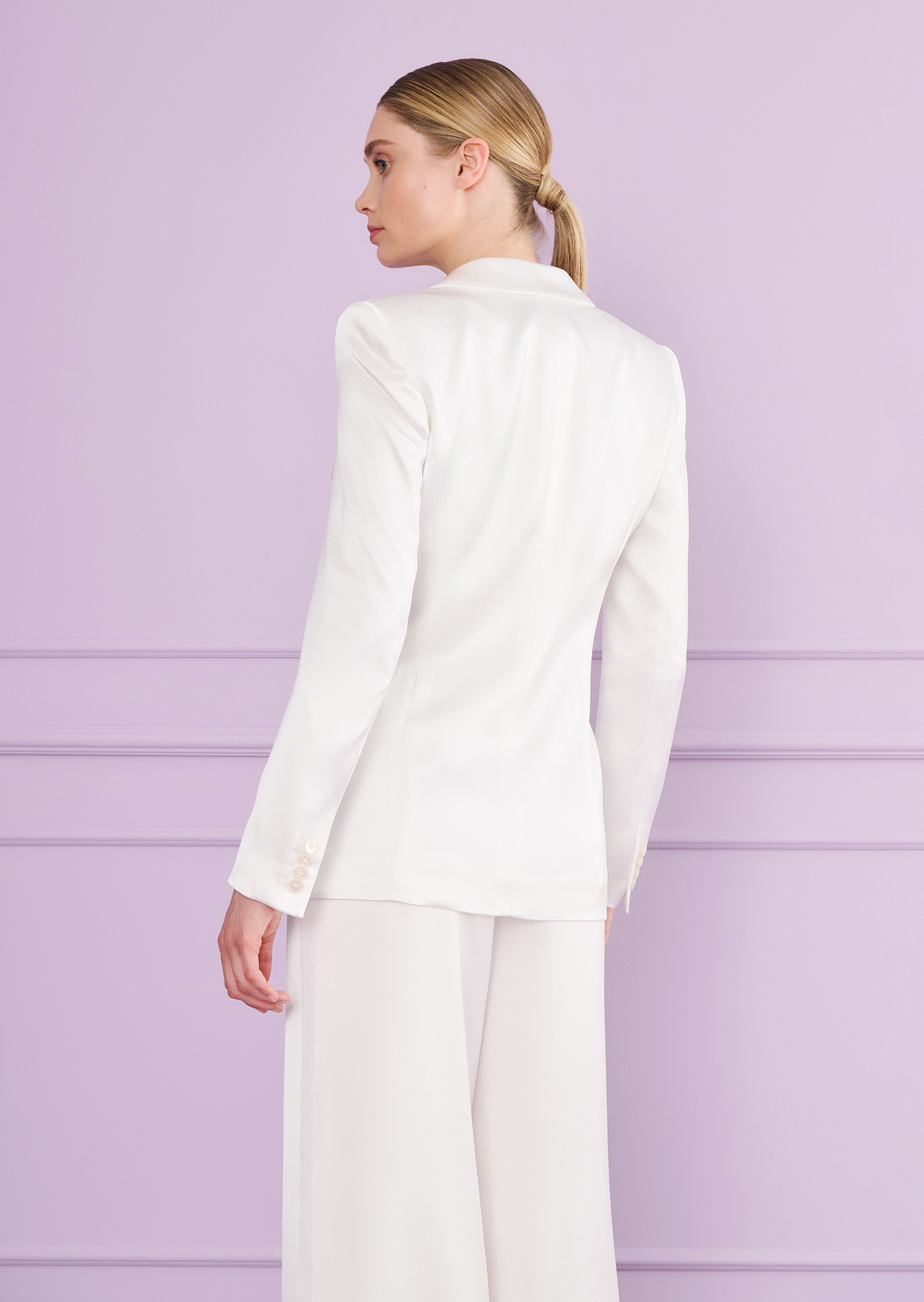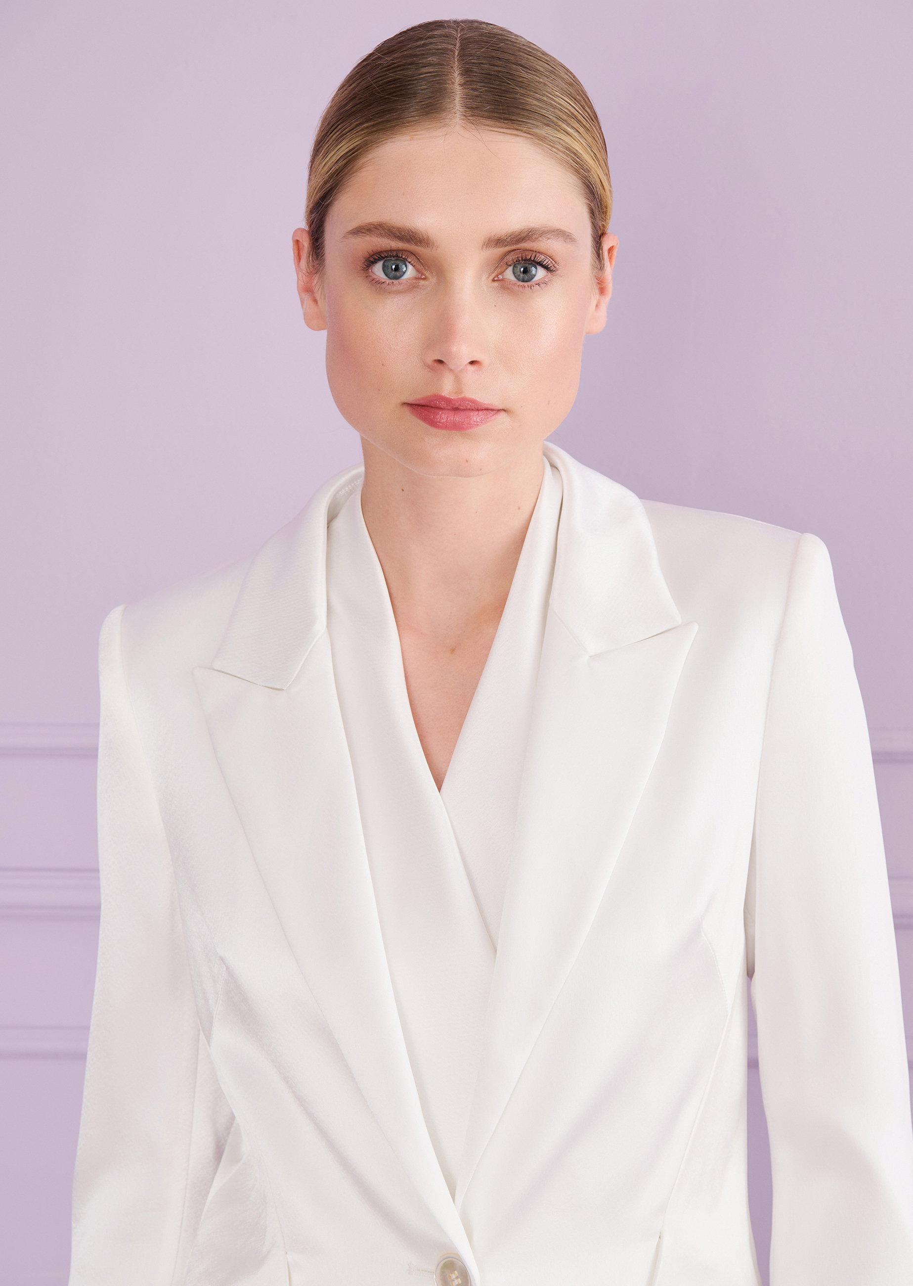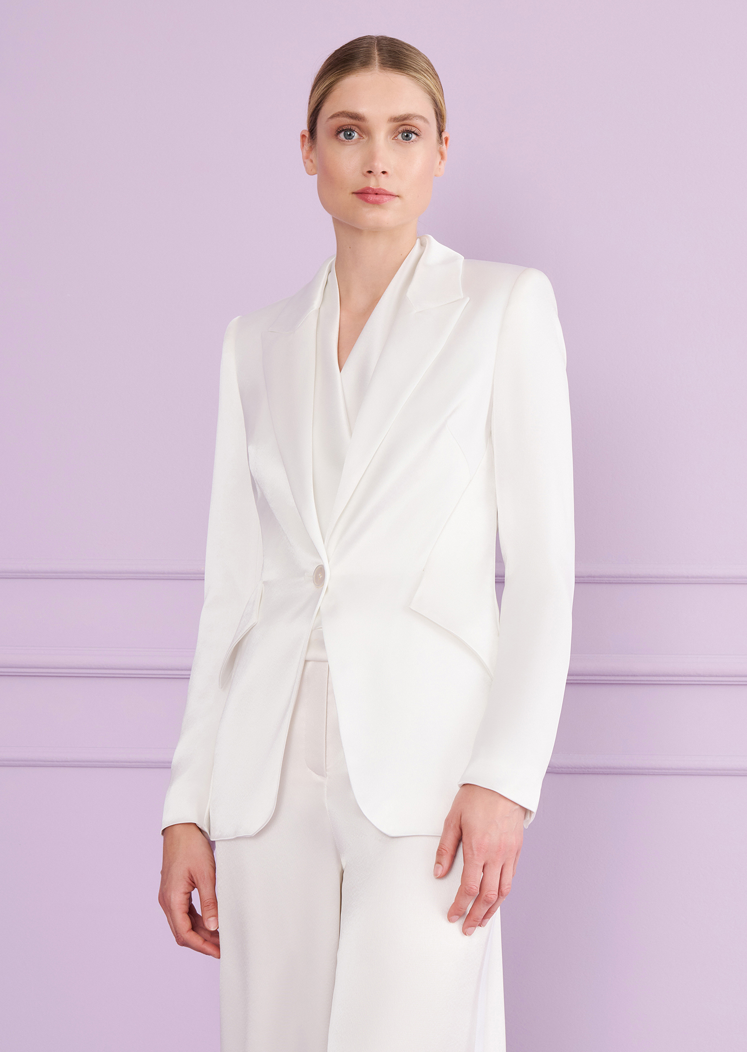 Why not swap the classic evening gown for a striking pantsuit? Simply pair this blazer with the matching wide-leg trousers from Talbot Runhof for a bold alternative. Of course, this favorite piece in shimmering crêpe satin also works beautifully by day – styled with jeans or wool trousers for an elegant contrast, or casually draped over your shoulders with a cocktail dress in the evening. However you wear it, this blazer impresses with its sharp lapels and defined waistline. A powerful look for your next theater premiere, a sponsor’s dinner, or – in this colorway – even for your civil wedding!