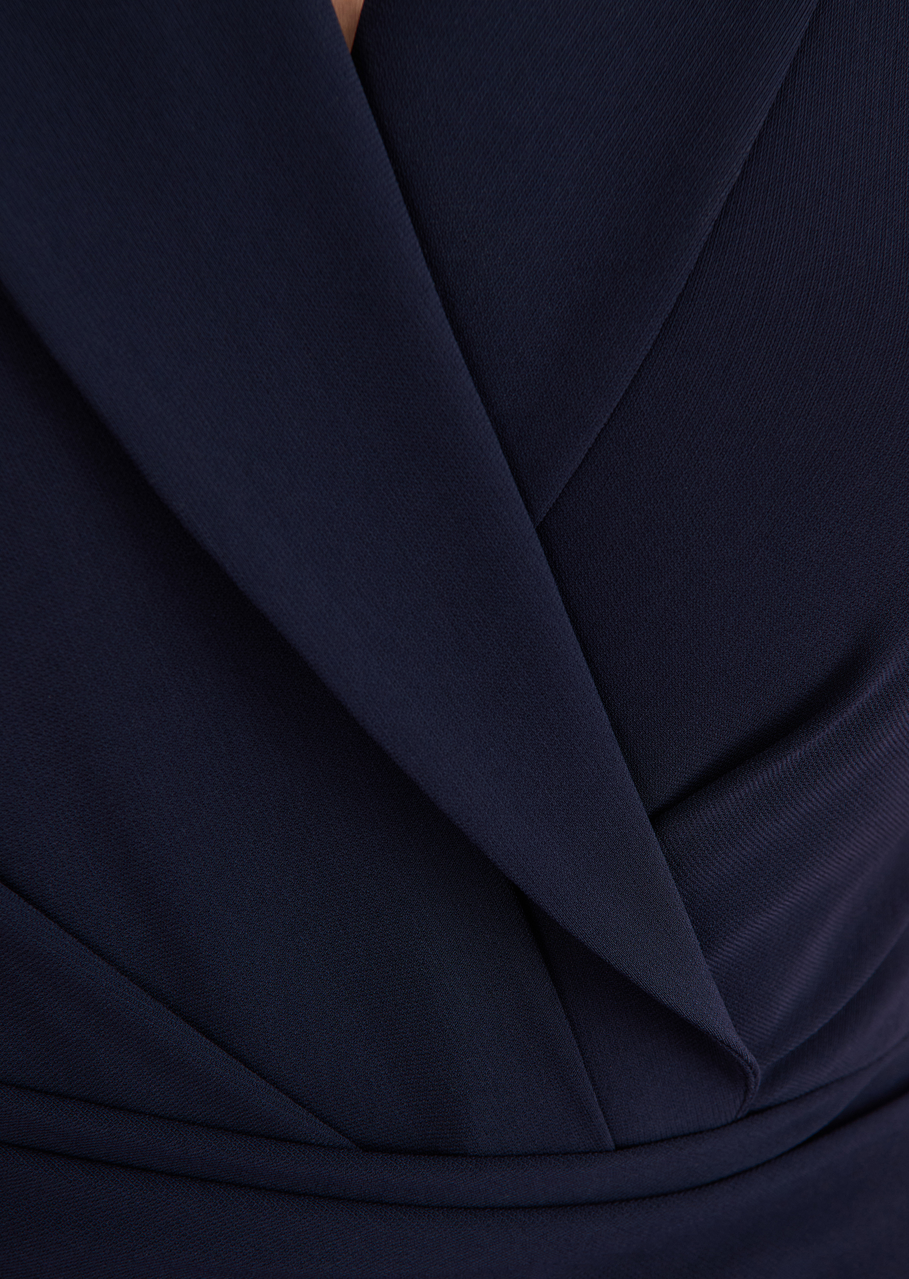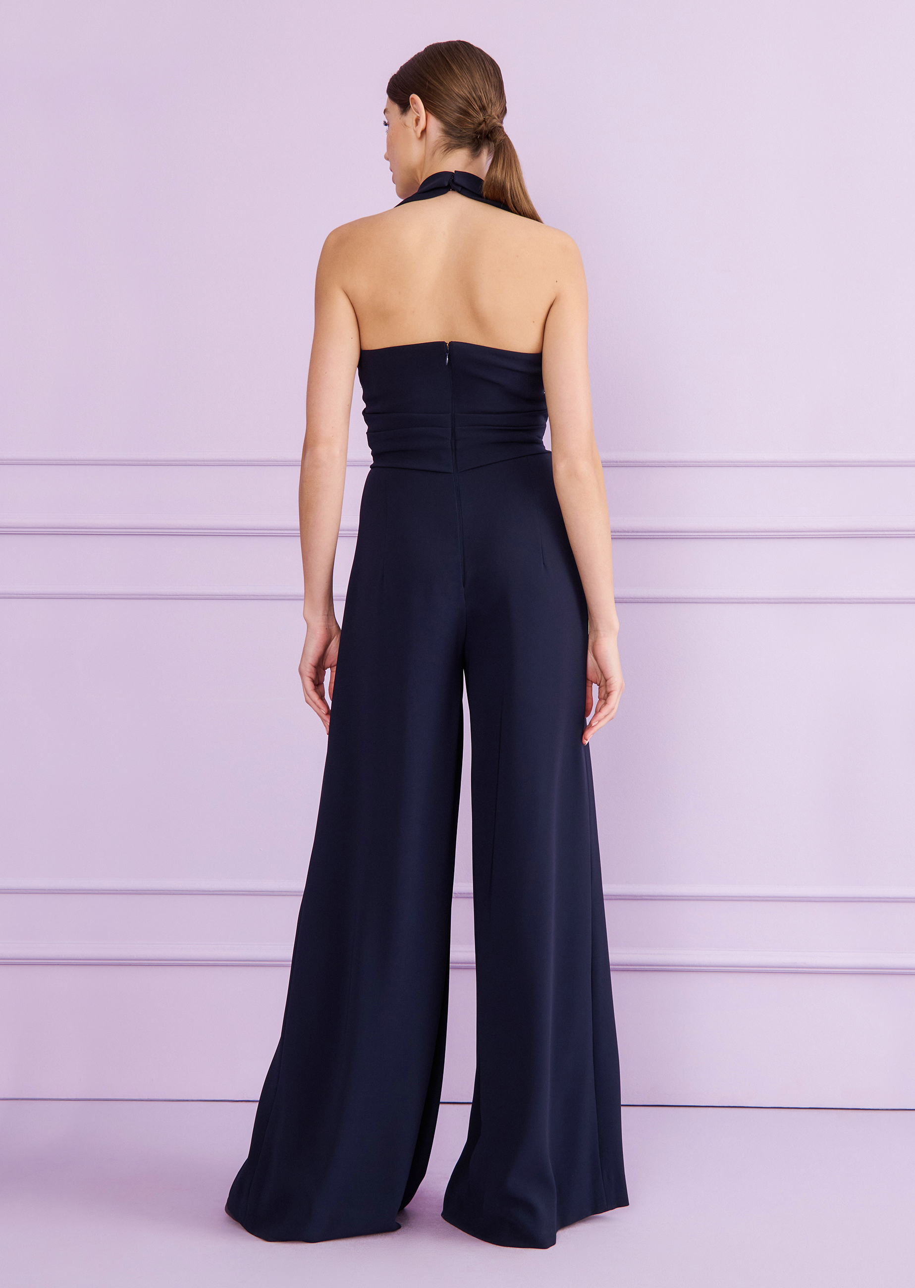 How about a hot date – with our new jumpsuit! It boasts lots of sexy details without overdoing it. It plays with subtly. Attention is drawn to the otherwise subtle décolleté by the lapel collar. The halterneck design draws attention to the shoulders, while the back remains free and is likewise accentuated nicely. Draped folds conjure up a slim waist. This makes the jumpsuit a unique, striking piece for the next red carpet or cocktail event or even for the next opera visit.