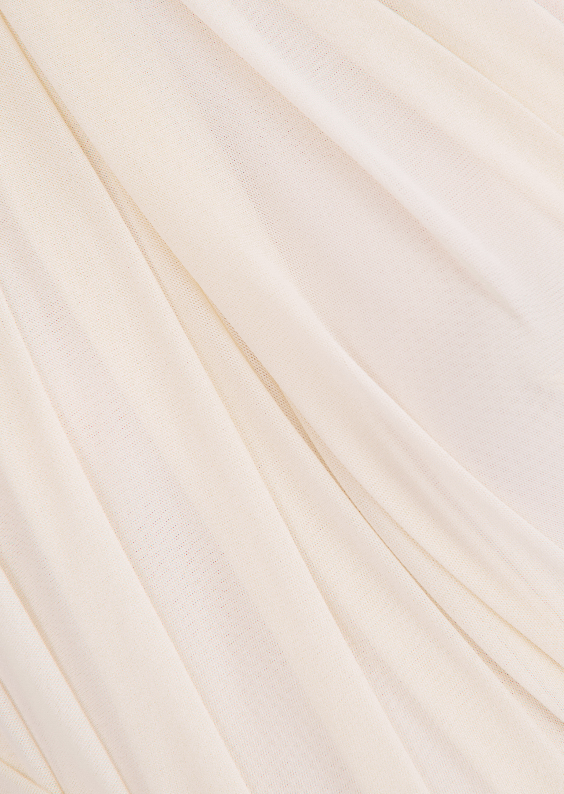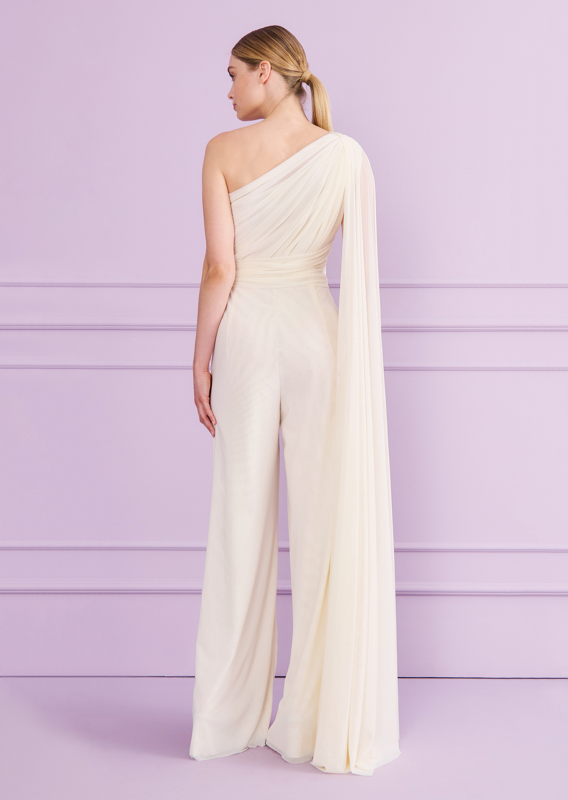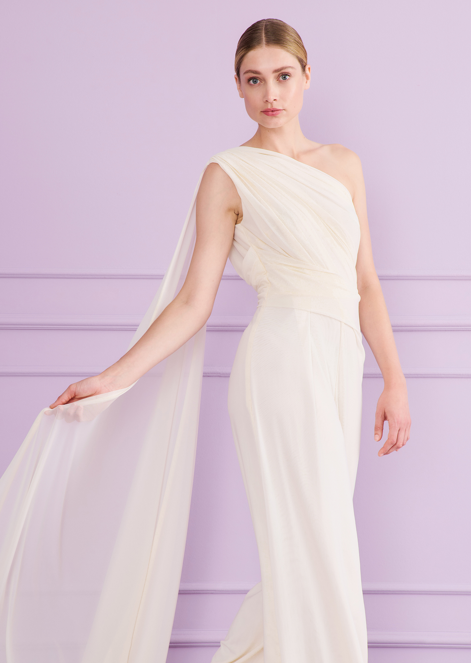 Who says you need a grand ball gown for a glamorous wedding look? Our bridal jumpsuit effortlessly delivers sophistication – with far more comfort. The one-shoulder design highlights the neckline while a flowing cape-scarf drapes gracefully over the shoulder, adding a dramatic flair. A cinched waist contrasts beautifully with the wide, feminine leg for a striking silhouette. Crafted from our signature fluid stretch tulle, it offers supreme comfort and elegant movement. A bold and modern bridal look that shines during the ceremony – and keeps the wow factor going straight through the after-party.