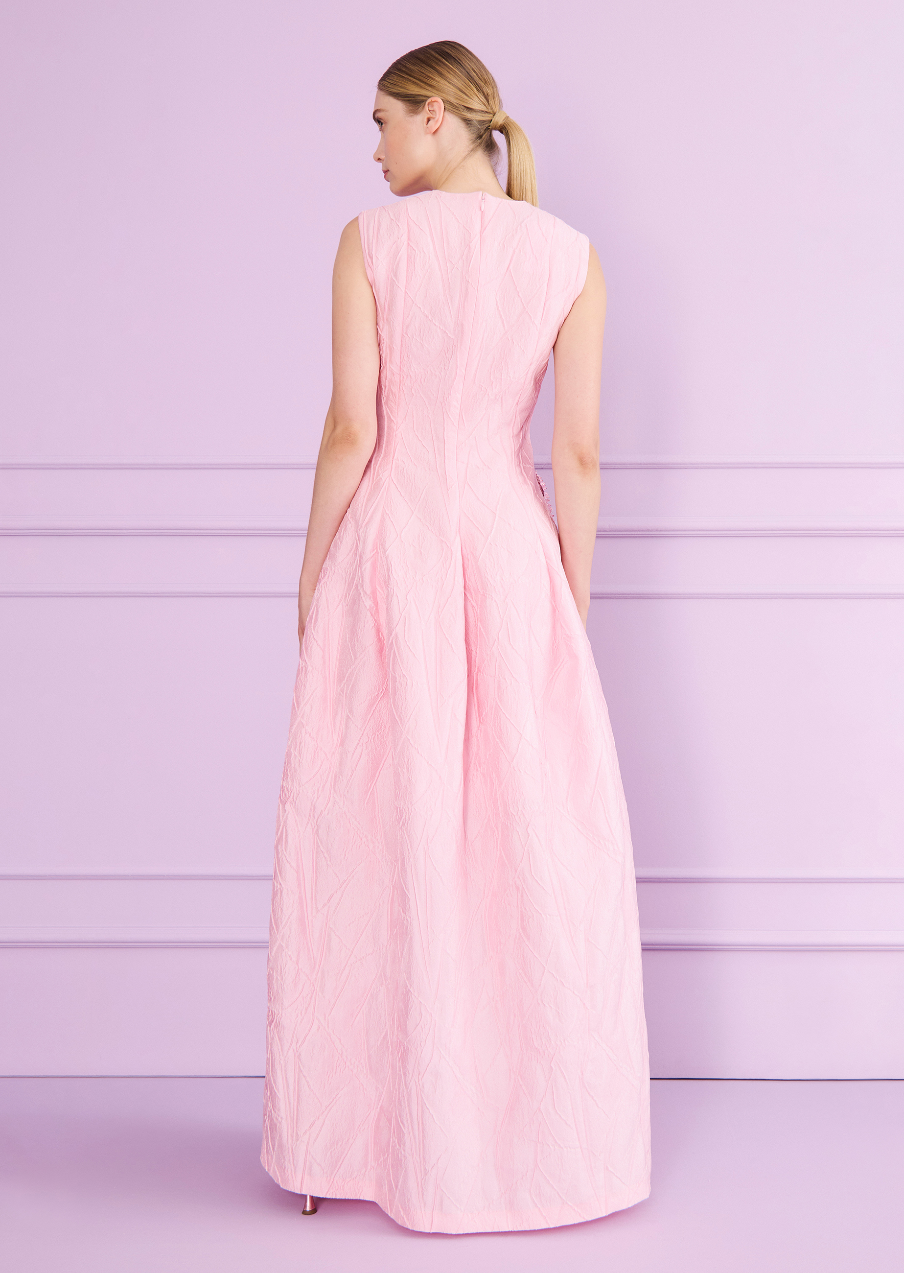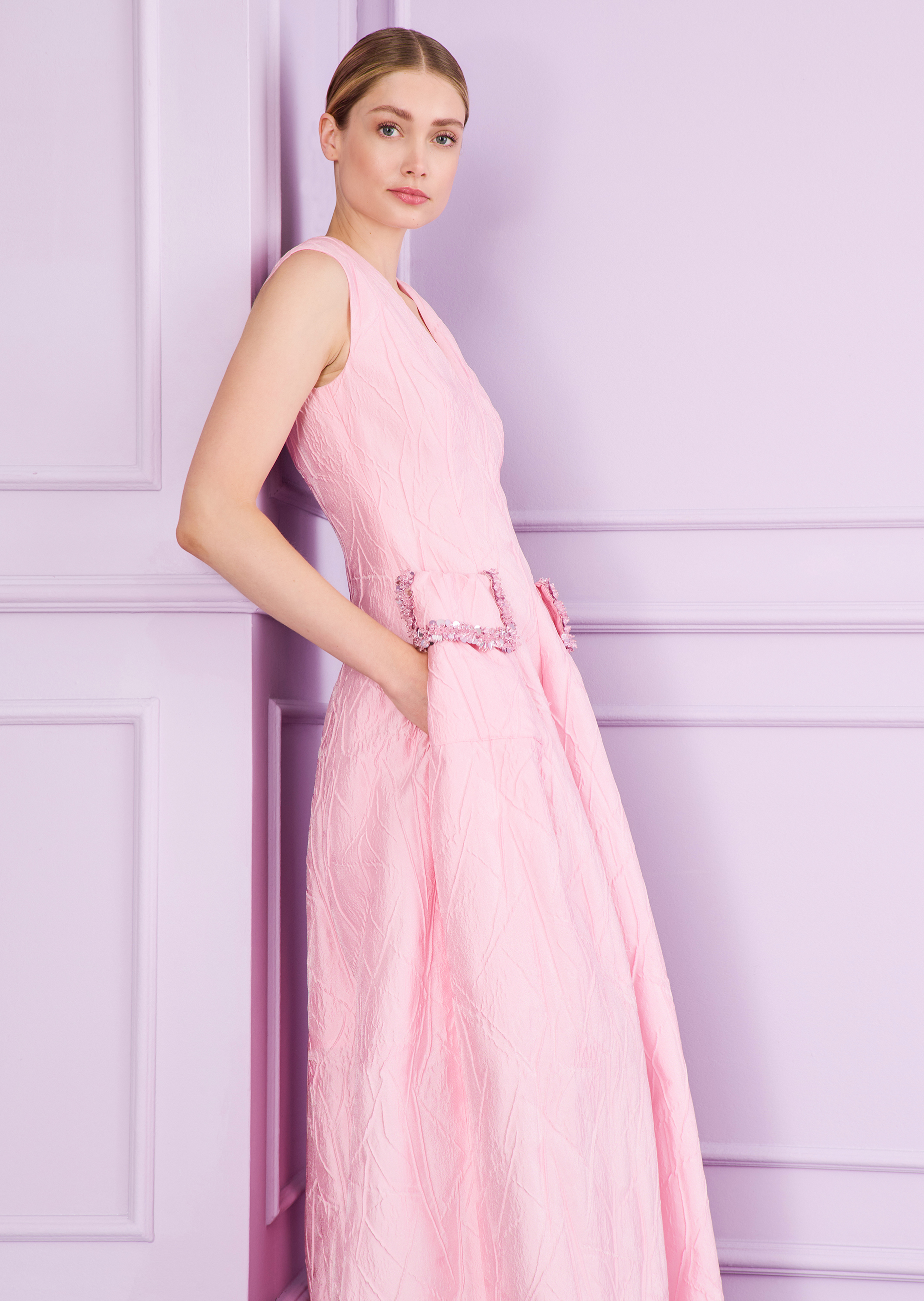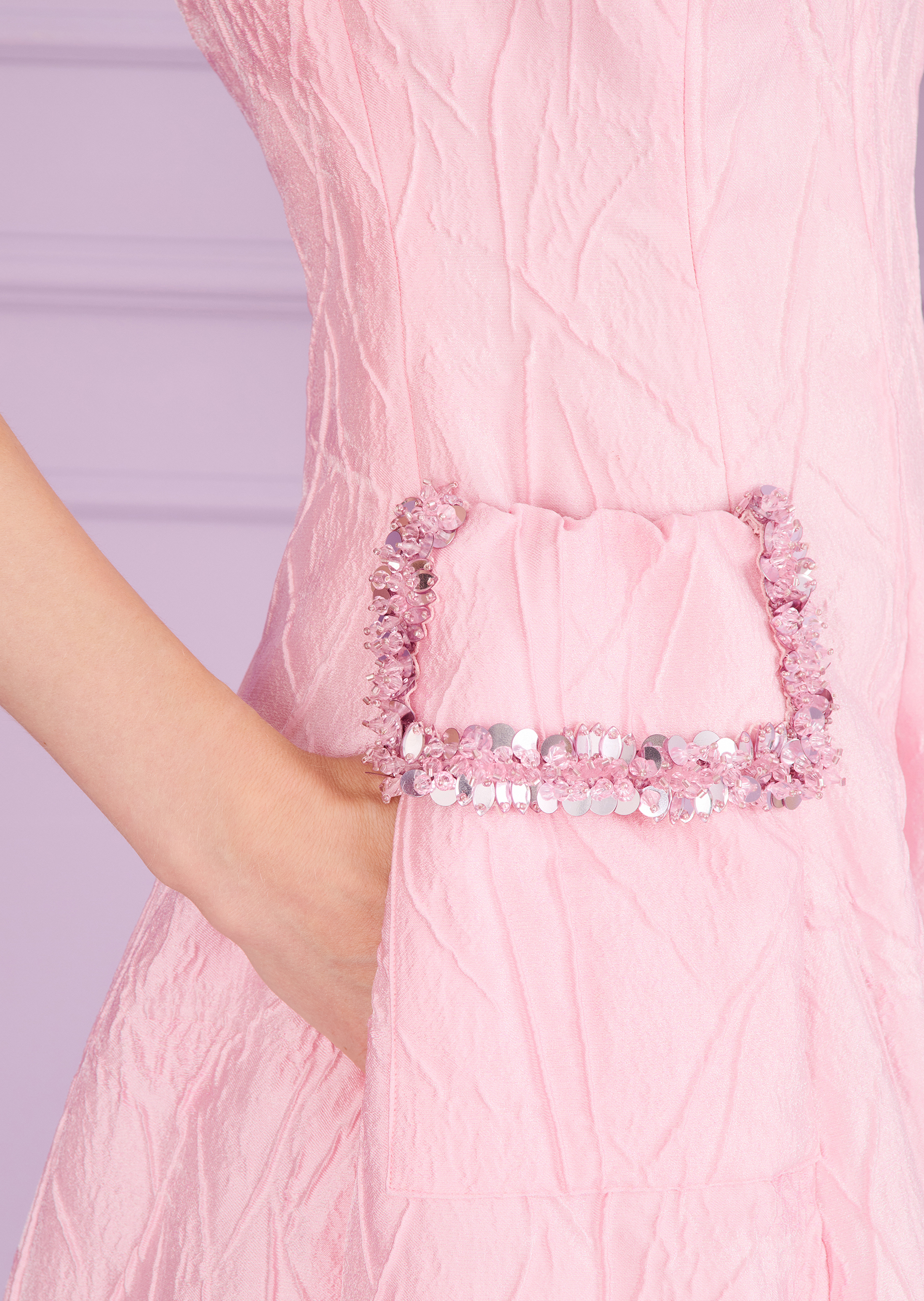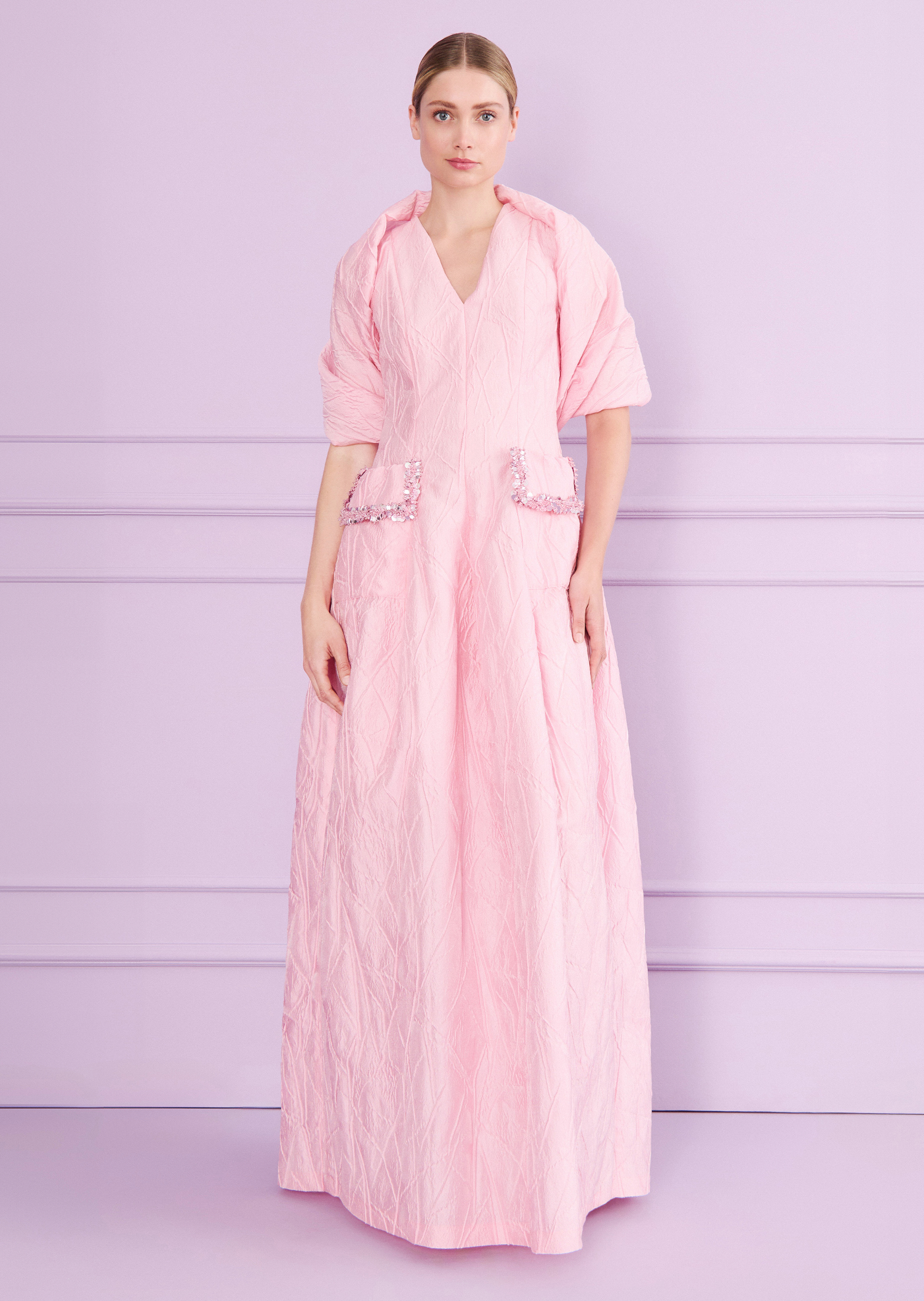 Give your favorite clutch a break. In this floor-length evening gown made from a sofly shining Mikado Jacquard, you don’t need an evening purse. With slanted side pockets, integrated pockets and patch pockets, our generous ball gown has all the space you need for your small valuables. It is the perfect design when you want to keep your hands free for a glass of champagne or your sweetheart’s arm on the dance floor. The loosely swinging skirt is also ideal for a smoking party.