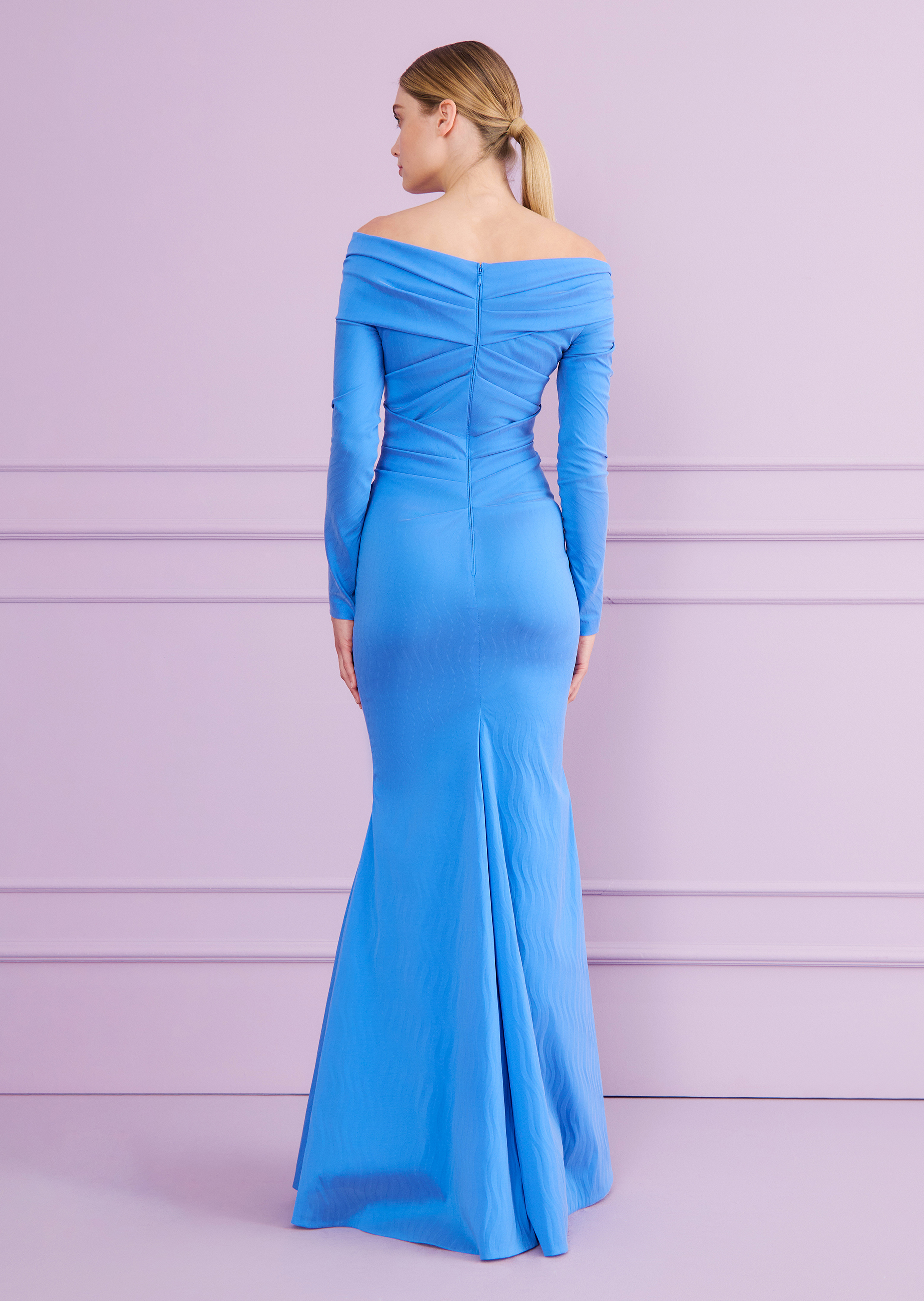 Behaving like a diva? That’s not your style! You prefer to express your inner diva through fashion with an exciting, glamorous look. This floor length evening gown helps you do just that. We made it out of an unbelievably comfortable stretch taffeta fabric. This fabric has a beautiful subtle shine and is also very comfortable to wear. The cut is quite something, too. The asymmetric drape on the upper body accentuates the shoulders, while additional draping makes the waist appear slimmer. Long sleeves boost your self-confidence. Plus, the fishtail skirt accentuates the feminine silhouette. All this makes this evening gown a perfect piece for the red carpet, an opera premiere or a formal dinner.