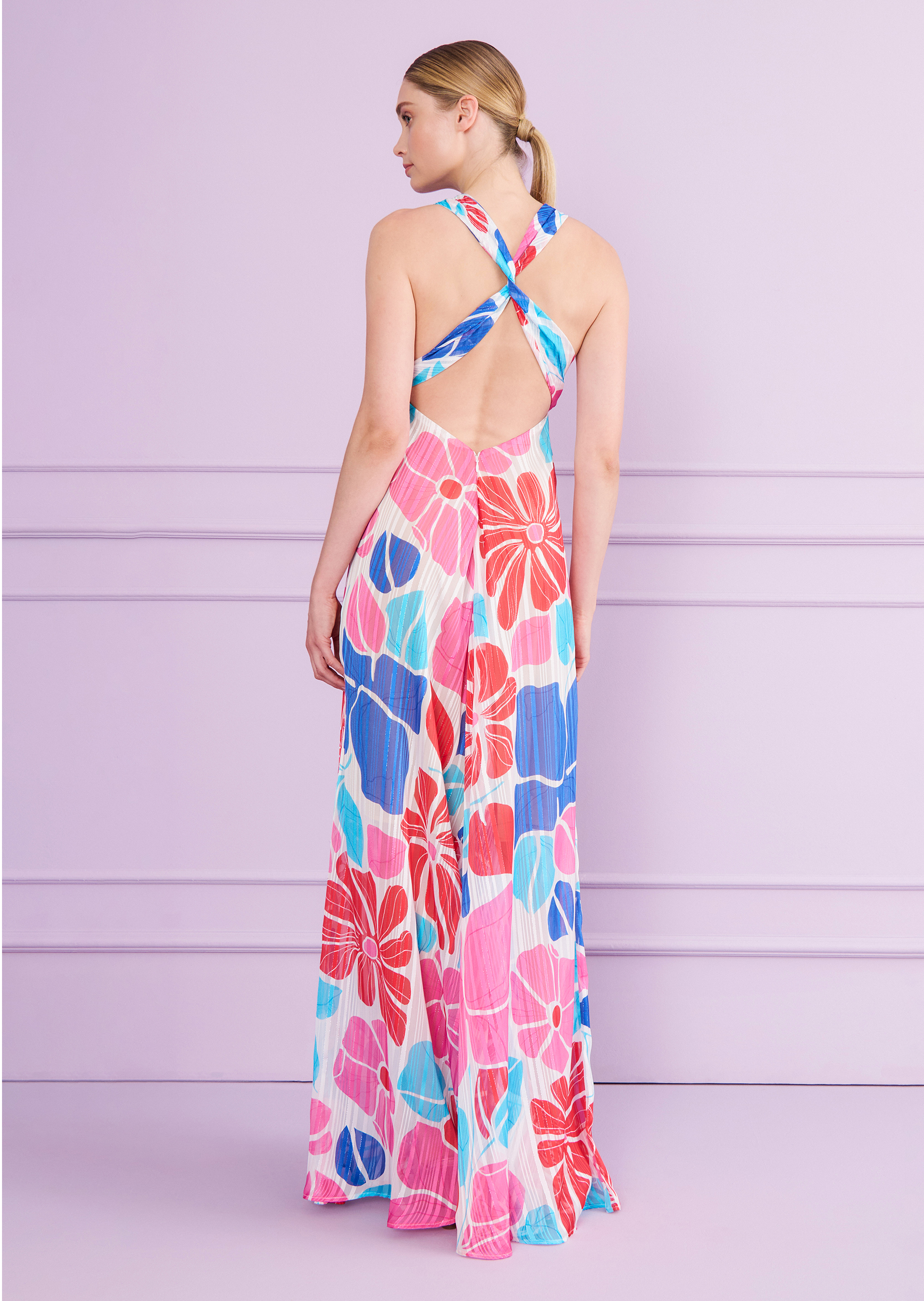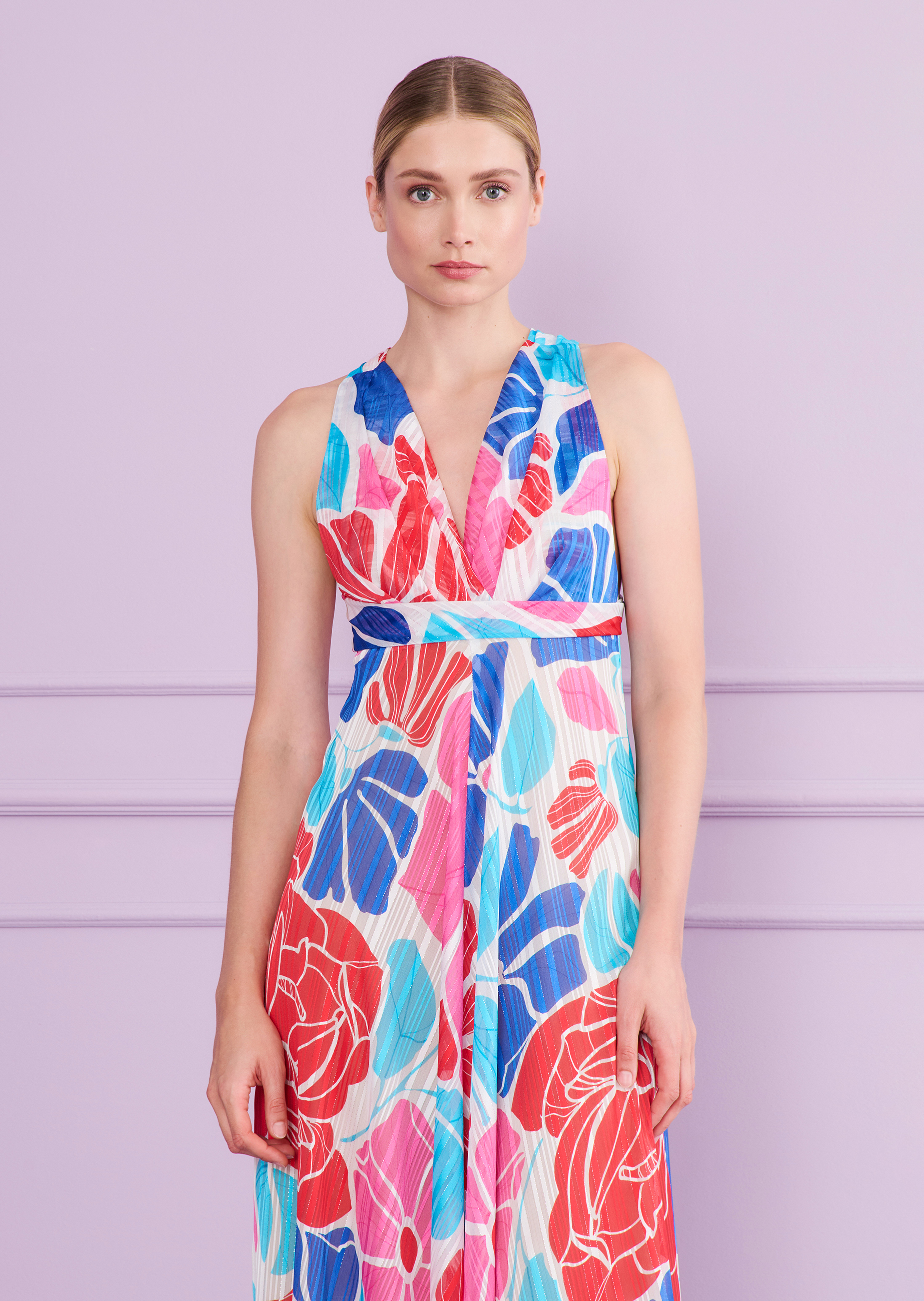Light, breezy, and full of understated glamour – this new evening dress was made for unforgettable summer nights where the only rule is: celebrate life. Its silhouette radiates relaxed sophistication, with a softly cinched waist and artfully knotted straps that frame an open back in the most elegant way. The fabric, a floral-printed Pékin with subtle metallic threads, glows beautifully in the golden evening light. And the full, flowing skirt? Pure magic on the dance floor. Whether you're heading to a dreamy island wedding or an outdoor art event under the stars – this dress fits the moment. Pair it with flat metallic sandals for a look that’s as refined as it is easygoing – and ready to shine well into the night.