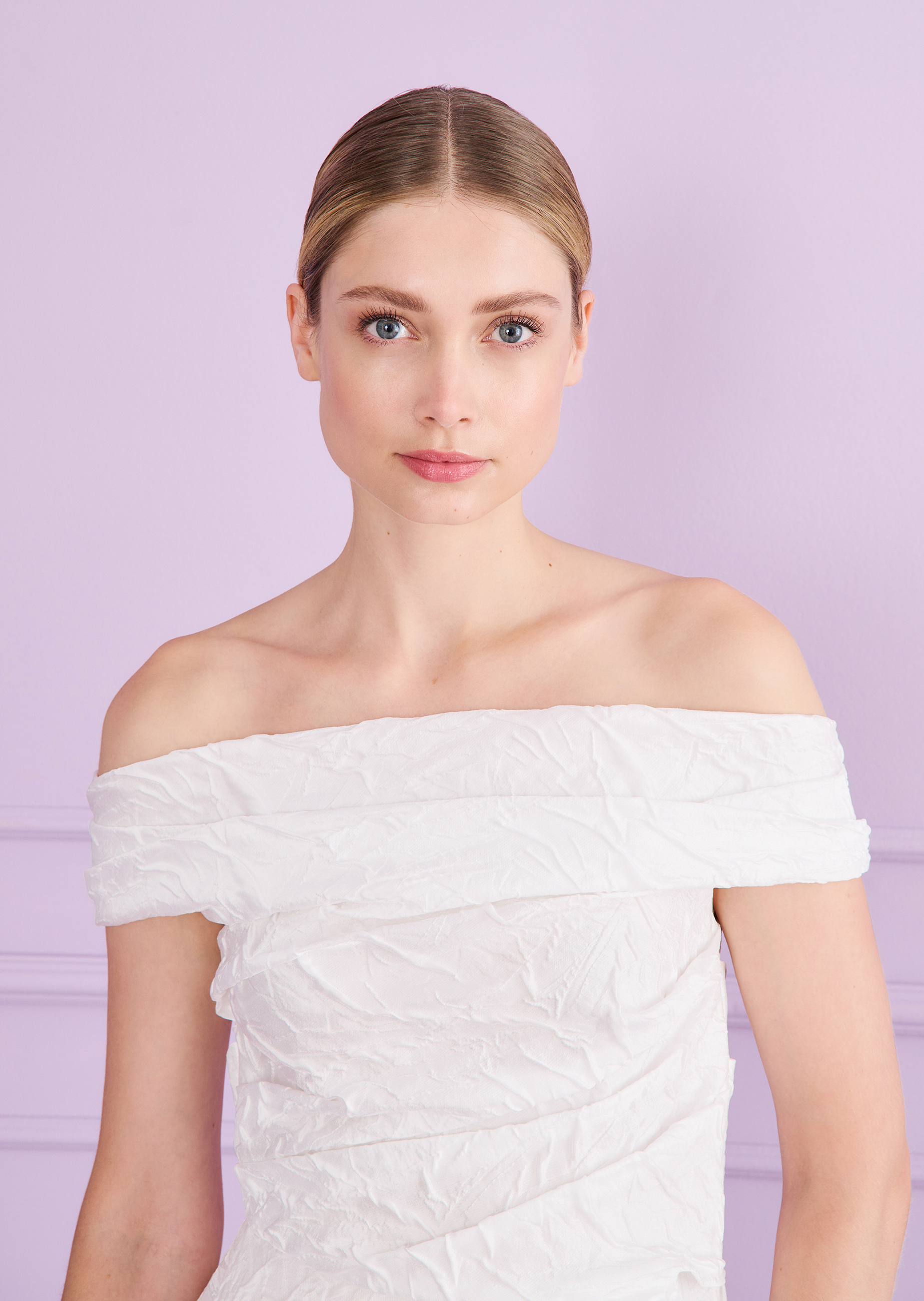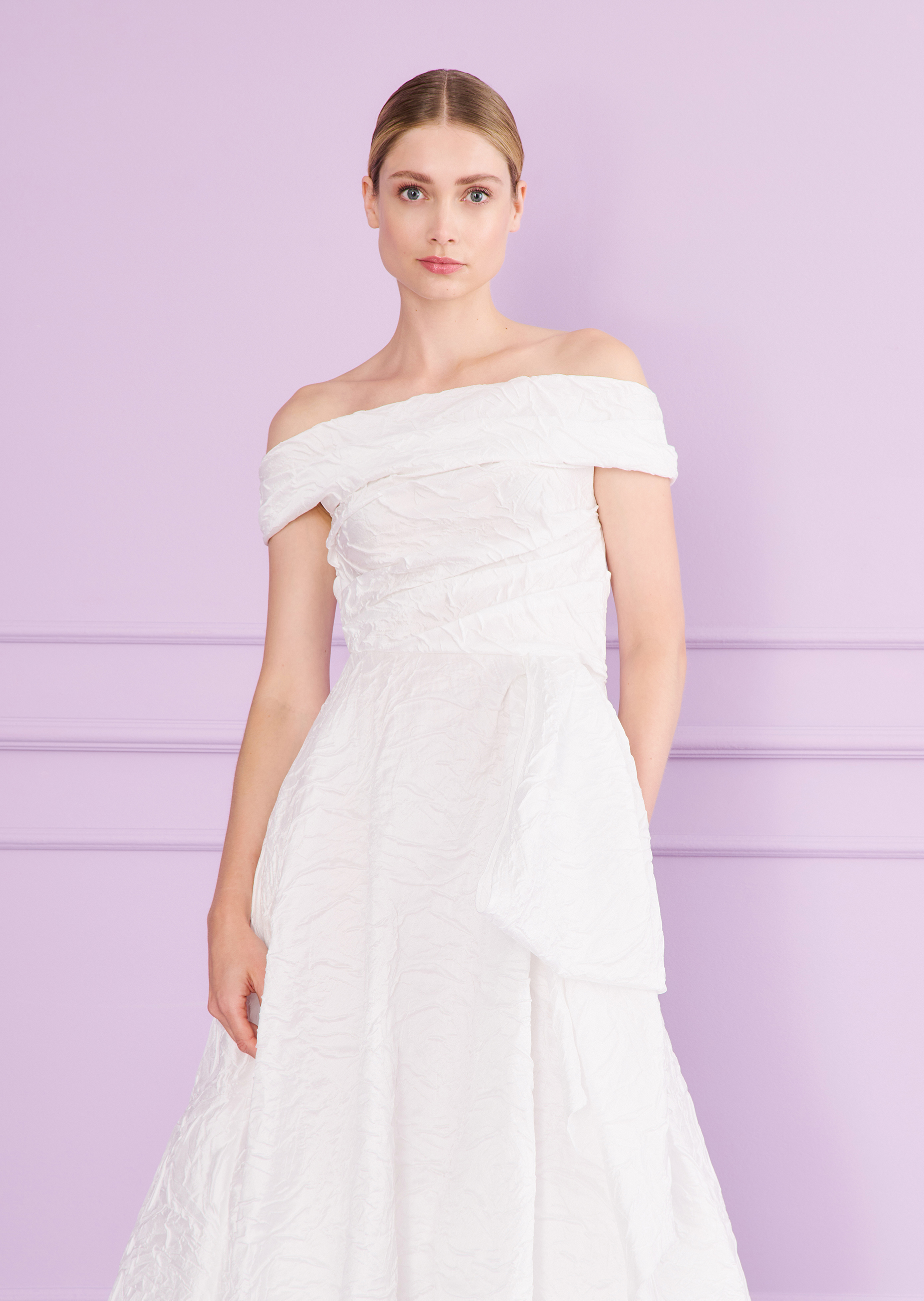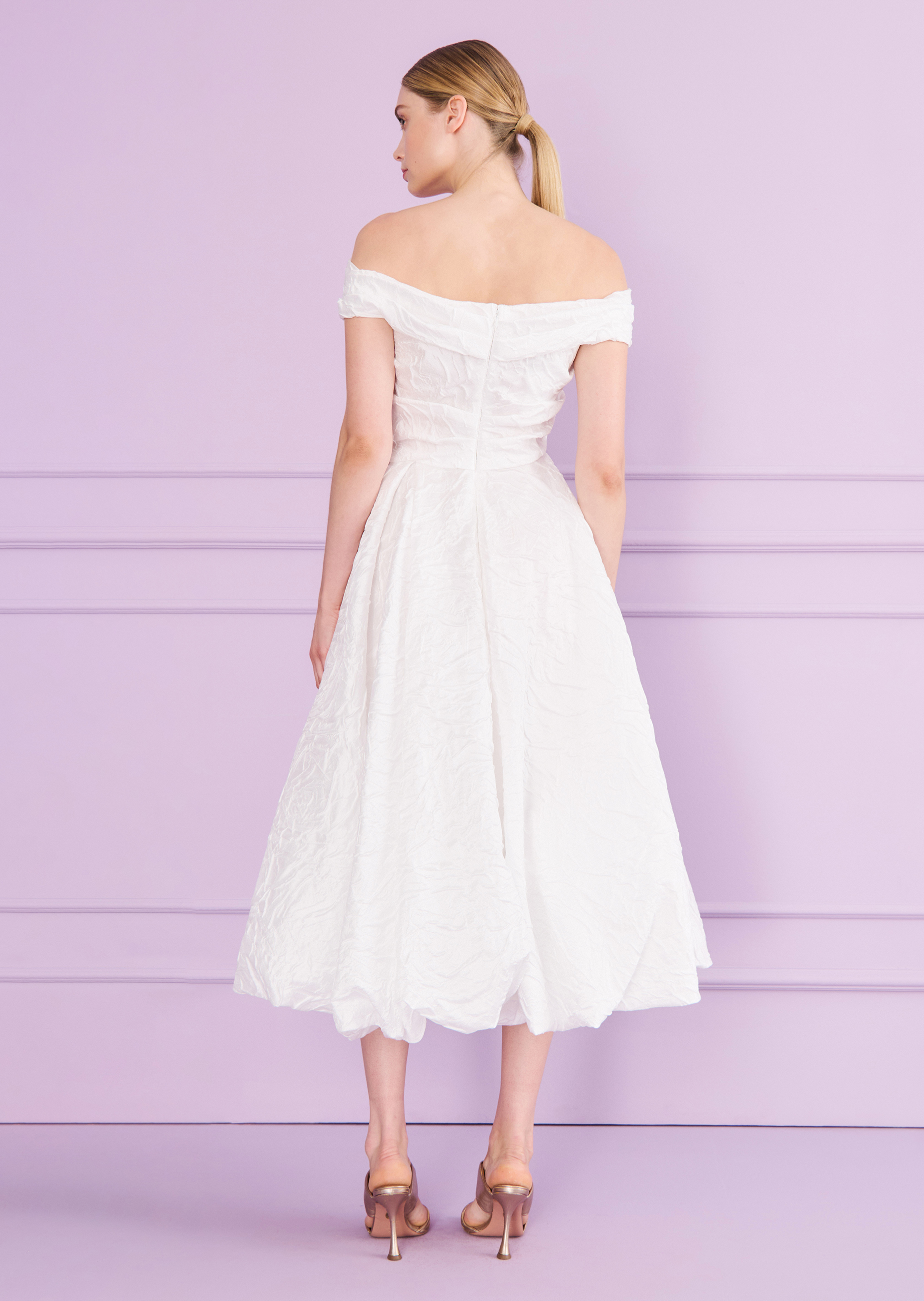 Up, up and away! On your special day, you’ll be floating on cloud nine – and this elegant midi dress will take you there. Its balloon skirt enchants with airy volume, a light touch, and a modern twist. The off-the-shoulder neckline beautifully frames your shoulders, adding a feminine flair, while artful draping at the waist flatters your figure in all the right ways. Made from a flowing, radiant jacquard with a delicate floral design, this dress practically whispers of something dreamy and divine. So – ready to head to the registry office and lift off into love?